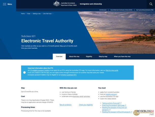 2. Electronic Travel Authority (ETA, Unterklasse 601):