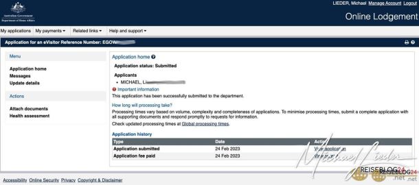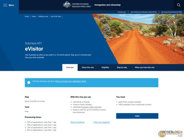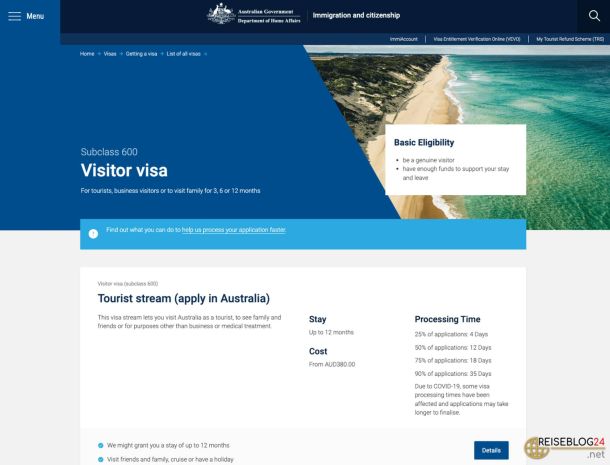 Kosten: Es gibt keine Visa Application Charge (VAC). Es kann eine Bearbeitungsgebühr von AUD 20 erhoben werden.