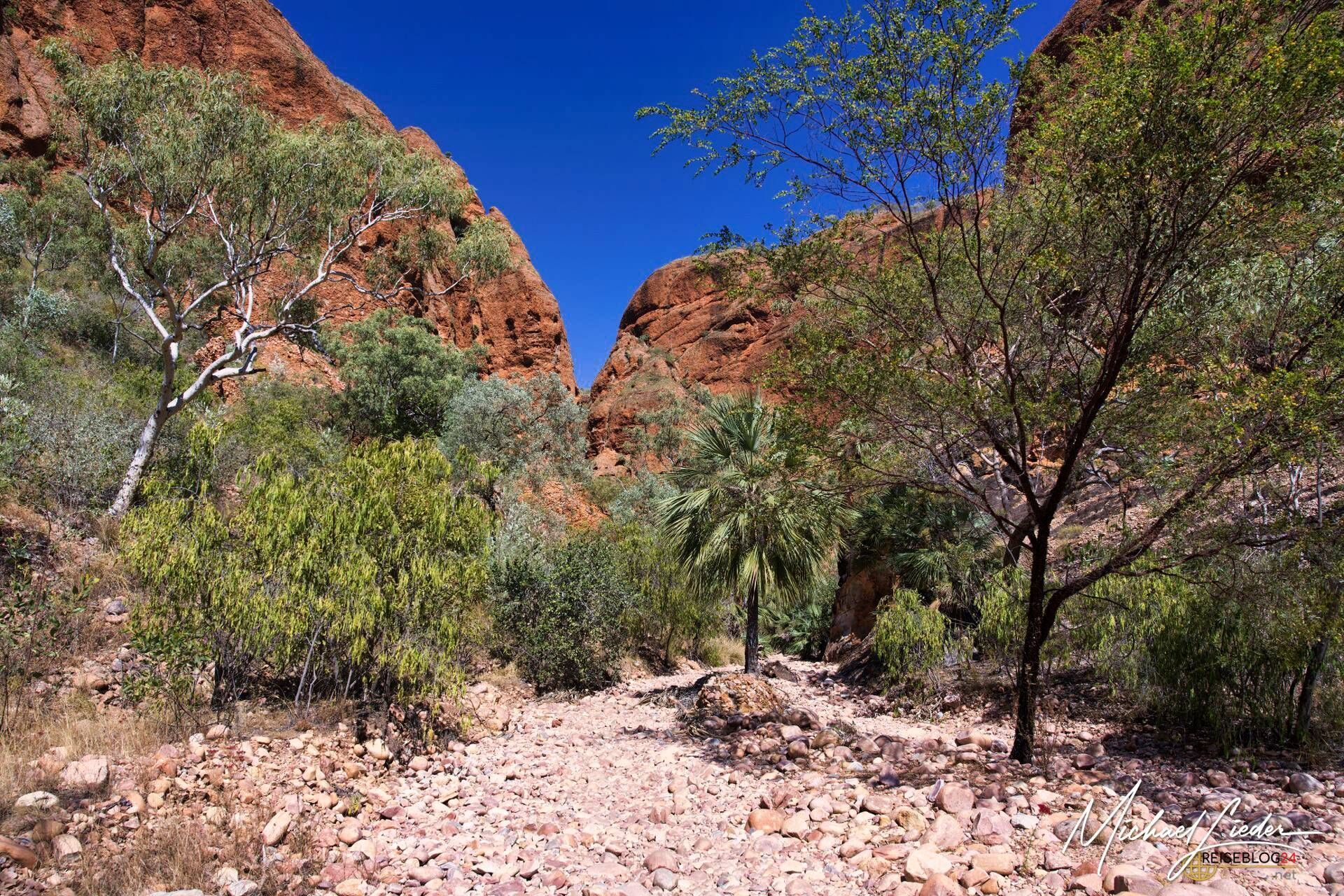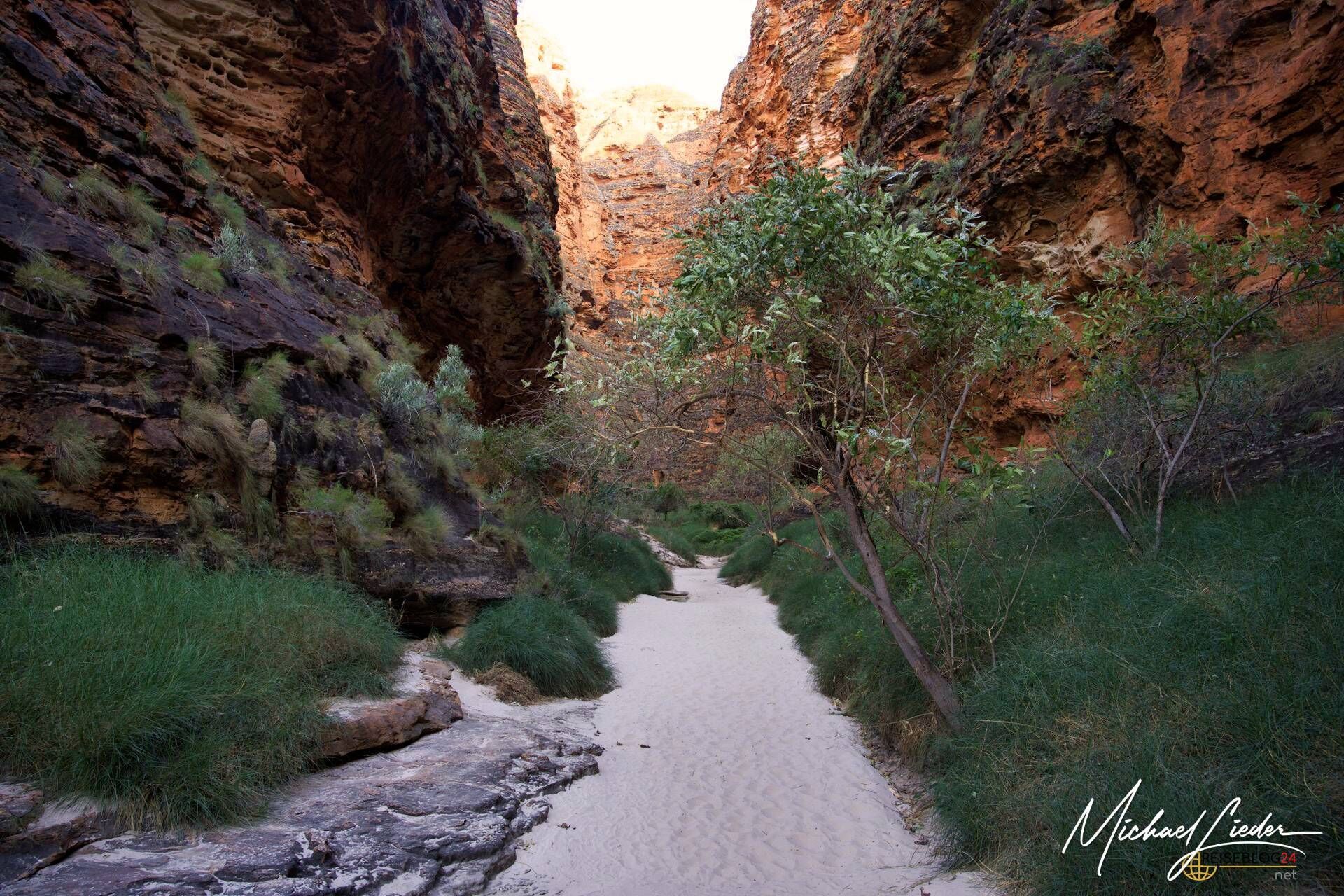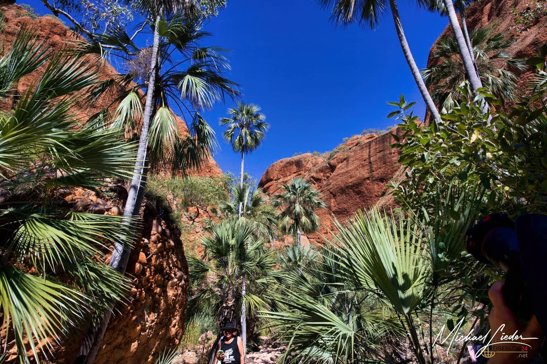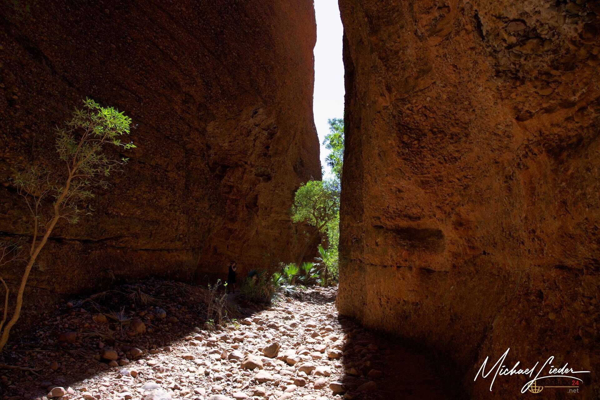 Schon die Fahrt durch den Nationalpark war eine Reise für sich. Die Straße schlängelte sich durch eine sich ständig verändernde Landschaft, von roten Wüstenebenen bis zu beeindruckenden Felsformationen. Unser erstes Ziel war der Echidna Chasm. Der Weg dorthin führte durch eine enge Schlucht, flankiert von hohen Felswänden, die in den unterschiedlichsten Rottönen schimmerten. Das Spiel aus Licht und Schatten erzeugte eine magische Atmosphäre, die uns in ihren Bann zog. Die Wanderung war zwar herausfordernd, aber die Aussicht auf das, was einen erwartete, trieb uns voran. Und dann war er da, der Echidna Chasm! Ein schmaler Spalt zwischen den Felsen, der sich immer weiter verengte, je tiefer wir vordrangen. Das Sonnenlicht fiel durch die schmale Öffnung und zauberte leuchtende Muster auf die glatten Wände. Ich konnte kaum glauben, wie die Natur es geschafft hatte, ein solch faszinierendes Kunstwerk zu erschaffen. Es fühlte sich an, als würden wir durch einen geheimen Gang zu den tiefen Schluchten der Erde wandern. Nachdem wir den Echidna Chasm erkundet hatte, machten wir uns auf den Weg zur Cathedral Gorge. Die Vorfreude stieg, ohne dass der Name mich enttäuschte. Der Weg führte durch einen trockenen Flusslauf, vorbei an beeindruckenden Felswänden und üppiger Vegetation.