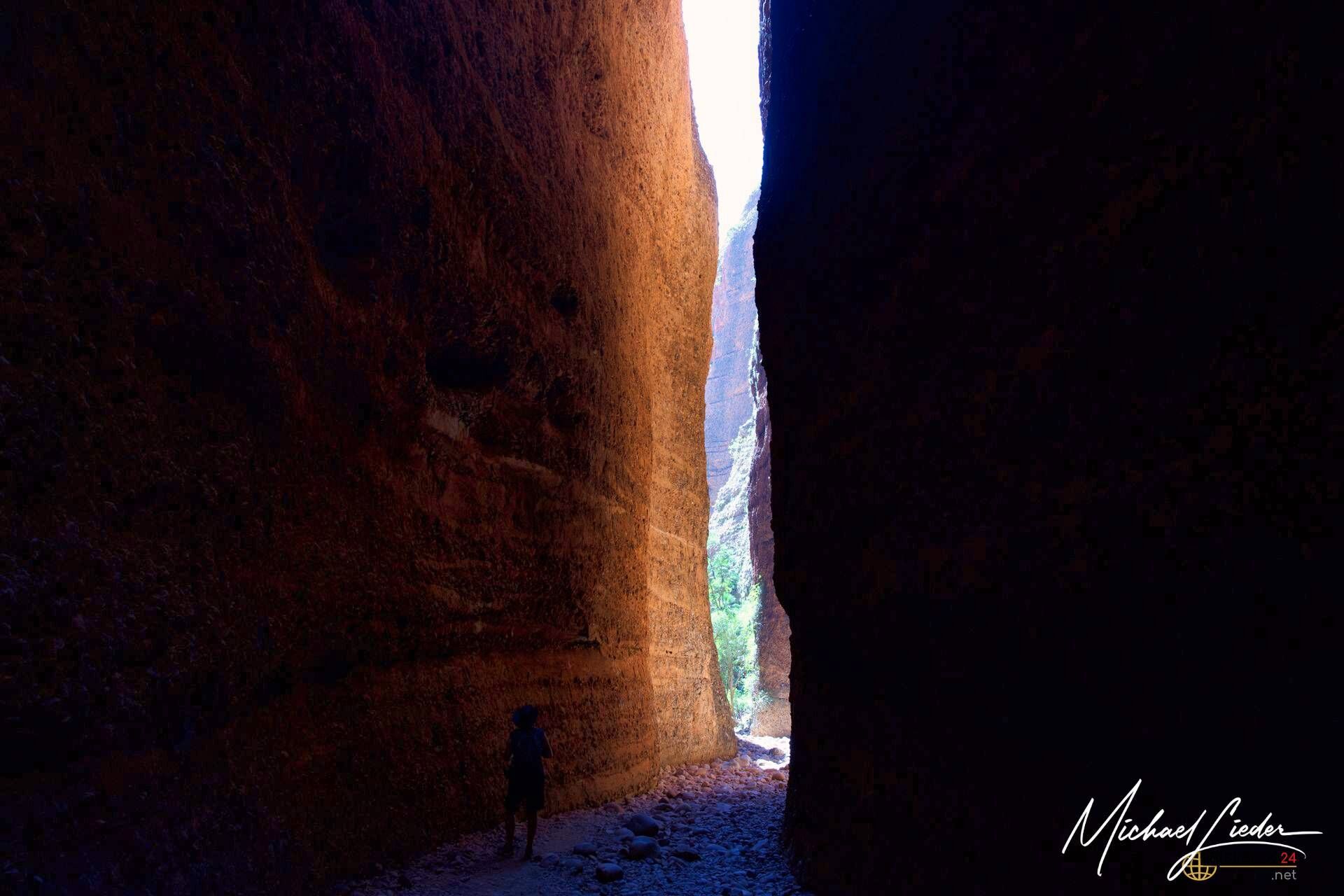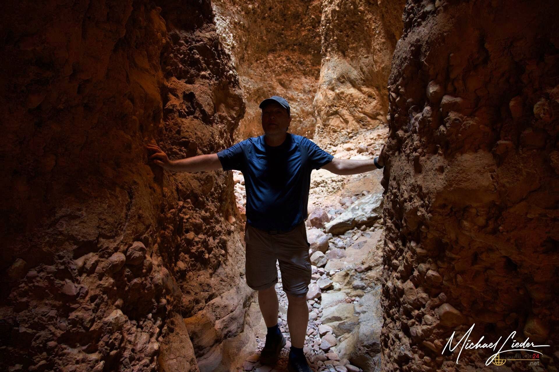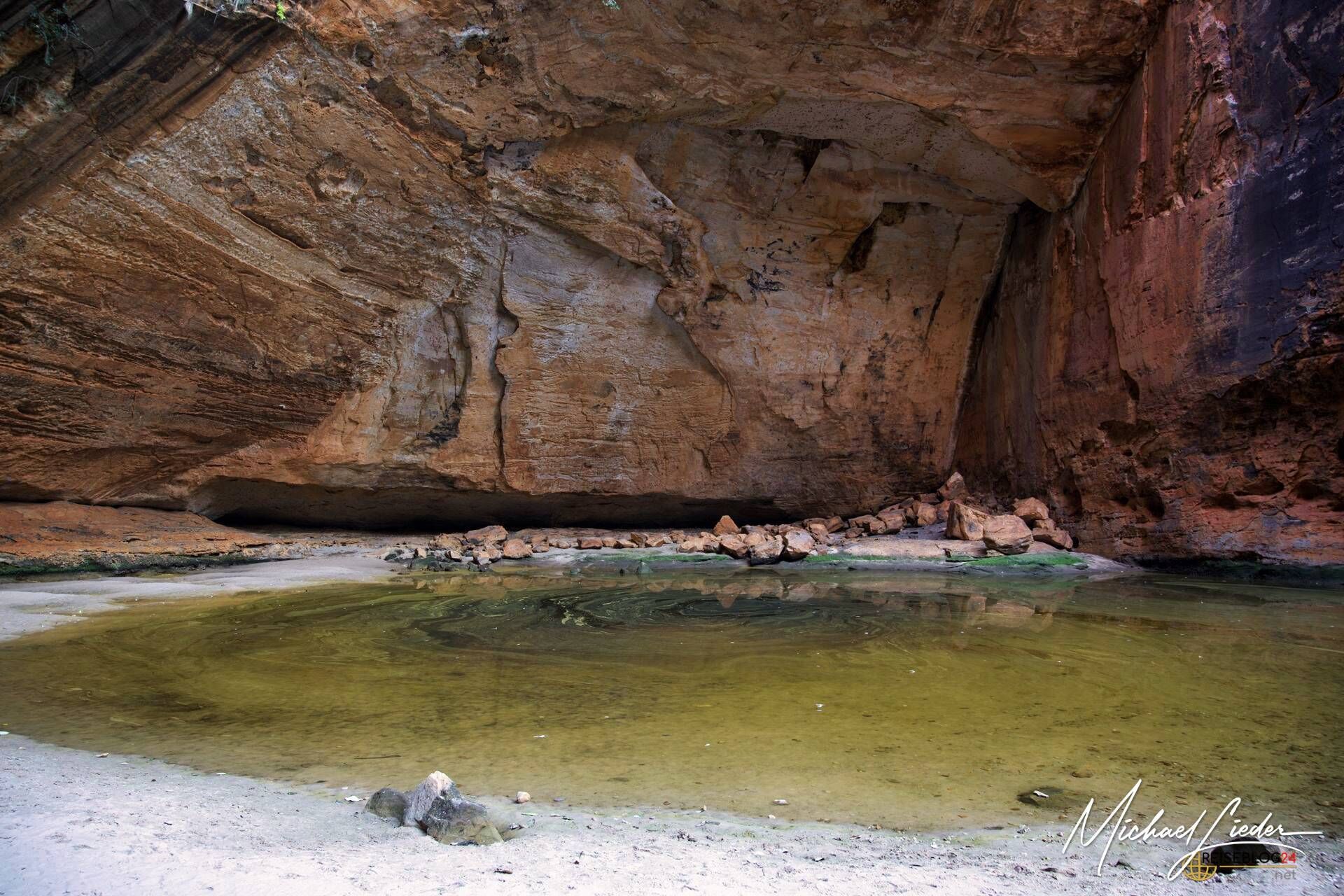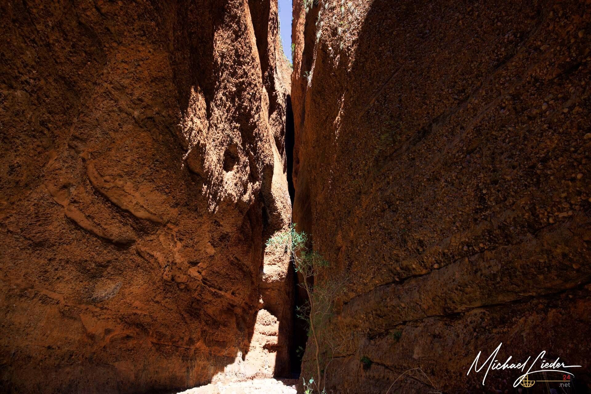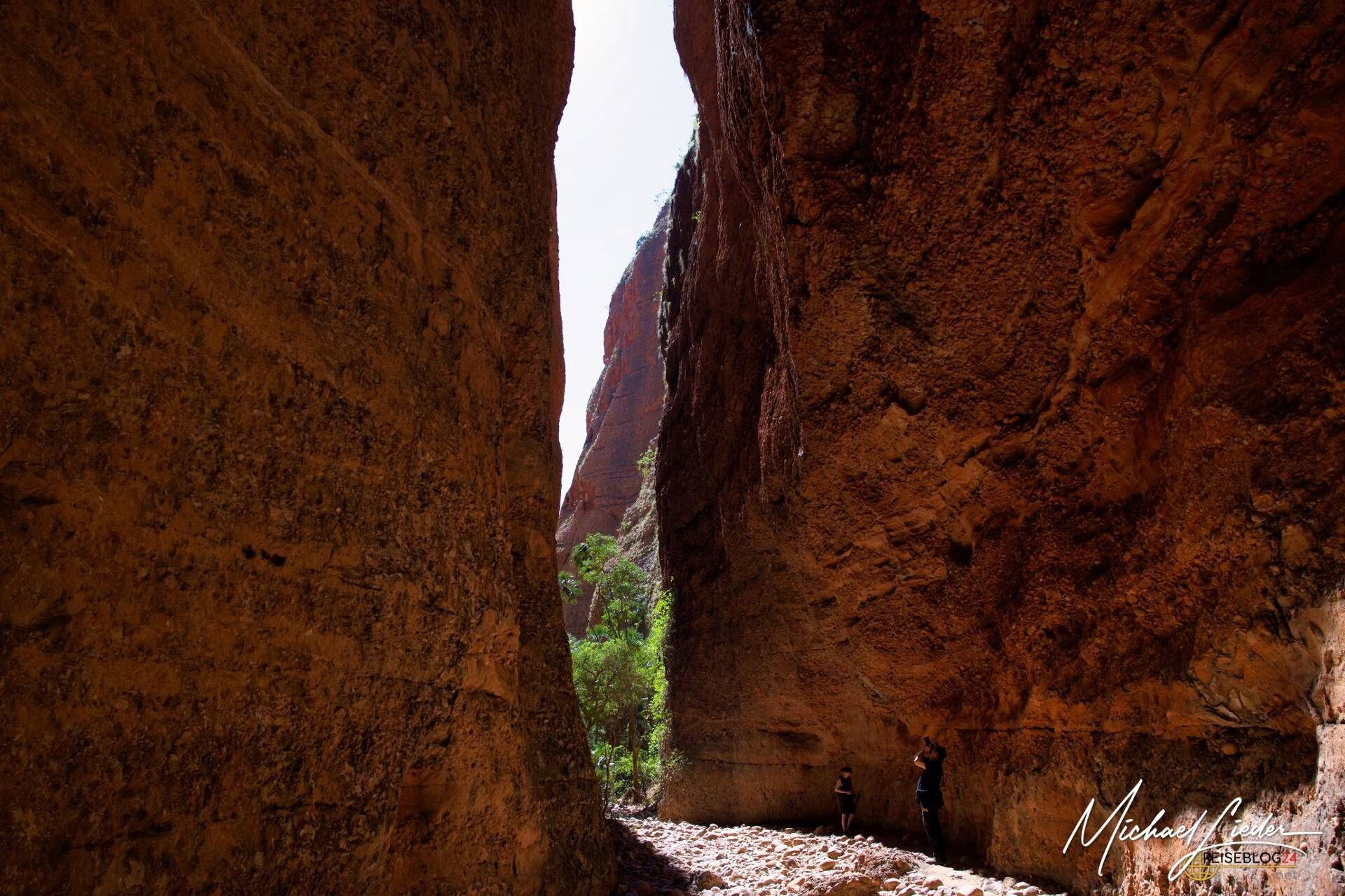Schon die Fahrt durch den Nationalpark war eine Reise für sich. Die Straße schlängelte sich durch eine sich ständig verändernde Landschaft, von roten Wüstenebenen bis zu beeindruckenden Felsformationen. Unser erstes Ziel war der Echidna Chasm. Der Weg dorthin führte durch eine enge Schlucht, flankiert von hohen Felswänden, die in den unterschiedlichsten Rottönen schimmerten. Das Spiel aus Licht und Schatten erzeugte eine magische Atmosphäre, die uns in ihren Bann zog. Die Wanderung war zwar herausfordernd, aber die Aussicht auf das, was einen erwartete, trieb uns voran. Und dann war er da, der Echidna Chasm! Ein schmaler Spalt zwischen den Felsen, der sich immer weiter verengte, je tiefer wir vordrangen. Das Sonnenlicht fiel durch die schmale Öffnung und zauberte leuchtende Muster auf die glatten Wände. Ich konnte kaum glauben, wie die Natur es geschafft hatte, ein solch faszinierendes Kunstwerk zu erschaffen. Es fühlte sich an, als würden wir durch einen geheimen Gang zu den tiefen Schluchten der Erde wandern. Nachdem wir den Echidna Chasm erkundet hatte, machten wir uns auf den Weg zur Cathedral Gorge. Die Vorfreude stieg, ohne dass der Name mich enttäuschte. Der Weg führte durch einen trockenen Flusslauf, vorbei an beeindruckenden Felswänden und üppiger Vegetation.