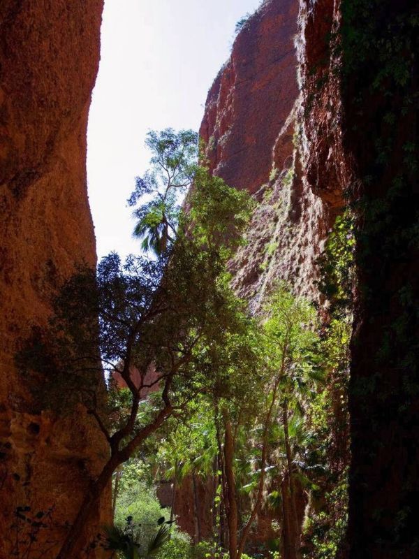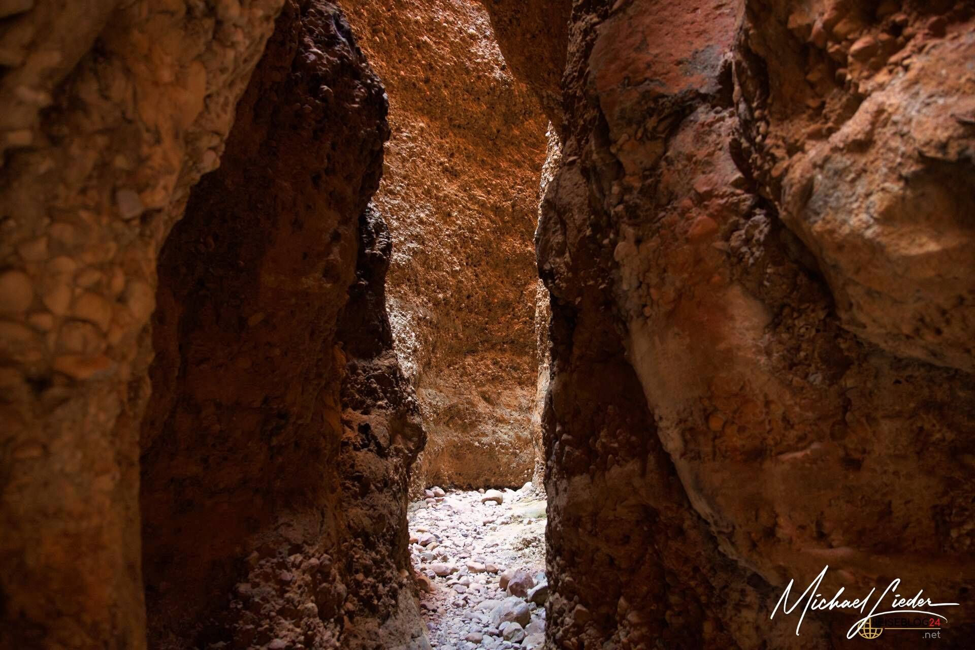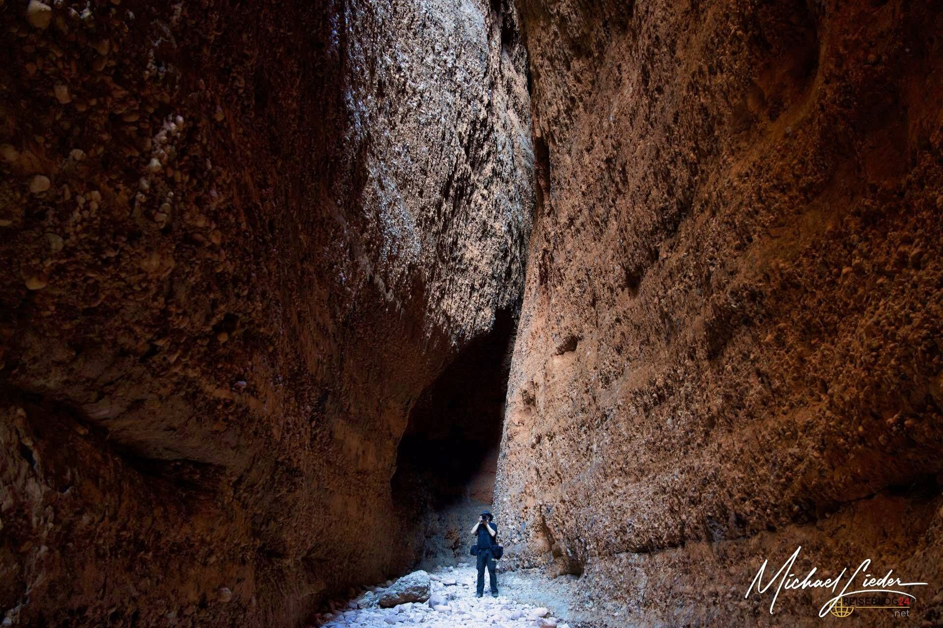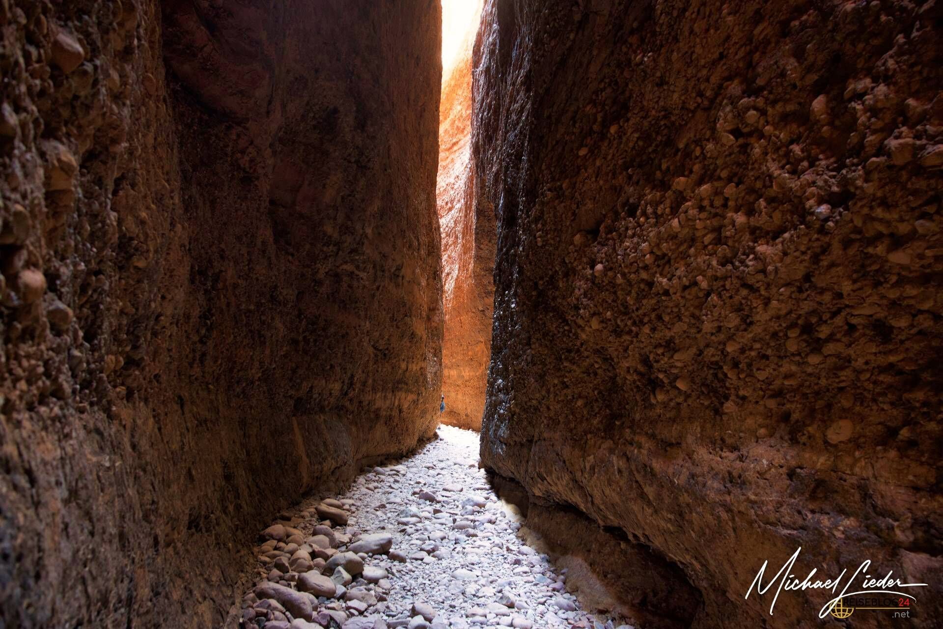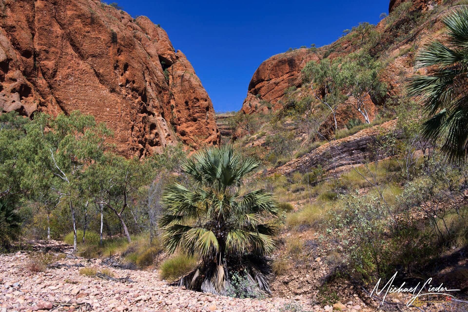 Schon die Fahrt durch den Nationalpark war eine Reise für sich. Die Straße schlängelte sich durch eine sich ständig verändernde Landschaft, von roten Wüstenebenen bis zu beeindruckenden Felsformationen. Unser erstes Ziel war der Echidna Chasm. Der Weg dorthin führte durch eine enge Schlucht, flankiert von hohen Felswänden, die in den unterschiedlichsten Rottönen schimmerten. Das Spiel aus Licht und Schatten erzeugte eine magische Atmosphäre, die uns in ihren Bann zog. Die Wanderung war zwar herausfordernd, aber die Aussicht auf das, was einen erwartete, trieb uns voran. Und dann war er da, der Echidna Chasm! Ein schmaler Spalt zwischen den Felsen, der sich immer weiter verengte, je tiefer wir vordrangen. Das Sonnenlicht fiel durch die schmale Öffnung und zauberte leuchtende Muster auf die glatten Wände. Ich konnte kaum glauben, wie die Natur es geschafft hatte, ein solch faszinierendes Kunstwerk zu erschaffen. Es fühlte sich an, als würden wir durch einen geheimen Gang zu den tiefen Schluchten der Erde wandern. Nachdem wir den Echidna Chasm erkundet hatte, machten wir uns auf den Weg zur Cathedral Gorge. Die Vorfreude stieg, ohne dass der Name mich enttäuschte. Der Weg führte durch einen trockenen Flusslauf, vorbei an beeindruckenden Felswänden und üppiger Vegetation.