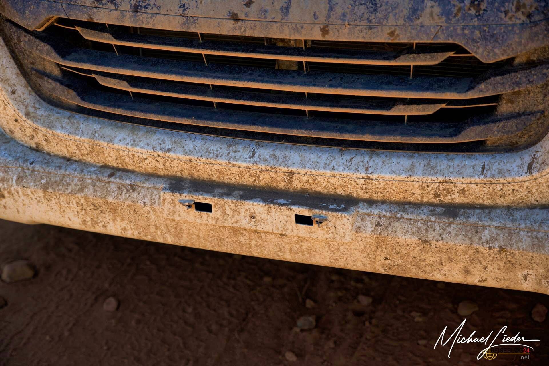 Unser Camper, ehemals strahlend weiß, hatte inzwischen eine ganz neue Persönlichkeit entwickelt. Der matschige Untergrund hatte sein Bestes gegeben, um das Fahrzeug mit einer natürlichen „felsigen“ Patina zu versehen. Die getrocknete Kruste aus Dreck und Schlamm verlieh ihm ein wildes, fast schon rebellisches Aussehen. Plötzlich wirkten wir nicht mehr wie harmlose Touristen, sondern wie echte Abenteurer, die mit ihrem Fahrzeug im Einklang mit der Natur standen. Die Tarnfarbe der Natur gefiel uns so gut, dass wir beschlossen, das neue Erscheinungsbild erst einmal zu behalten – schließlich fügte es sich perfekt in die raue Umgebung ein.