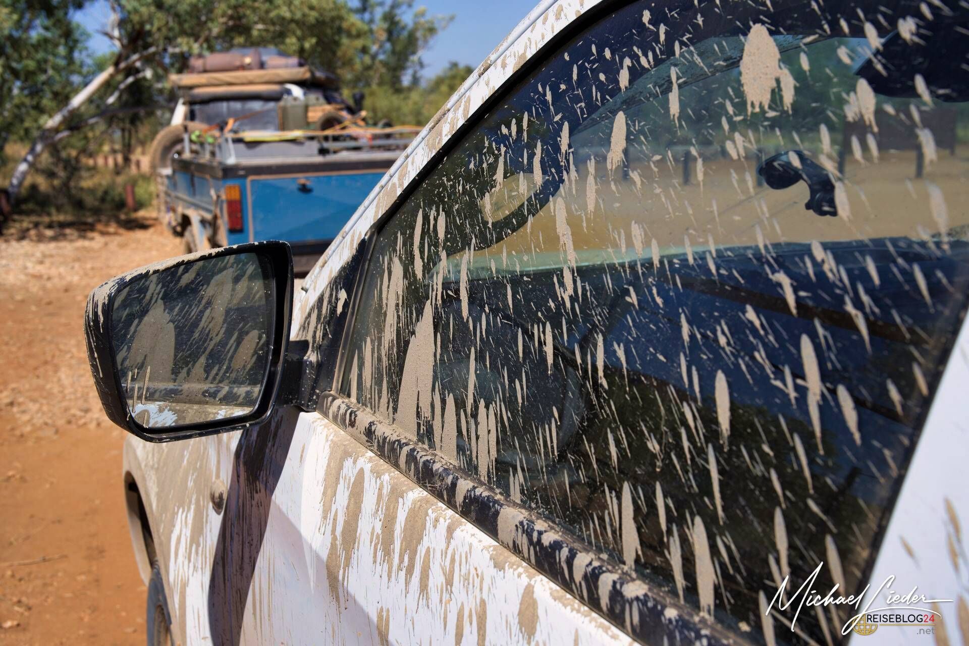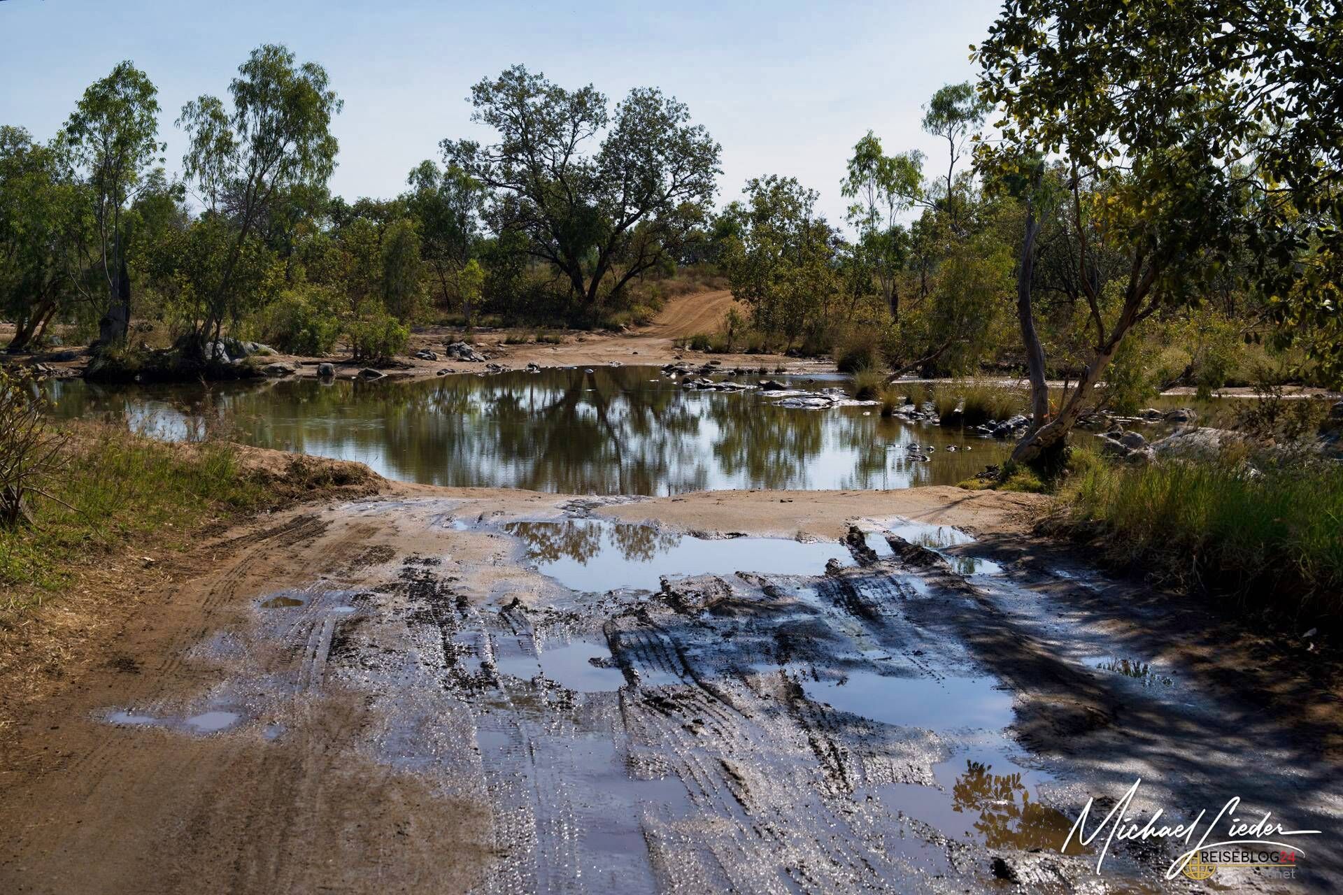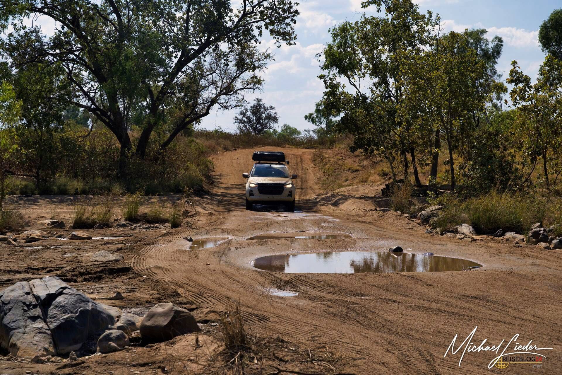 Doch vorher musste uns der Purnululu Nationalpark noch verabschieden. Und das tut er nicht mit Handschlag, sondern mit Tiefgang. 25 Kilometer Track lagen vor uns. Auf der Karte eine Randnotiz, in der Realität eine fast dreistündige Prüfung für Mensch und Maschine. Tiefe Spurrillen, lose Steine, Schlammlöcher, die aussehen, als hätten sie schon bessere Fahrzeuge gesehen. Jeder Meter rüttelte durch, jeder Schlag ließ erahnen, dass hier nichts geschenkt wird.