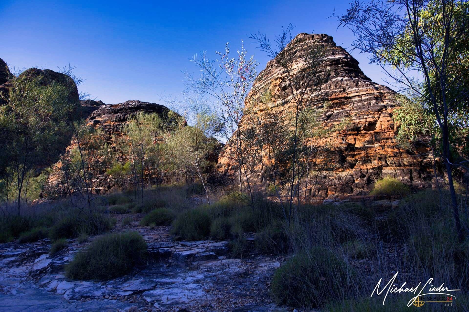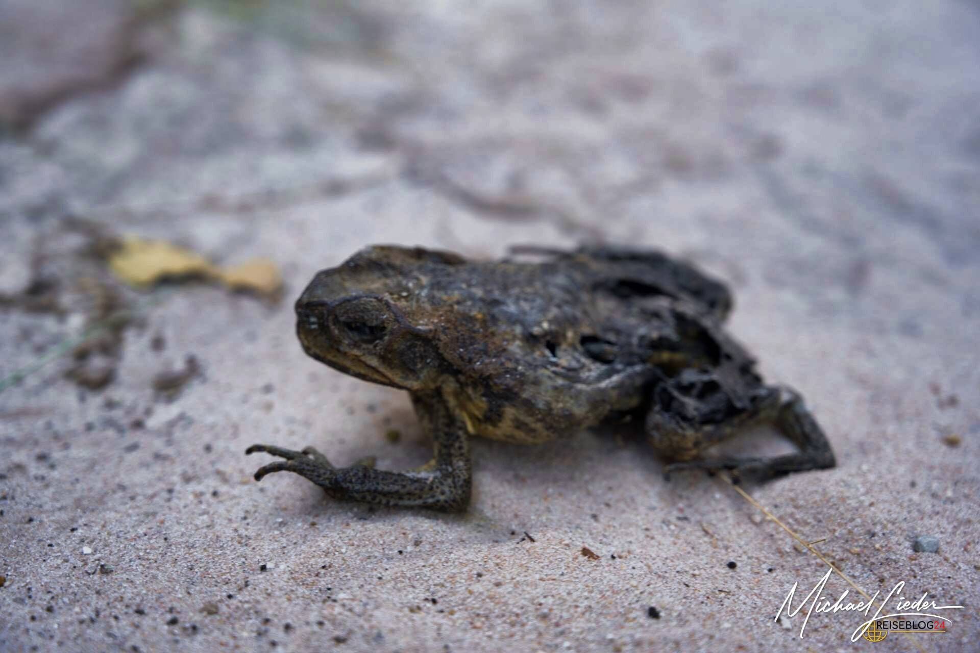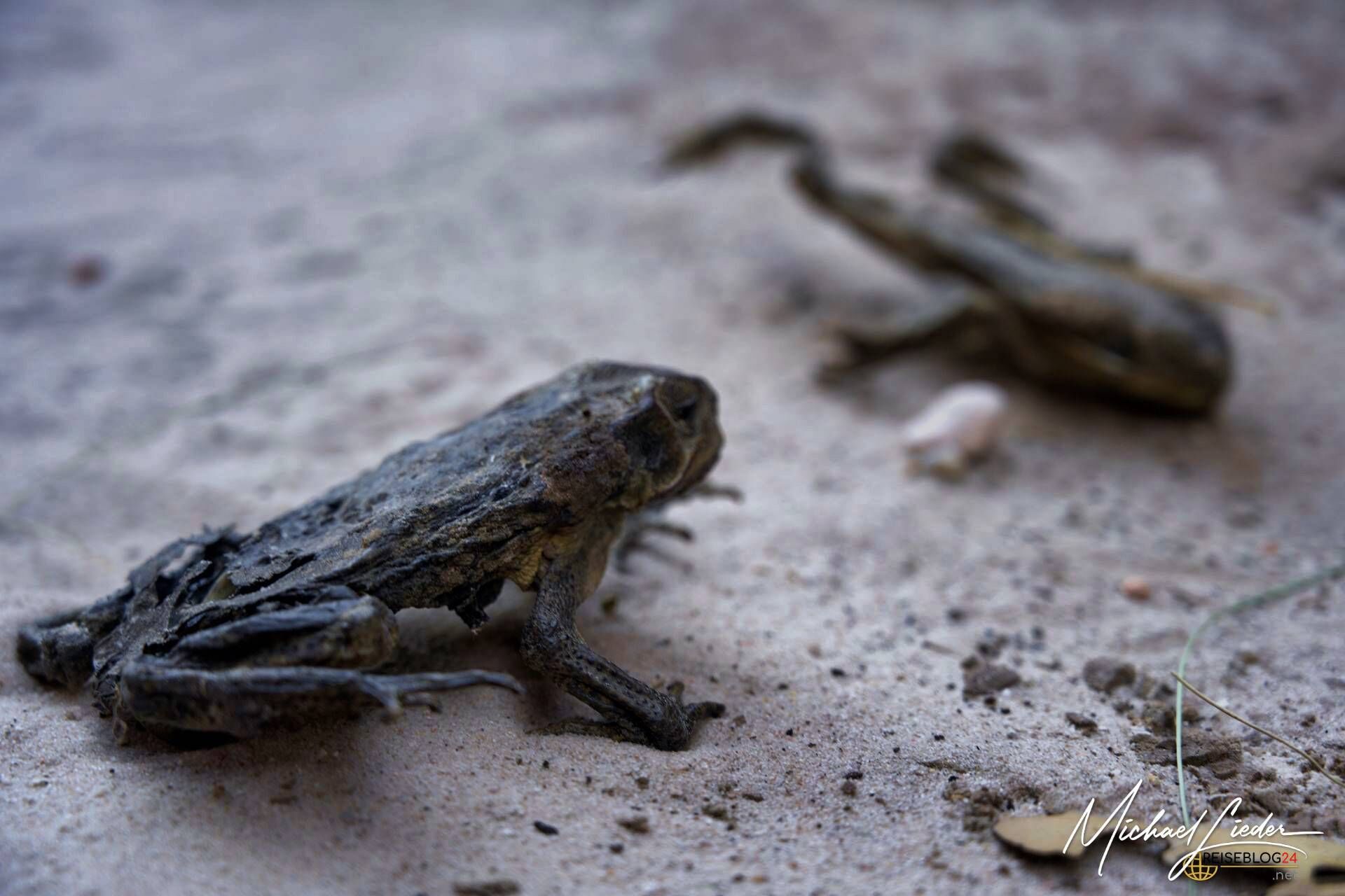 Am nächsten Tag machten wir uns früh auf den Weg, um die Bungle Bungles aus der Nähe zu erkunden. Die „Domes", wie die runden Sandsteintürme genannt werden, waren unser Ziel. Die Wanderung führte uns durch ausgetrocknete Flussbetten, enge Felsspalten und vorbei an einigen faszinierenden Felsformationen. Als wir schließlich zwischen den Domes standen, war ich überwältigt von der Größe und Schönheit der Natur.Die Bungle Bungles, mit ihren charakteristischen orange-weißen Streifen, sahen aus der Ferne schon unglaublich surreal aus. Am Morgen sah man in der goldenen Sonne die gewundenen Flussläufe, die sich durch die Felsen schlängelten, und die beeindruckende Struktur der Domes wurde noch deutlicher. Die Farbkontraste zwischen dem roten Sandstein und dem klaren blauen Himmel waren einfach spektakulär. Auf dem Rückweg zum Auto konnten wir dann noch Kröten beobachten, die den Weg zum Wasser nicht mehr geschafft haben und dort vom heißen Wind und der Sonne mumifiziert scheinbar mitten in der letzten Bewegung ihr Leben verloren haben. Ein schauriger, aber auch irgendwie faszinierender Anblick.