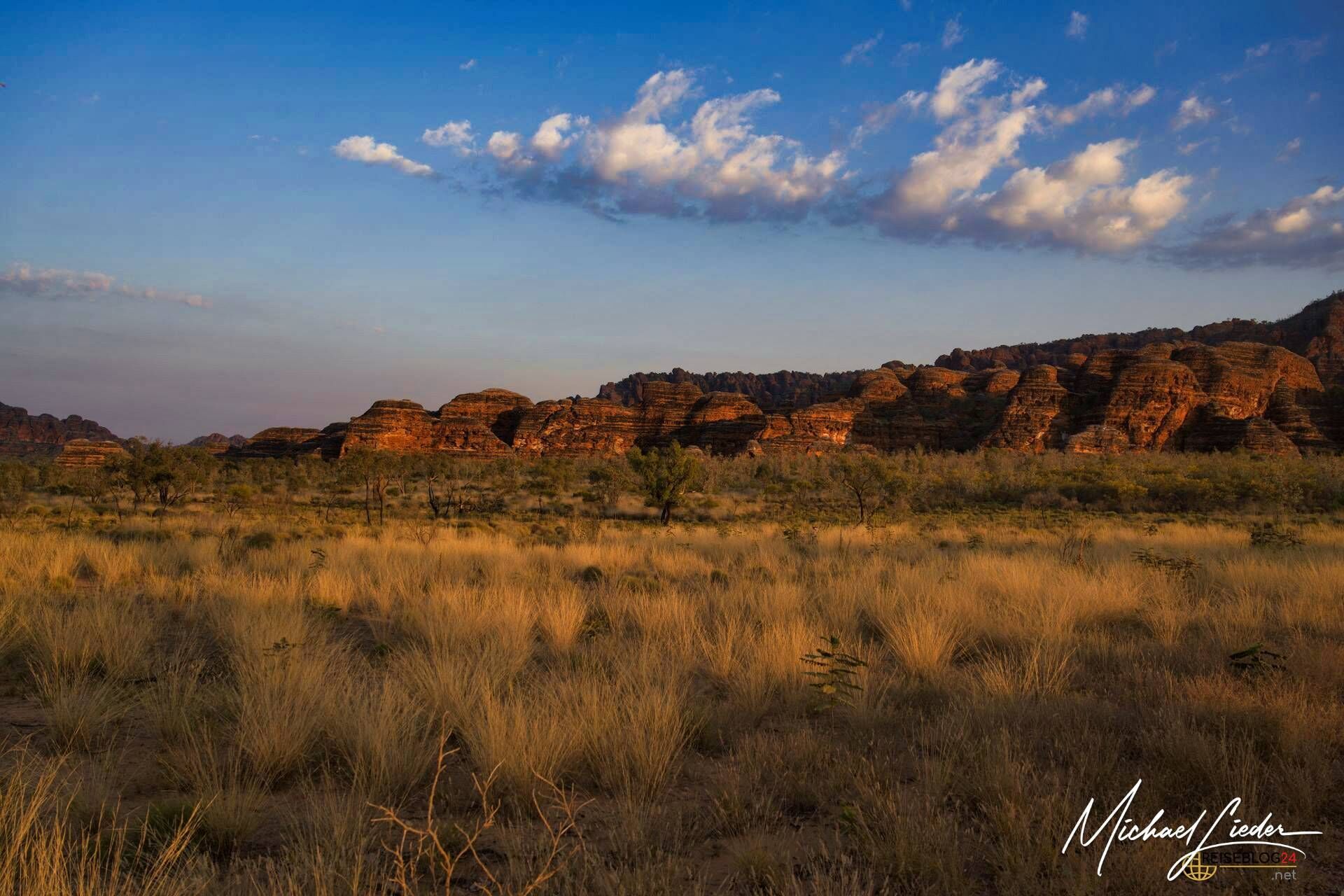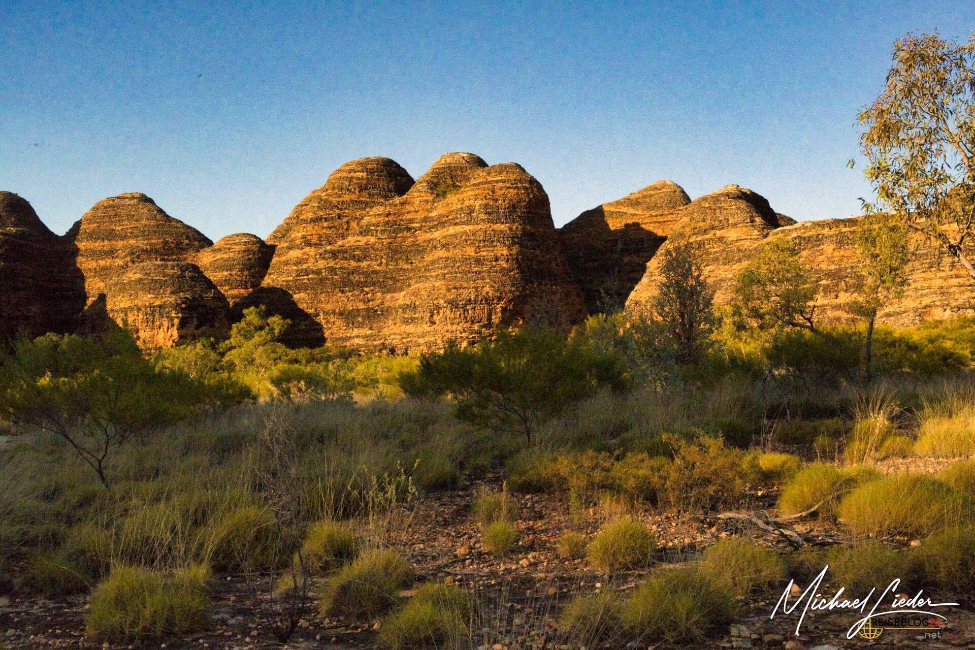 Die ikonischen Bungle Bungle Range bestehen aus riesigen Sandsteinformationen, die wie Bienenkörbe aussehen. Diese einzigartigen Felskuppeln haben ihre orange-schwarze Färbung durch den Wechsel von Sandsteinschichten und cyanobakteriellen Streifen, die sich im Laufe von Millionen Jahren gebildet haben.