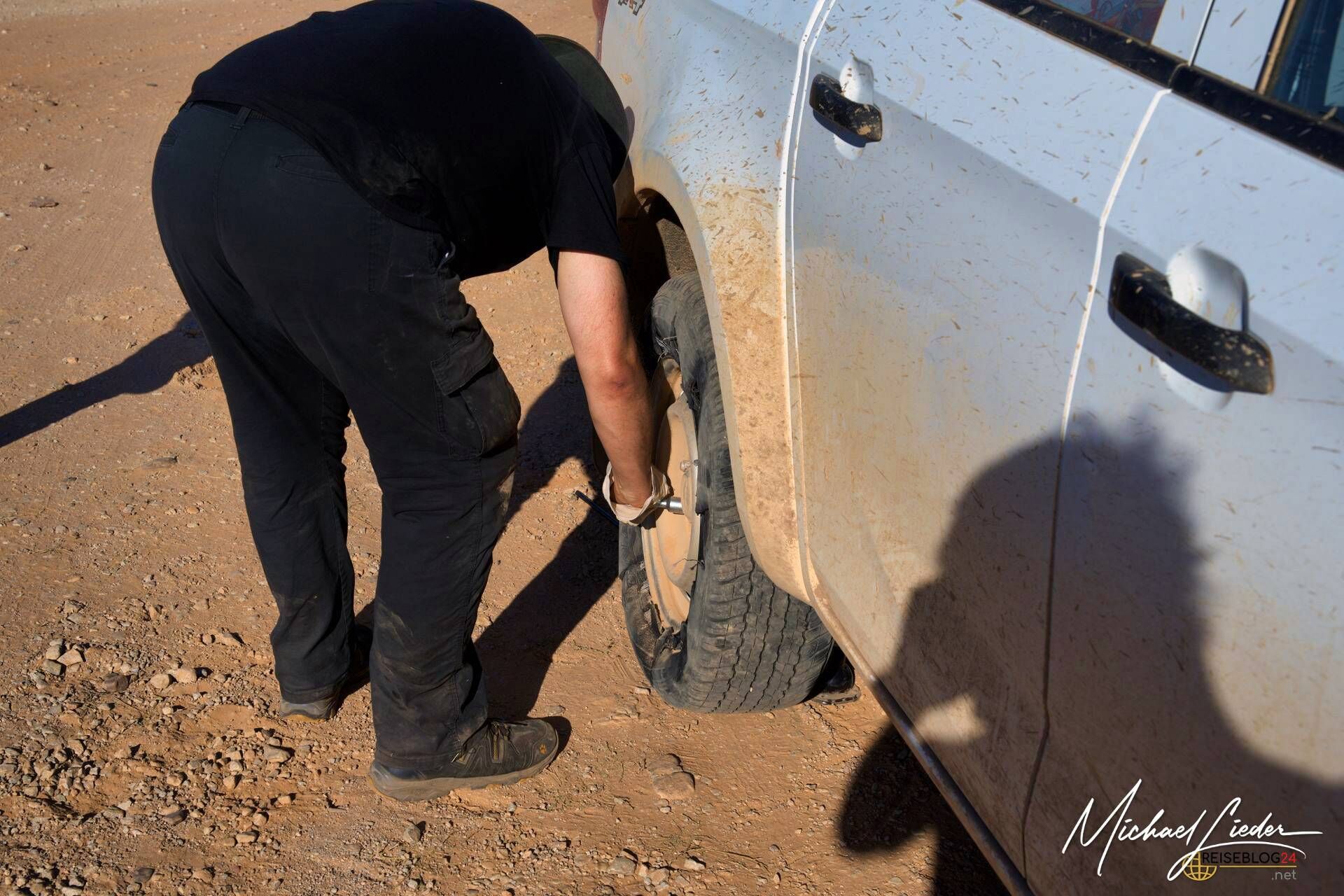 Also raus in die Hitze. Bordwerkzeug auspacken. Sand knirscht, Schweiß läuft, die Sonne kommentiert alles mit stiller Genugtuung. Allein das Absenken des Reserverads entwickelte sich zur kleinen Survival-Einlage. Welche Kurbel? Welche Richtung? Warum jetzt? Irgendwann lag das Ersatzrad da – staubig, schwer, Hoffnung in Gummiform.