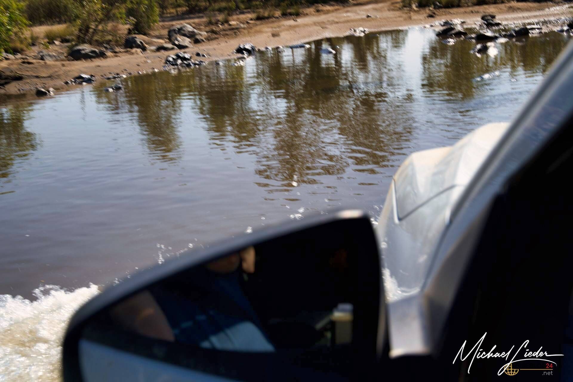 Kaum hatten wir die ersten Kilometer im Nationalpark zurückgelegt, bot sich uns bereits ein beeindruckendes Bild: Vor uns erstreckte sich die erste größere Wasserpassage, und unser Puls stieg. Die Wassertiefe war schwer einzuschätzen und wir zweifelten an der Tauglichkeit unseres Fahrzeugs – unser Pick-up, eigentlich für solche Strecken gedacht, hatte keinen Schnorchel, wie wir es bei der Bestellung angegeben hatten. Unsicherheit breitete sich aus, und so taten wir, was jeder abenteuerhungrige Neuling in einer solchen Situation tun würde: Wir warteten ab und beobachteten.