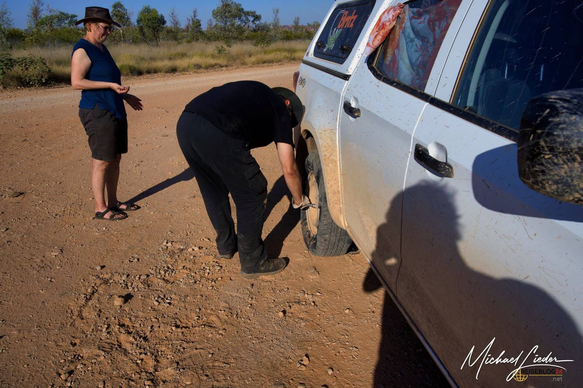 Aber genau hier liegt der Witz am Reisen im Outback: Nichts läuft wie geplant, und genau das macht es richtig. Ein platter Reifen entscheidet über Routen, Geschichten und spätere Abende, an denen man lachend erzählt, wie „schlagartig die Luft raus war“. Wir fuhren weiter, etwas vorsichtiger, etwas klüger – und mit dem beruhigenden Gefühl, wieder eine dieser Erfahrungen gesammelt zu haben, die man sich nicht wünscht, aber nie vergisst.