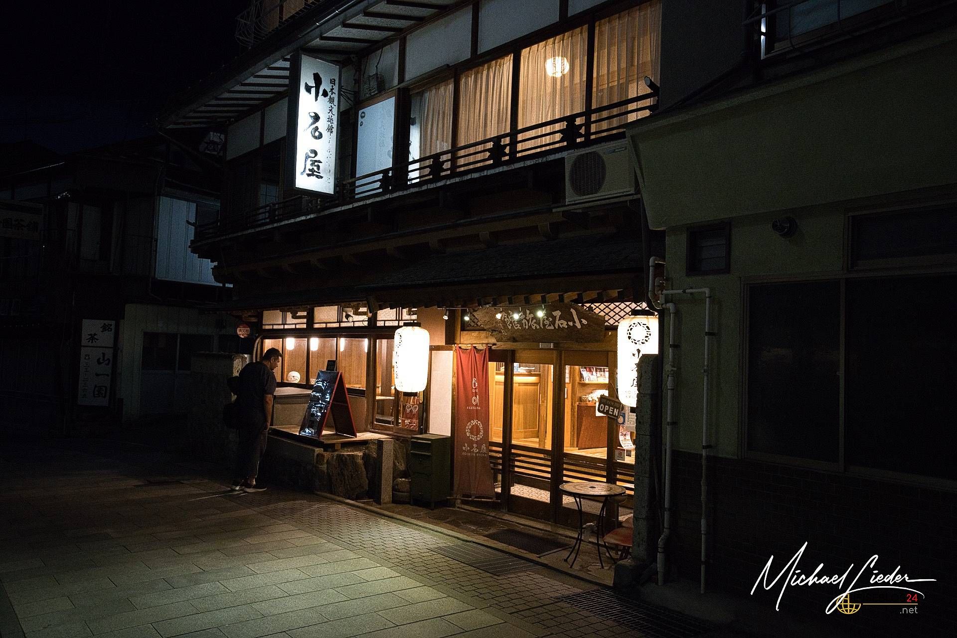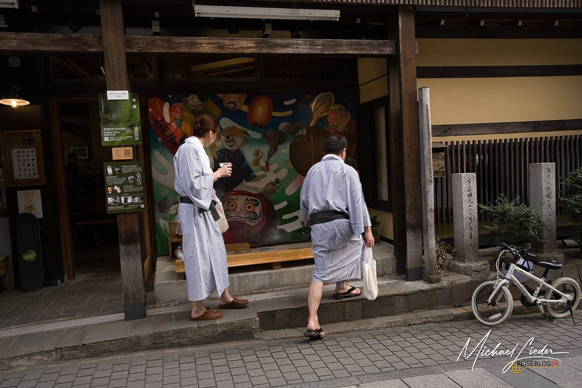 Unsere Ryokan-Besitzerin erklärte uns freundlich, aber in rasendem Japanisch/Englisch, wie das alles funktioniert: Yukata anziehen, Schlüssel schnappen, zum Badehaus gehen, nackt machen, waschen, baden, fertig. Einfach, oder? In der Realität irrt man erstmal planlos durch die Straße, fragt sich, ob man so wirklich raus darf – und wird dann von einem älteren Japaner mit Körbchen und Flipflops überholt, der aussieht, als mache er das jeden Morgen vor dem Frühstück.