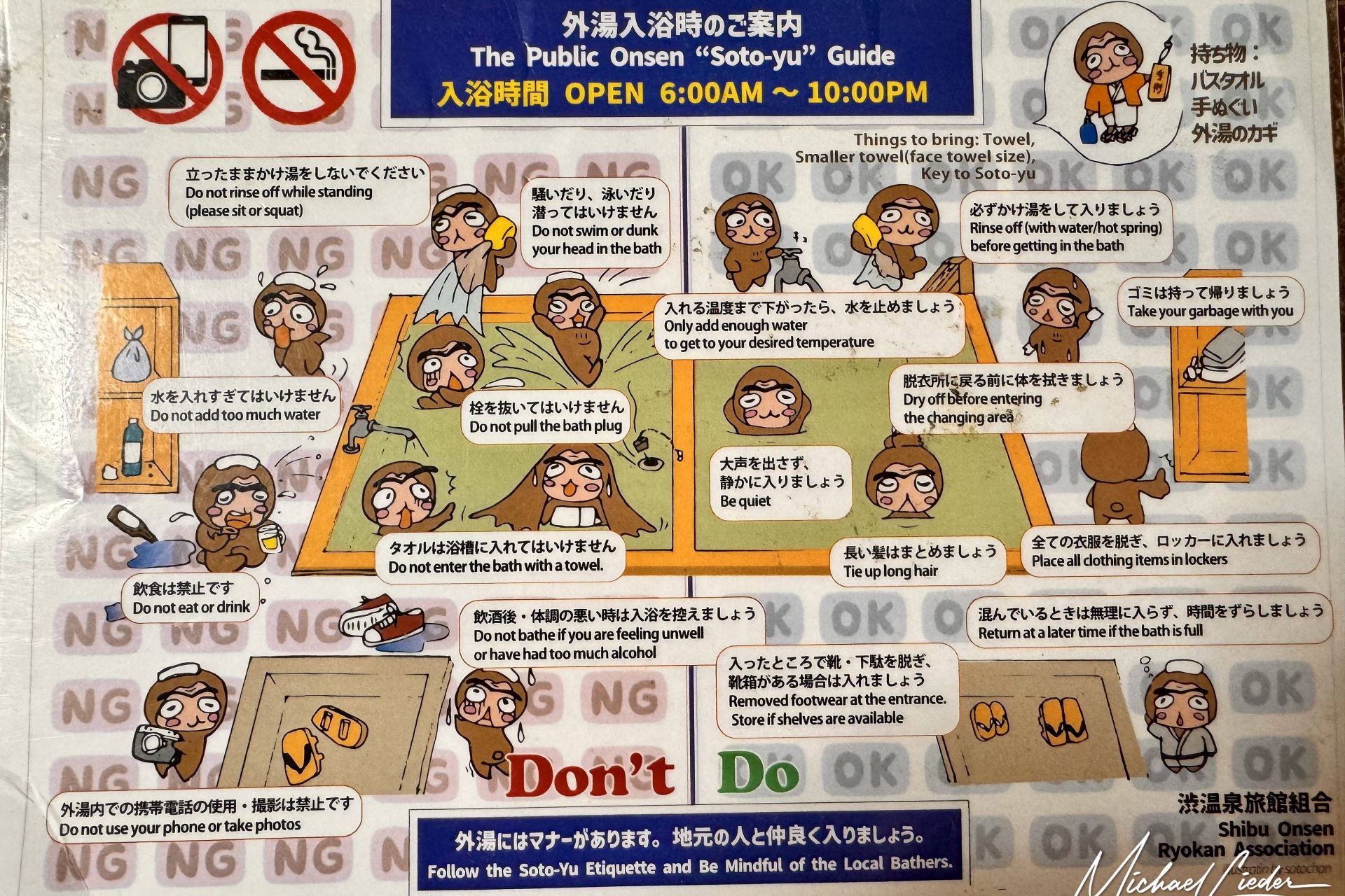 Wer ungewaschen ins Onsen steigt, riskiert den kollektiven Todesblick. Dusch dich gründlicher als vor dem ersten Date!