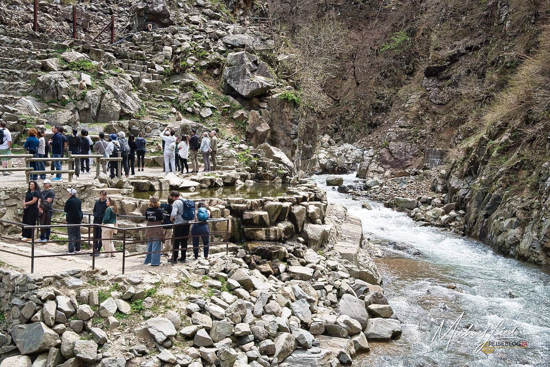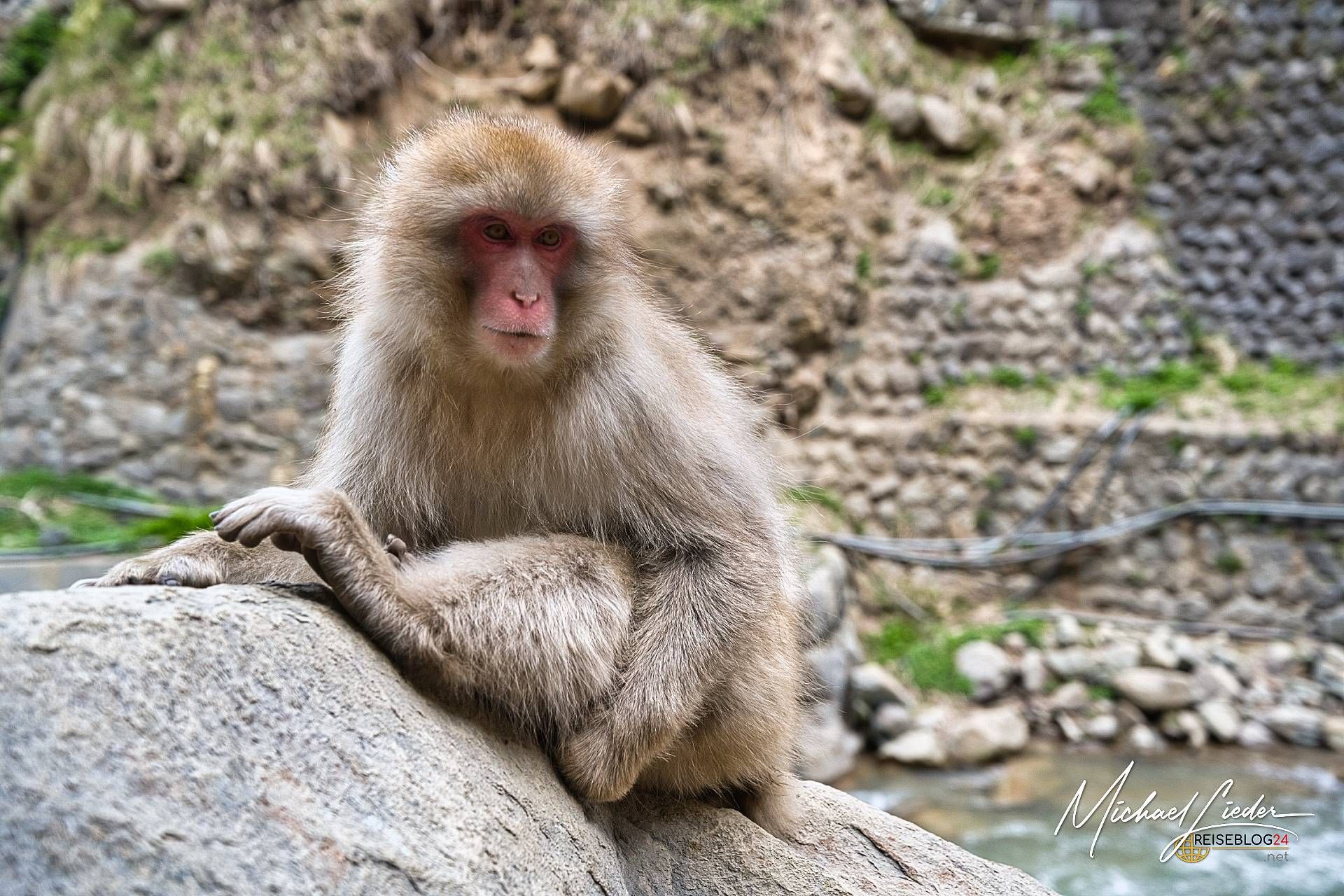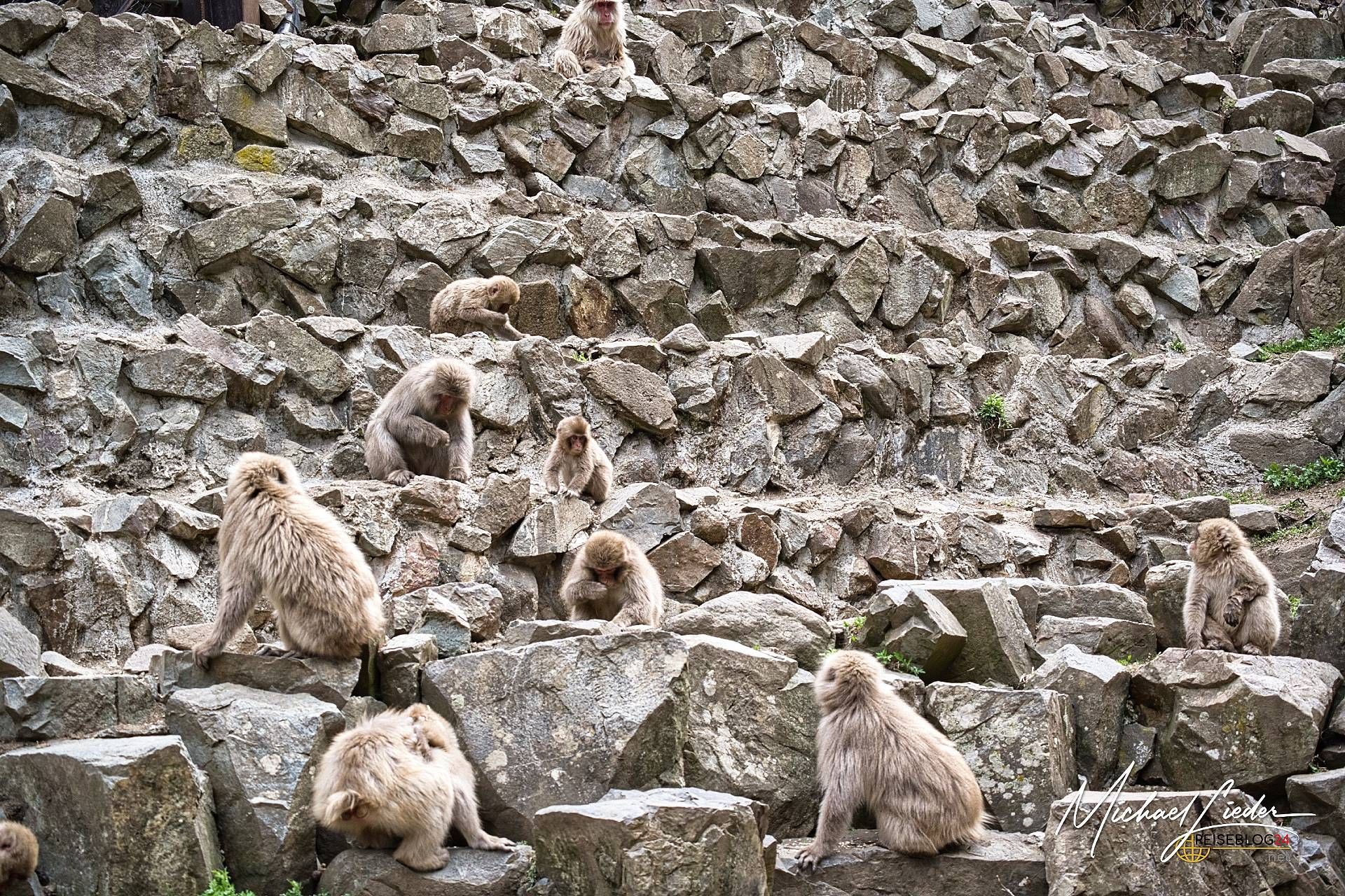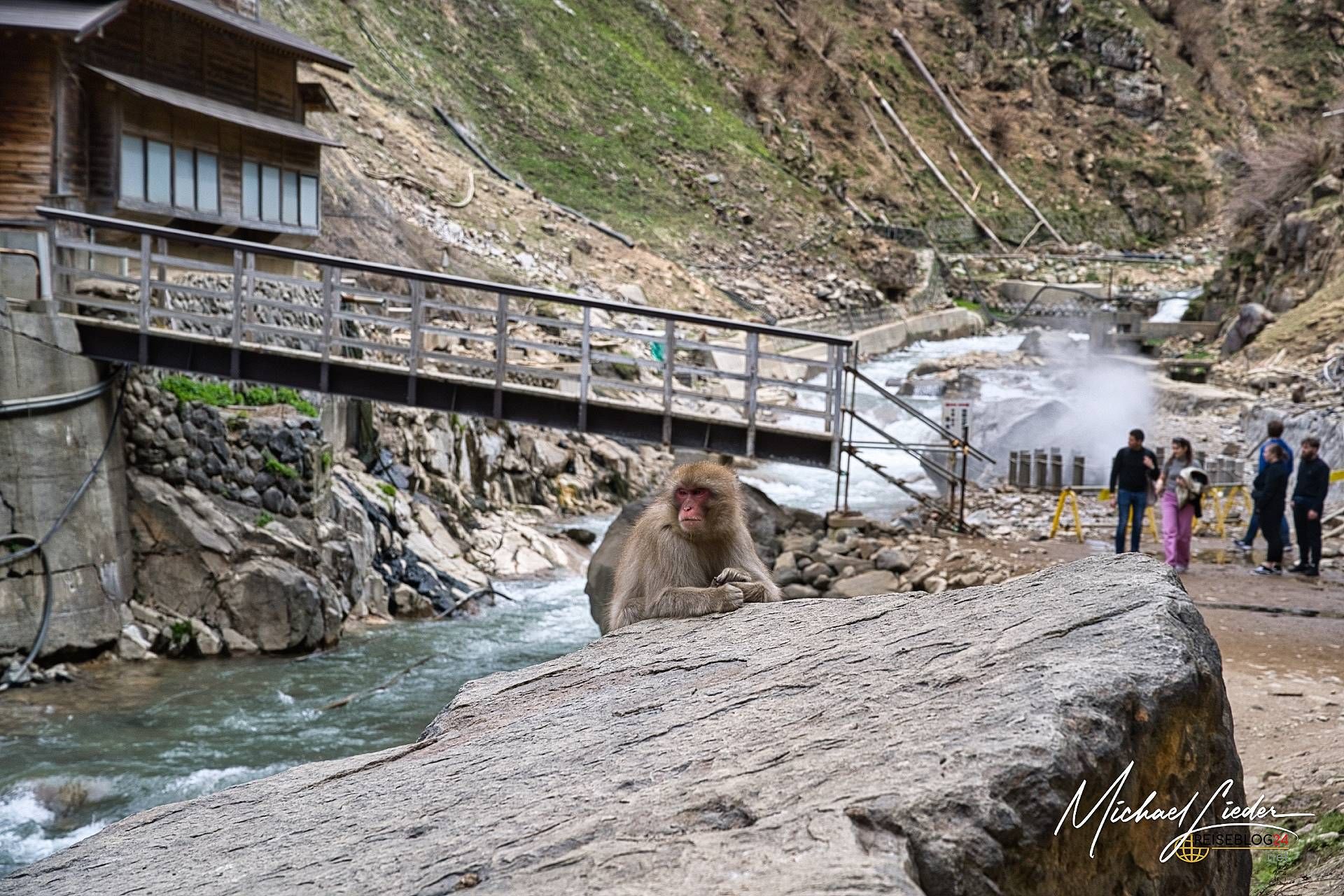 Schon auf der Brücke vor dem Eingang zum Park entdeckten wir die ersten Japanmakaken, auch Schneeaffen genannt. Sie saßen auf den Felsen und warteten geduldig auf die wärmenden Sonnenstrahlen des Morgens. Der Anblick war faszinierend – auch ohne Schnee. Und da waren wir also: Am berühmten Affen-Onsen, gemeinsam mit einer kleinen Gruppe anderer Besucher. Nach und nach kamen mehr Affen den Hang herunter, angeführt von einem imposanten Männchen mit einer regelrechten Löwenmähne. Die Ranger hatten kleine Körner ausgelegt, und das „Frühstück“ wurde ohne zu zögern angenommen. Einige Affen tranken ein wenig Wasser, andere blickten neugierig in unsere Richtung – doch baden wollte heute keiner.