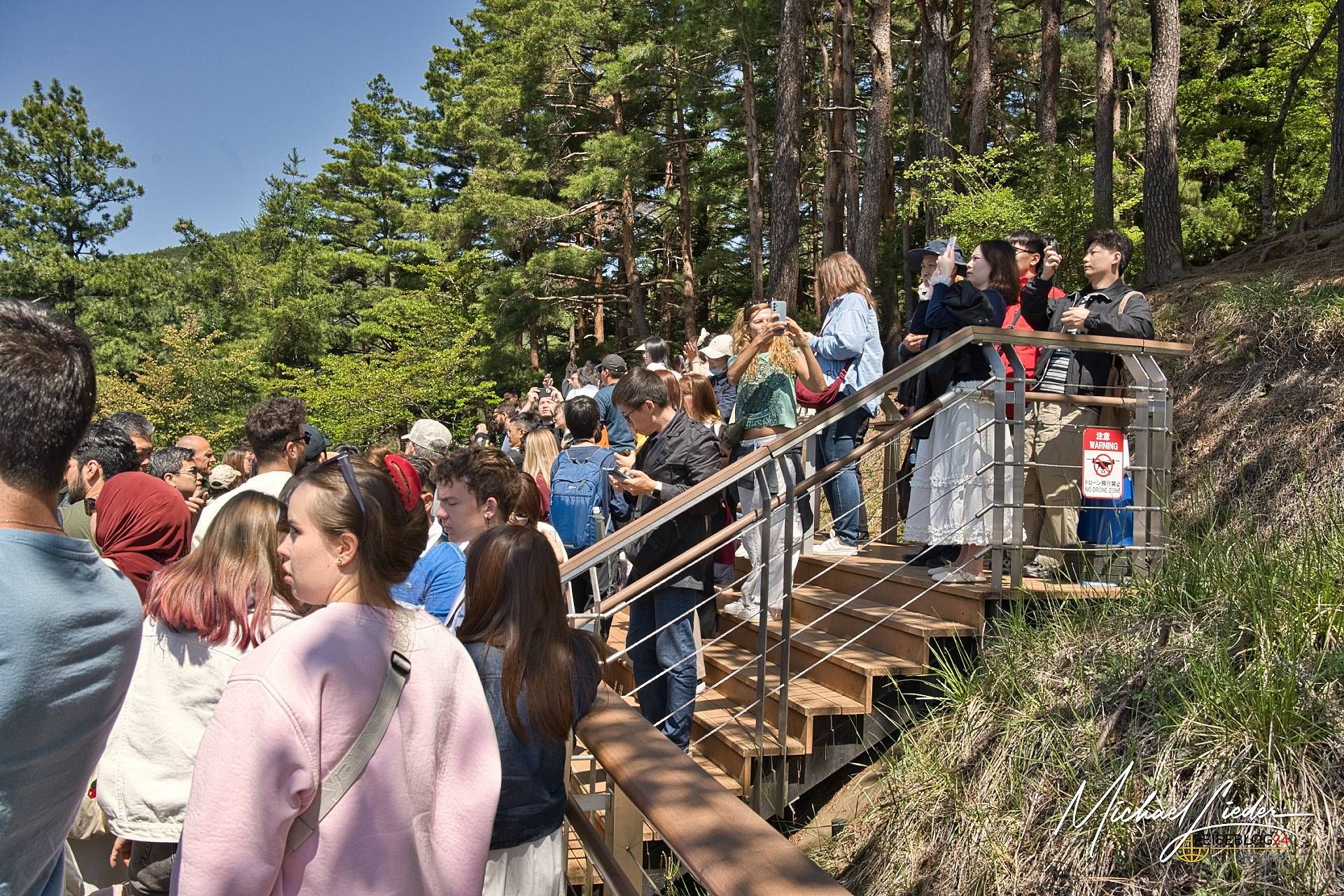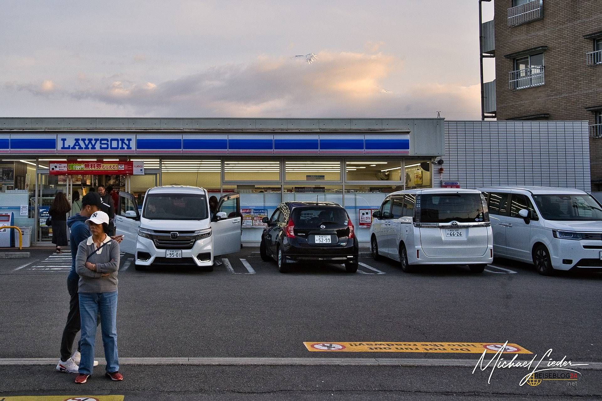 Was danach kam, war weniger Zen und mehr Festival. Ab 7 Uhr erwacht rund um den Fuji ein erstaunlich gut organisierter Ausnahmezustand. Menschen aus aller Welt, ausgerüstet mit Stativen, Drohnen, Selfiesticks und der inneren Überzeugung, dass genau sie heute das ikonischste Bild dieses Berges schießen werden. Die Realität? Schlangen. Lange Schlangen. Für einen Fotospot. Für ein Torii. Für einen Parkplatz. Und manchmal – ungelogen – auch für das Gefühl, dabei gewesen zu sein. Besonders absurd wird es beim Tenku no Torii, dem „Torii im Himmel“. So himmlisch ist der Ort inzwischen gar nicht mehr. Es gibt Eintritt. Es gibt Zeitlimits (drei Minuten pro Person – stell dir das mal beim Sonnenaufgang vor!). Und es gibt inzwischen sogar ein zweites Torii, weil das erste den Instagram-Traffic nicht mehr bewältigen kann. Willkommen im Zeitalter der spirituellen Massenveranstaltung.