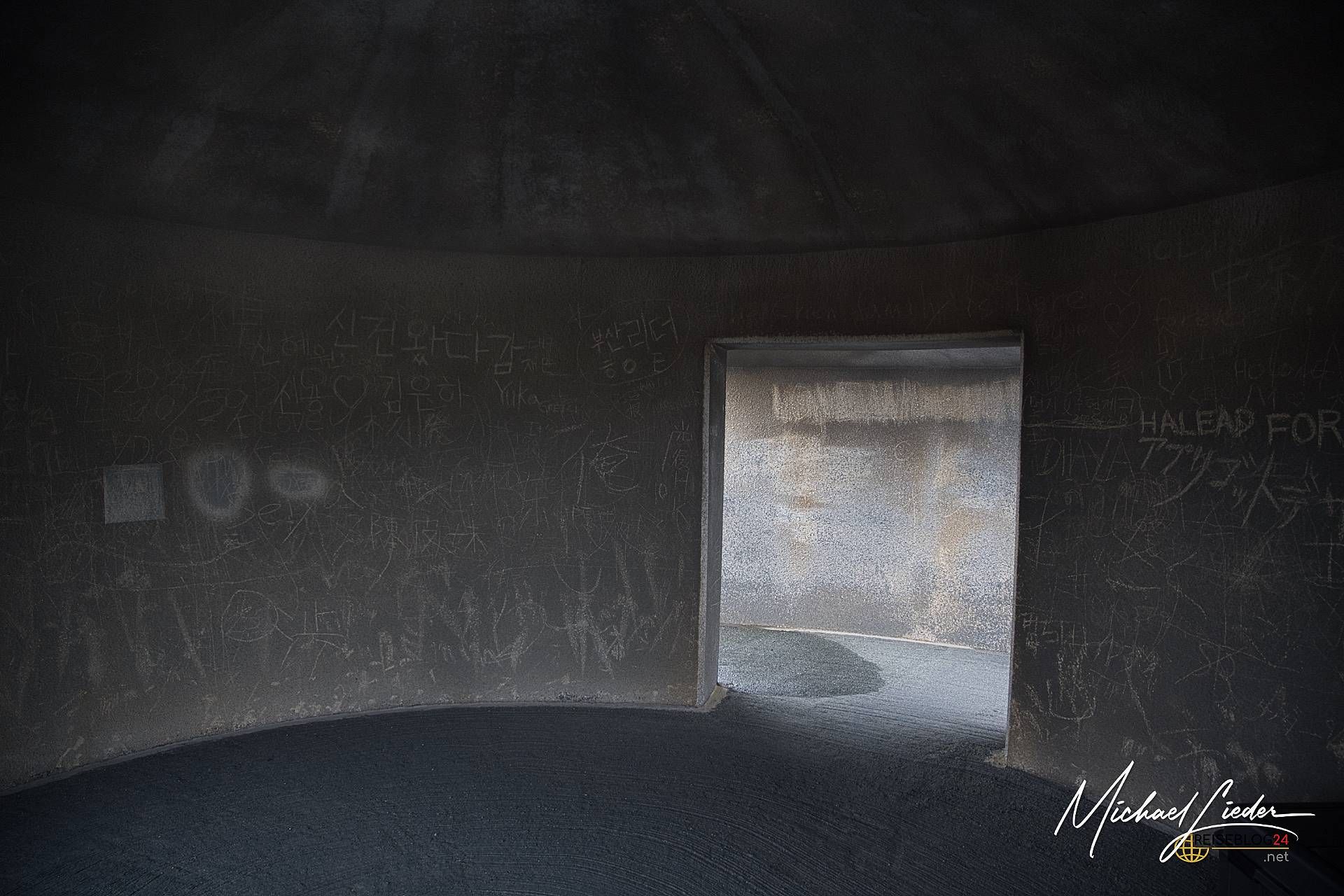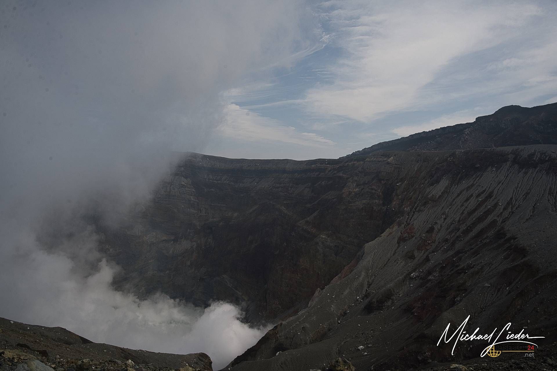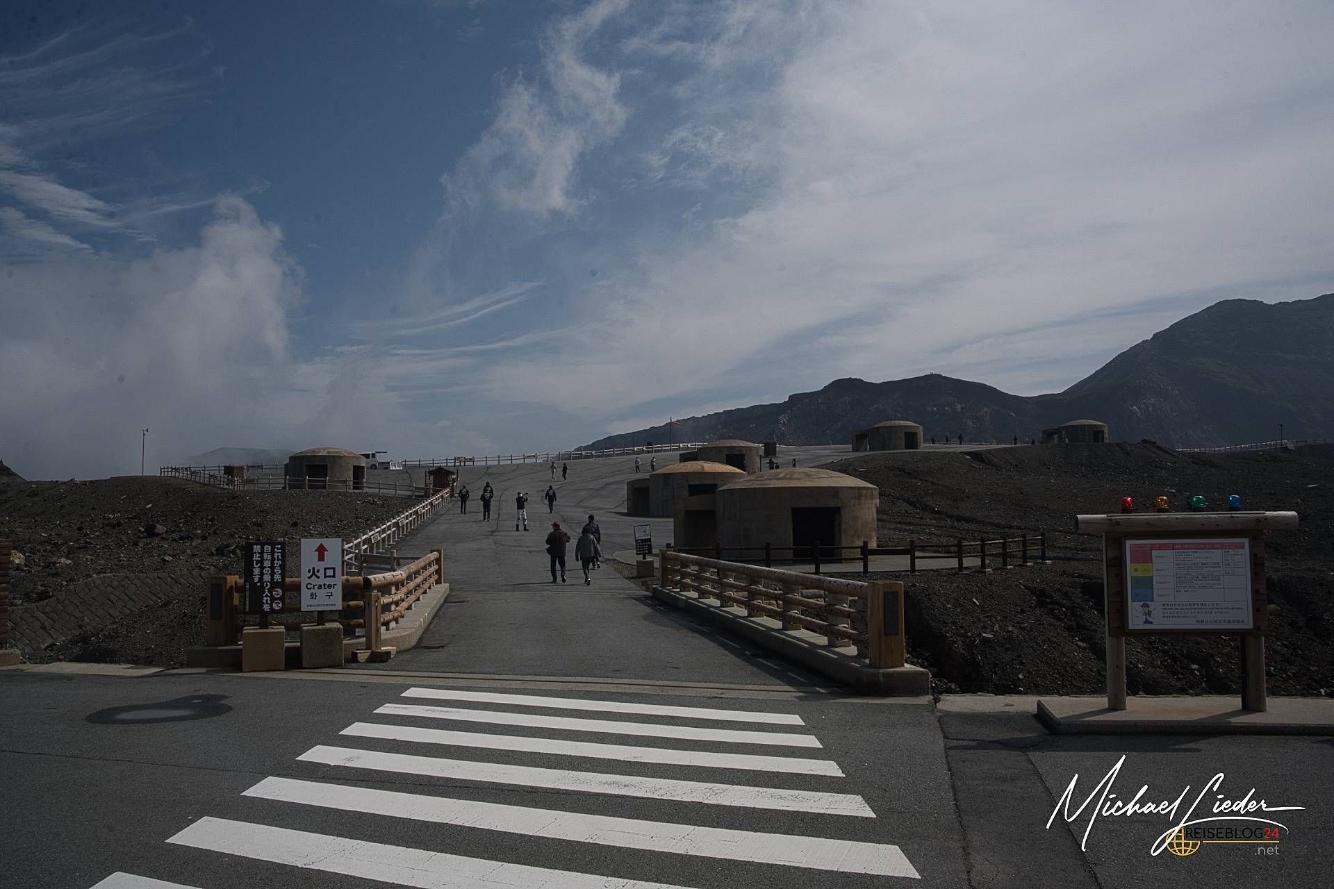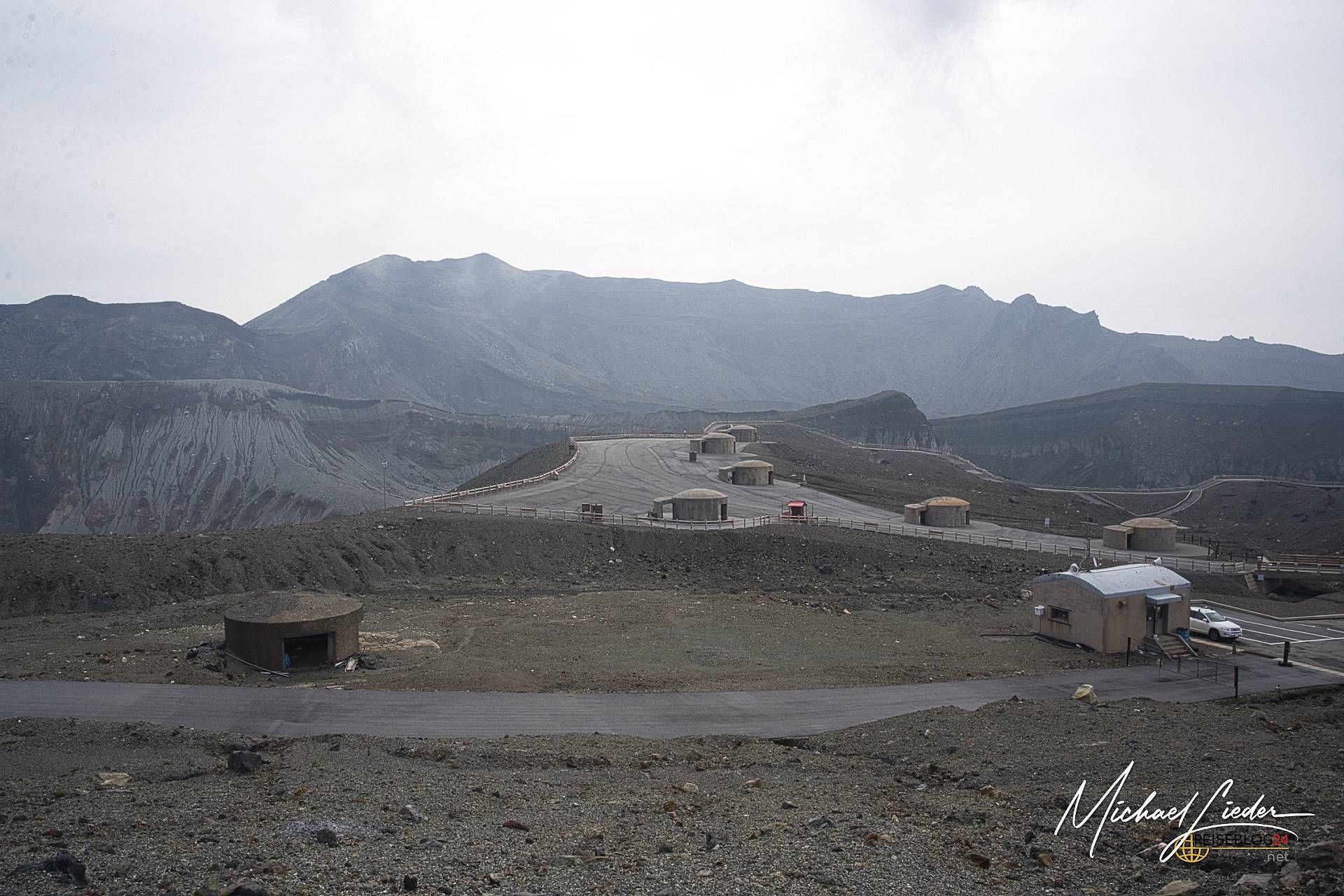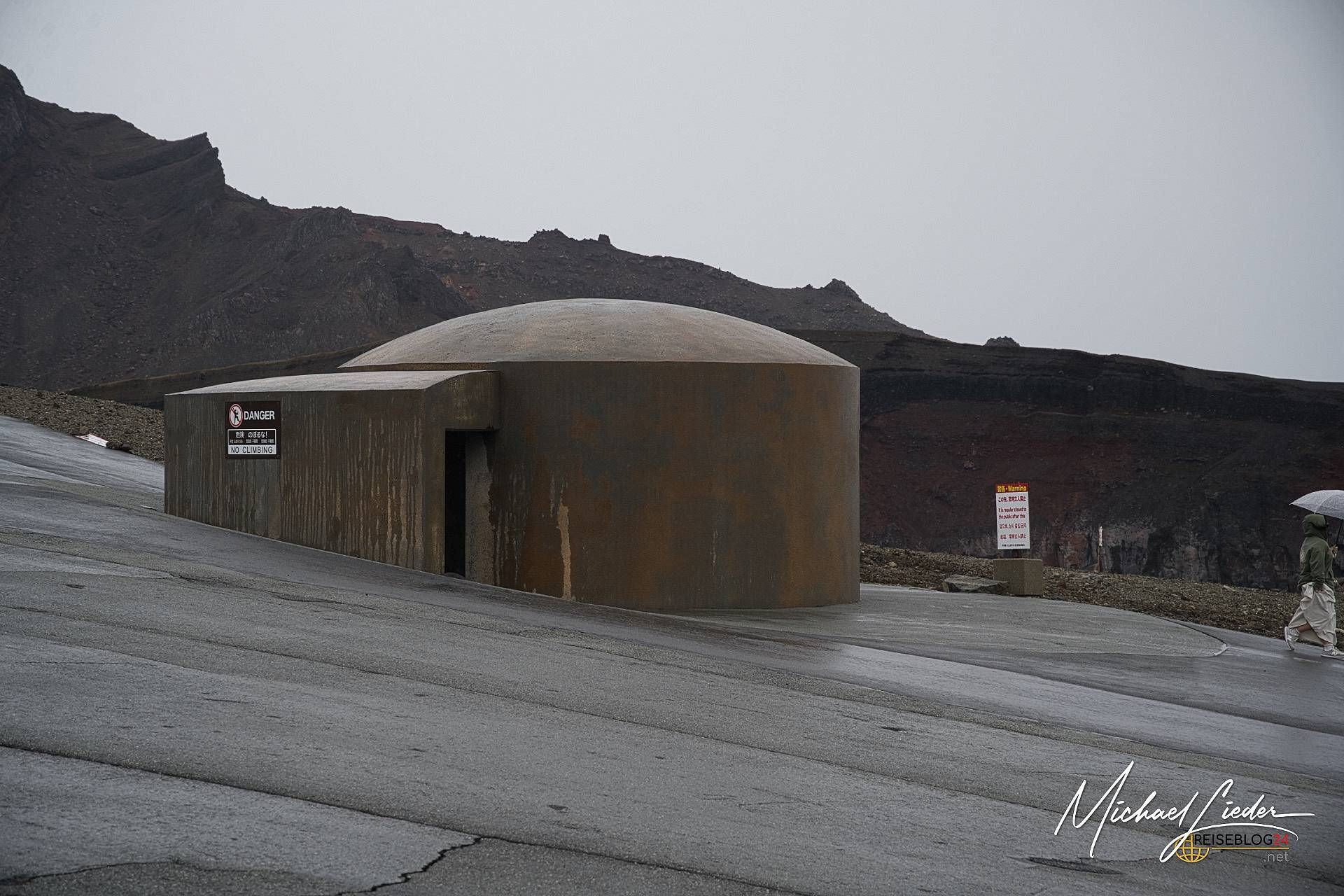 Am nächsten Morgen wagen wir einen zweiten Anlauf. Und was sollen wir sagen? Jackpot! Der Aso empfängt uns diesmal mit blauem Himmel, vereinzelten Wolken und einer Sicht, die besser nicht sein könnte. Es wirkt fast so, als hätte sich der Vulkan überreden lassen, uns doch noch einen Blick in seine Seele zu gewähren. Dieses Mal sehen wir den Krater in voller Pracht: türkisblauer See, dampfende Schlote, steil abfallende Wände – eine bizarre, fast außerirdische Landschaft. Und rundherum? Nichts als Natur und Weite. Es ist einer dieser seltenen Reisemomente, in denen alles passt. Kamera gezückt, Augen weit geöffnet, Herz kurz still. Und plötzlich wird klar, warum man sich am Tag zuvor durch Regen und Gaswarnung gekämpft hat. Wer genau hinschaut, auf dem Platz vor dem Vulkan stehen massive Betonbauten (Bunker), die bei einem Ausbruch unmittelbaren und schnellen Schutz liefern sollen, uns wird klar, hier brodelt ein aktiver Vulkan. Was dieser ausrichten kann, hatte ich schon aus Sulawesi berichtet, hoffentlich kommt es hier niemals zu einer Tragödie. Die Ranger sind auf der Hut und bewachen ihren Vulkan ganz genau, damit nichts passiert.