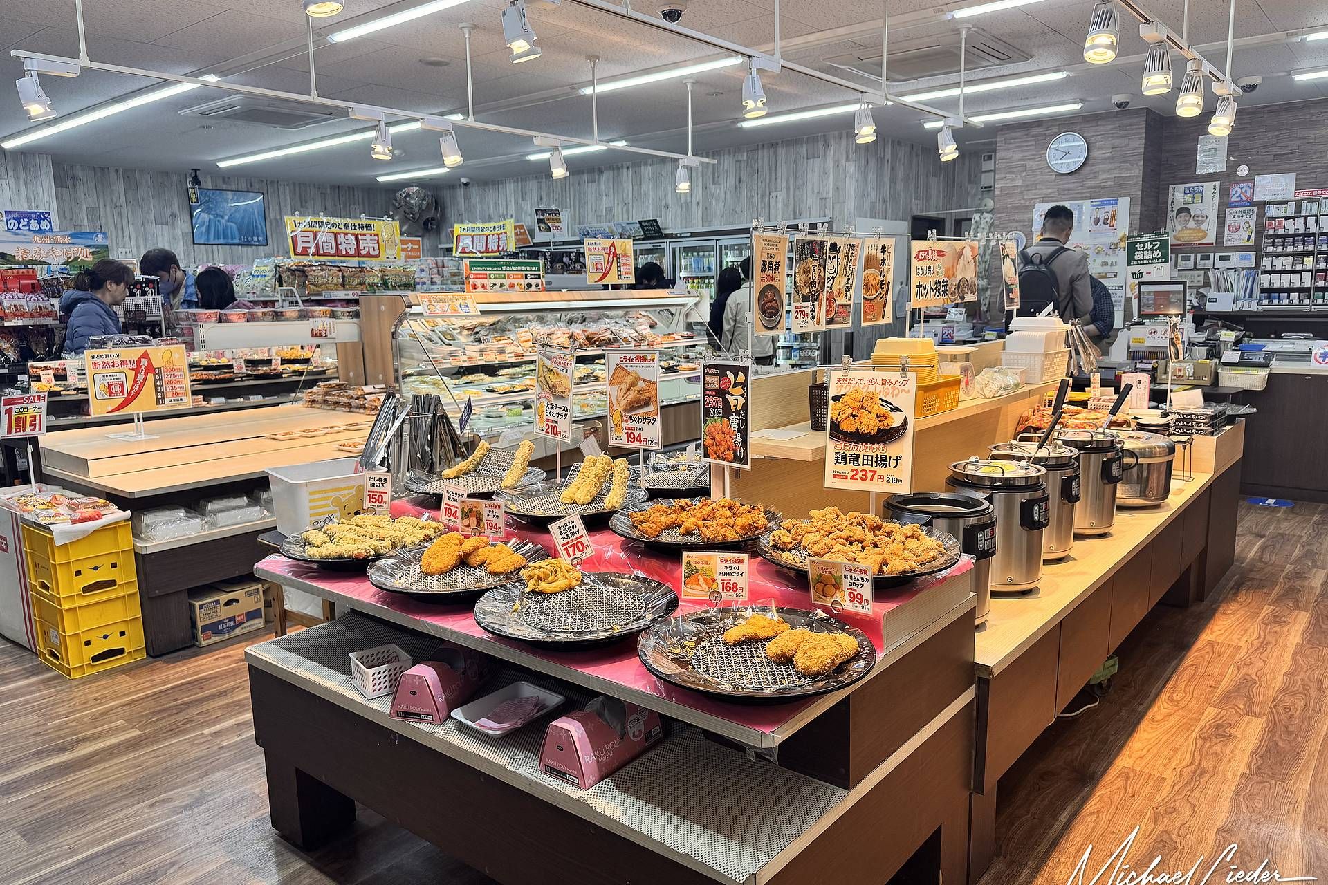 Innen: eine seltsame, aber funktionierende Mischung. Links der Supermarktbereich mit frischen Zutaten, Getränken, einem beeindruckenden Instant-Nudel-Regal und – natürlich – einer Mikrowelle für alle, die ihr Bento noch in die richtige Temperaturzone bringen wollen. Rechts: ein winziger Essbereich mit Tischen aus Resopal, Plastikwasserkrügen zum Selbstbedienen und einem Bestellautomaten, der aussieht, als hätte er schon unter Hirohito funktioniert – aber er tut’s noch! Menü drücken, Barzahlung einwerfen, Wartenummer abreißen.
