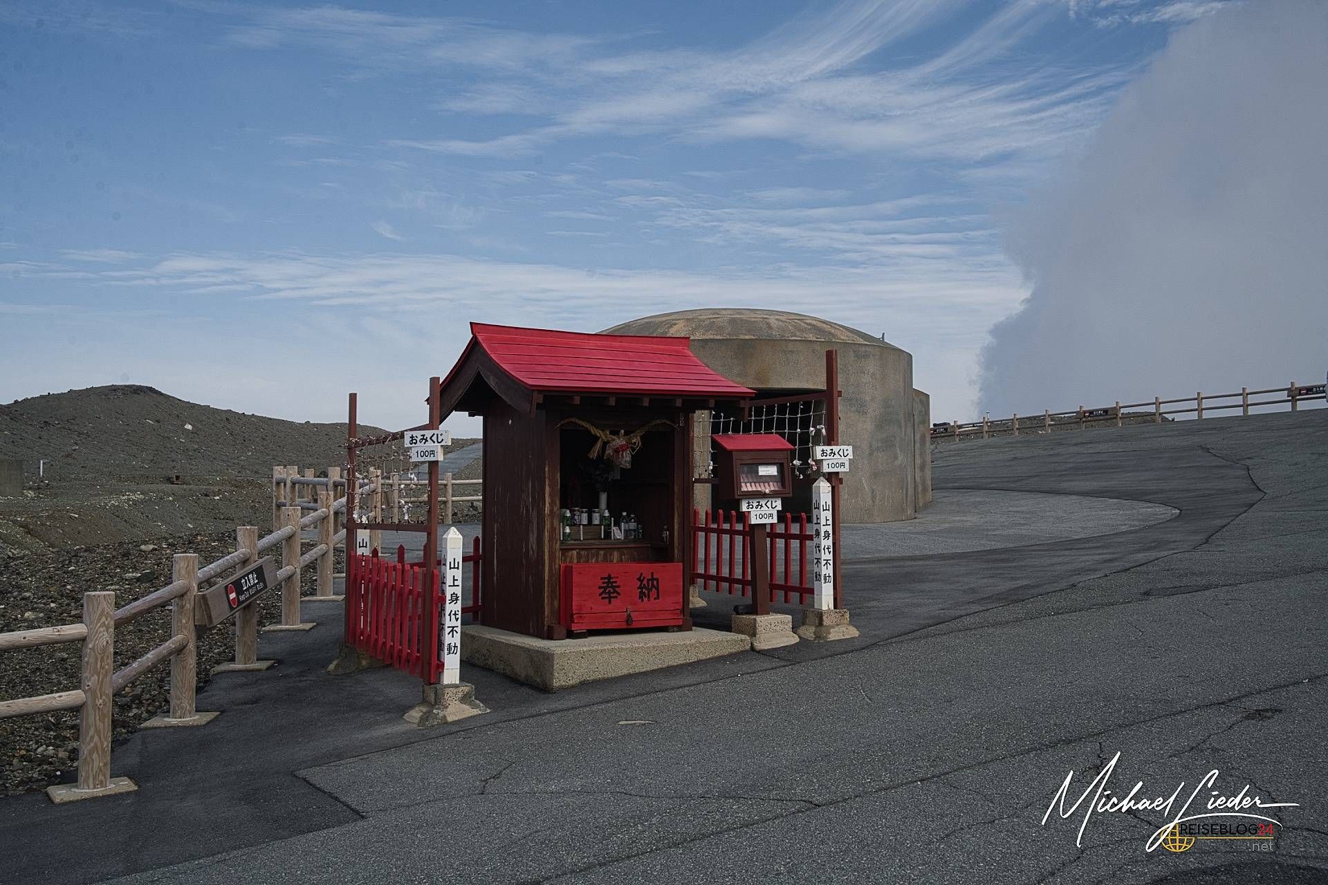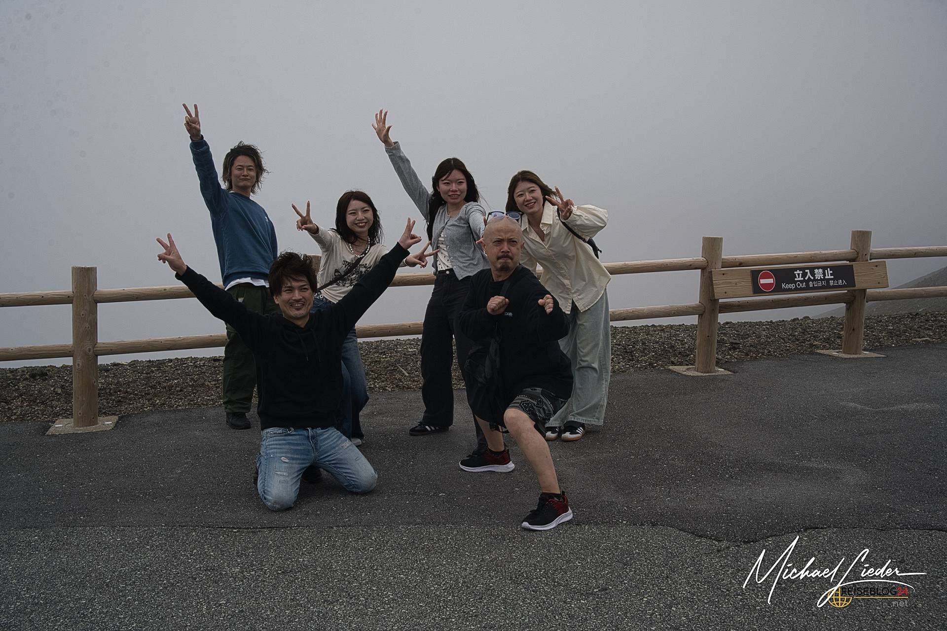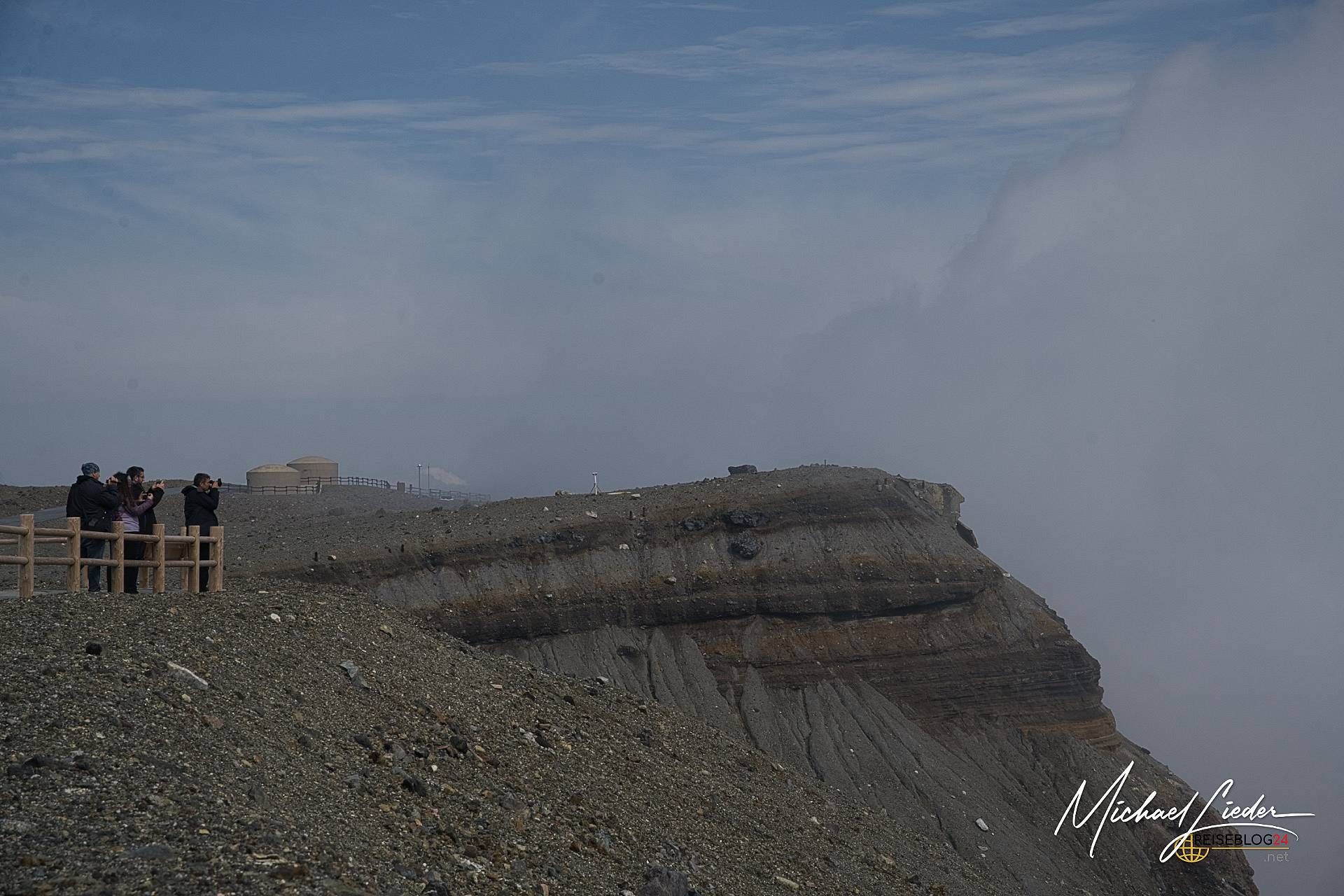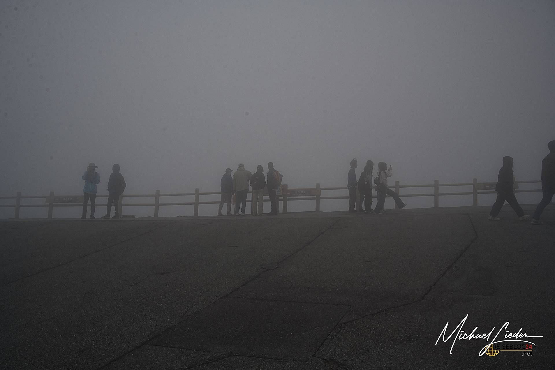 Der Aso-Kuju Nationalpark hat an diesem Sonntag nur eines im Angebot: dramatische Atmosphäre. Das Wetter zeigt sich von seiner ruppigen Seite – kalt, nass, neblig. Über dem Vulkankegel ziehen dichte Schwaden hinweg, als wollten sie die Landschaft mit einem Schleier des Geheimnisvollen überziehen. Es ist fast gespenstisch. Und doch irgendwie beeindruckend. Trotz dieser wenig einladenden Bedingungen versuchen wir, zumindest ein Stück der ausgeschilderten Wanderroute am Krater entlang zu gehen. Die Szenerie hat definitiv ihren Reiz – wenn man mystische Naturstimmungen mag und nicht bei jedem Regentropfen fluchtartig umdreht. Der Krater selbst liegt allerdings tief im Nebel verborgen. Wir sehen… nichts. Kein Krater, kein Kratersee – nur eine milchige Wand aus Dunst. Als wir gerade am Kraterrand stehen, wird der Bereich plötzlich evakuiert. Die Gase aus dem Inneren des Vulkans haben sich so verdichtet, dass sie gesundheitsschädlich werden. Kein Scherz. Also Rückzug. Wir harren im Auto aus, wie viele andere auch – der Parkplatz ist trotz Wetterlage gut gefüllt, sogar Reisebusse stehen hier. Offenbar sind wir nicht die einzigen, die auf ein Wetterwunder hoffen. Und siehe da – nach etwa einer Stunde klart es tatsächlich ein wenig auf. Die Nebelschwaden lichten sich, es regnet zwar weiter, aber nun kann man bis zum Kratersee hinabblicken. Endlich! Ein Blick in die Tiefe, der einen daran erinnert, welche Urkraft in einem aktiven Vulkan steckt. Ehrfurcht inklusive.