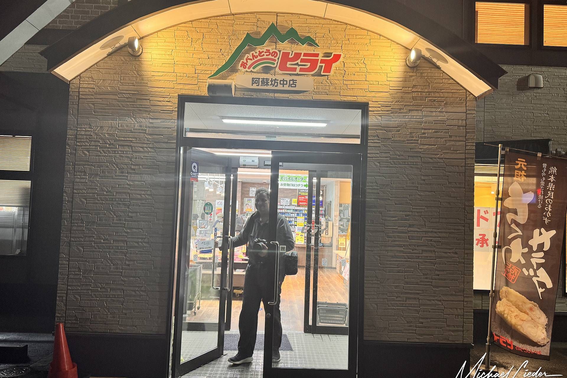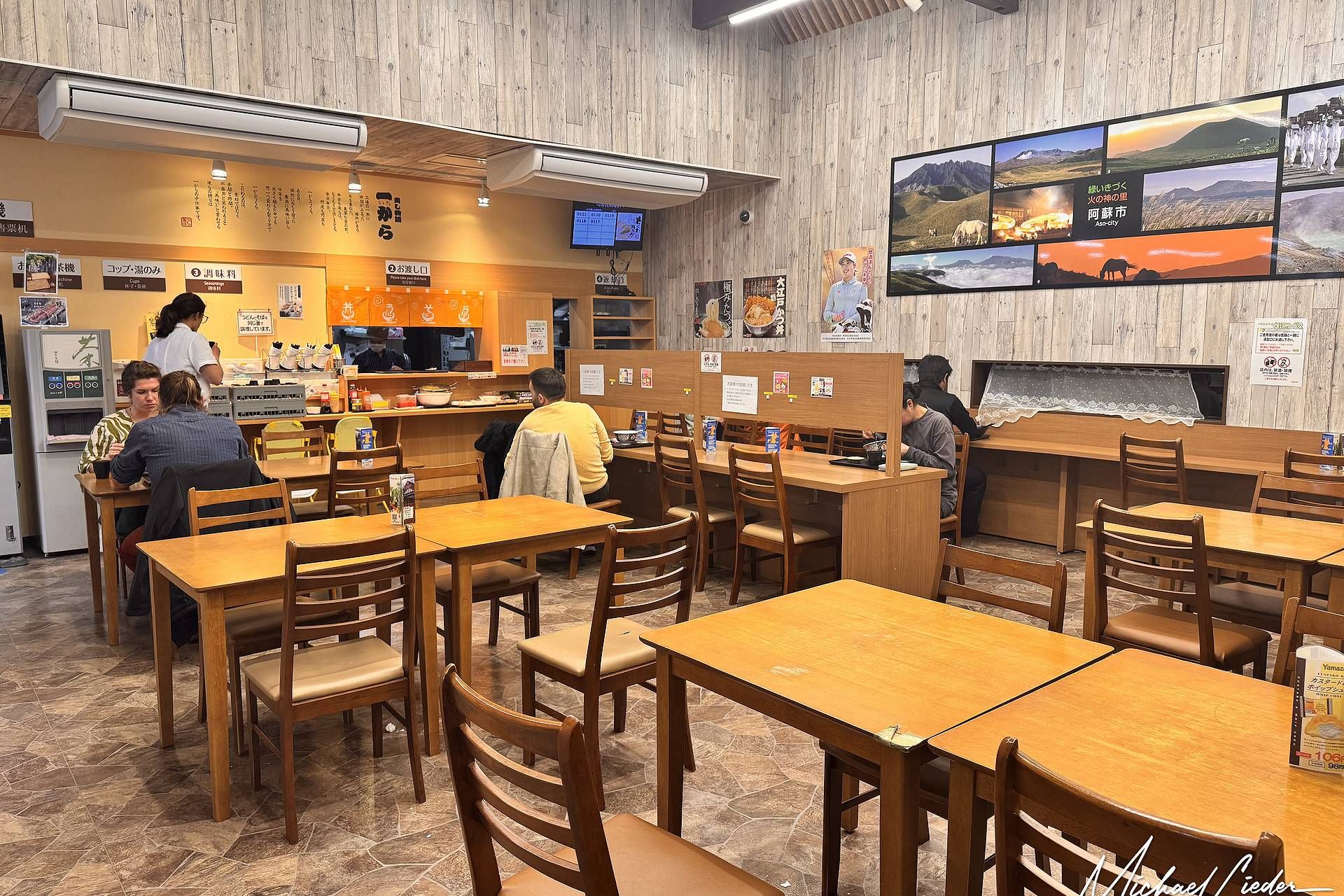 Es regnet. Schon wieder. Der Vulkan Aso hüllt sich in Nebel, unsere Regenjacken kleben uns wie feuchte Servietten am Leib, und die Laune ist irgendwo zwischen „leicht angesäuert“ und „Was machen wir hier eigentlich?“. Die Straßen sind leer, die Sicht miserabel, und unser Magen macht Geräusche wie ein schlecht gelaunter Waschbär. Und dann taucht sie auf: die Rettung. Von außen kaum erkennbar – ein rechteckiger Flachbau mit Neonlicht, irgendwo zwischen Dorfsupermarkt, Kantine und Bushaltestelle aus den 80ern.