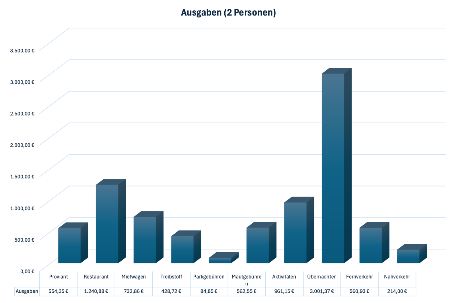 Proviant | 554,35 € | Alles, was wir am Tag gebraucht haben: Frühstück, Getränke, Snacks etc. |