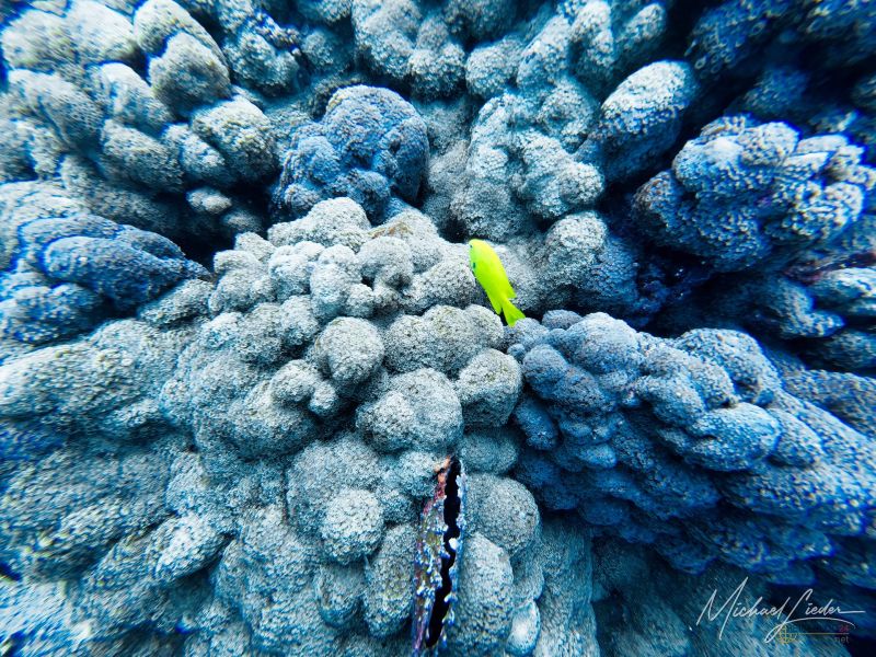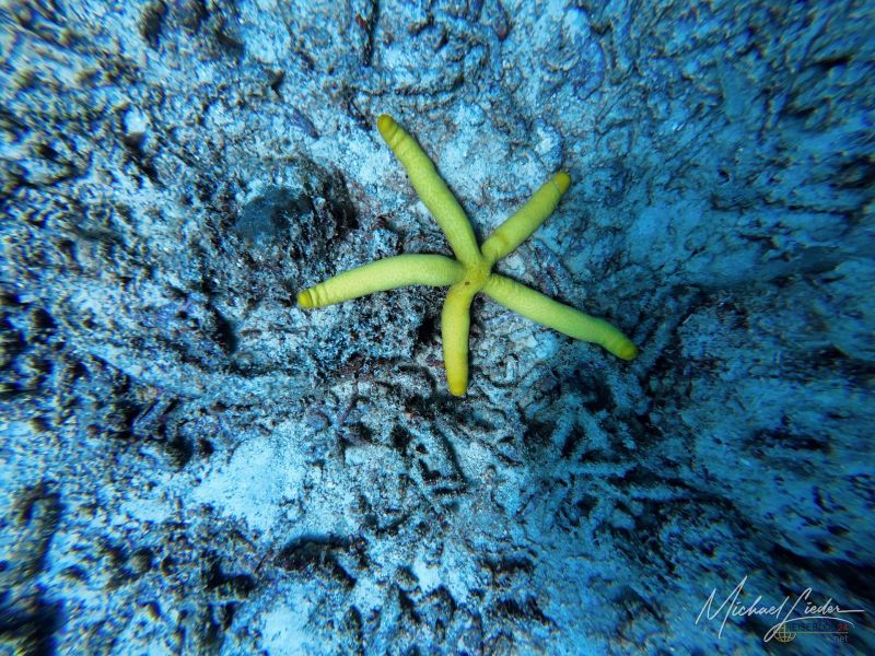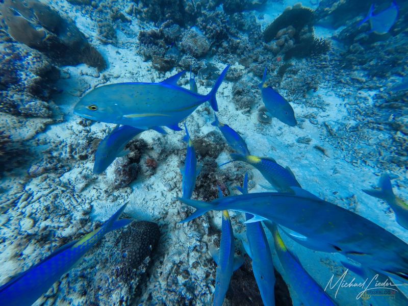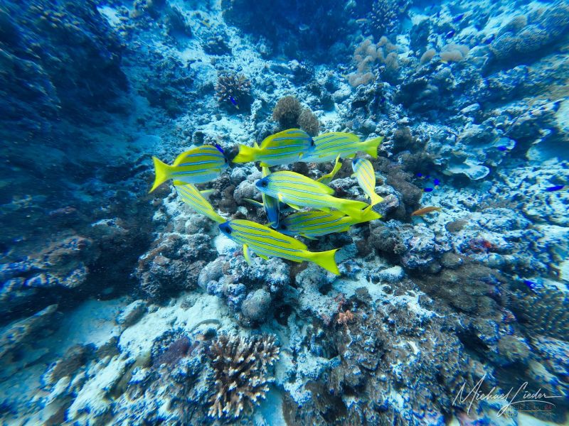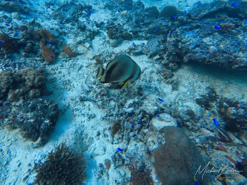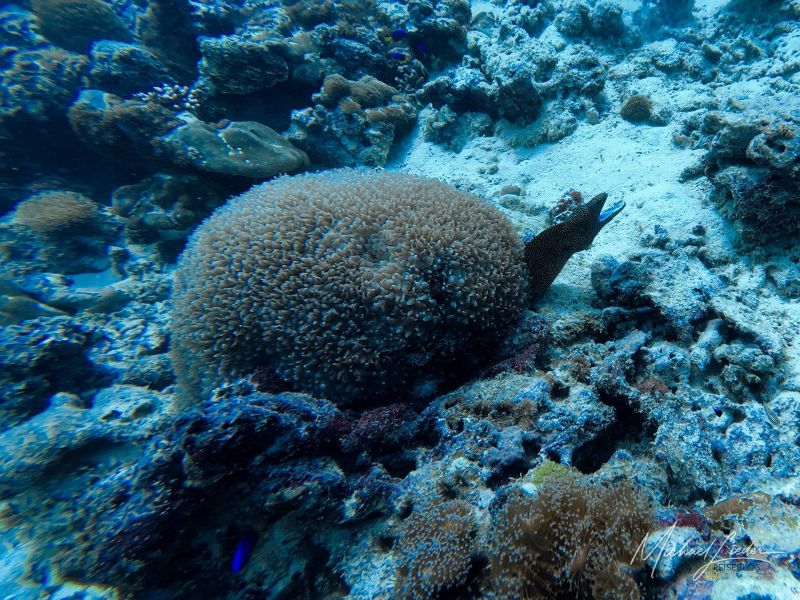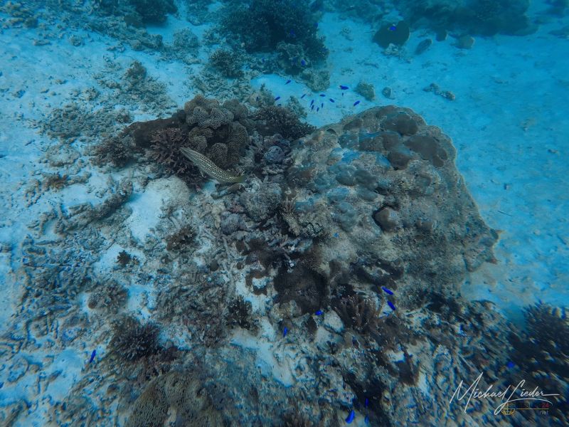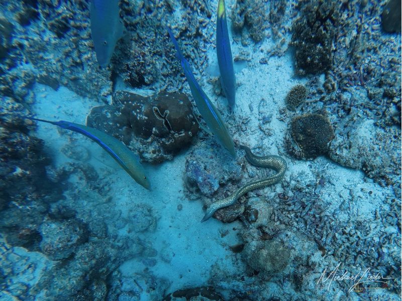 Zwischen all dem entdecke ich Anglerfische, Meeresgoldlinge, Rotstreifen-Husaren, Scherenschwanz-Sergeanten, Rippen-Falterfische und die kantig wirkenden Kofferfische. Besonders faszinierend – und ein wenig unheimlich – sind die gelben Geistermuränen, die in Felsspalten zwischen den Riffen wohnen. Eine davon schlängelt sich direkt unter mir über den Sandboden, nur um dann blitzschnell in einer kleinen Höhle zu verschwinden. Kurz darauf lugt ihr Kopf wieder hervor – mit diesem typischen Ausdruck von „Du kommst hier nicht rein“.