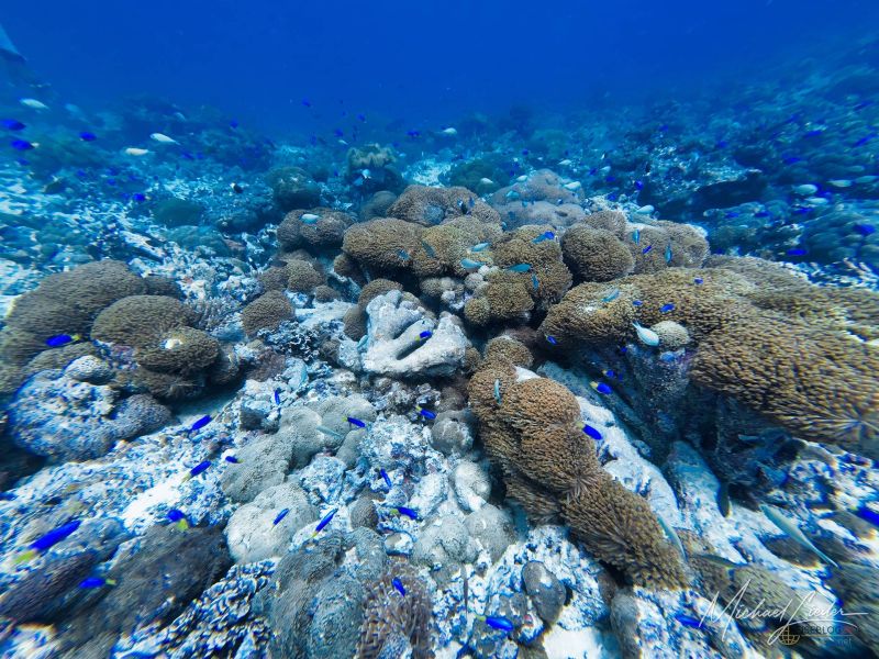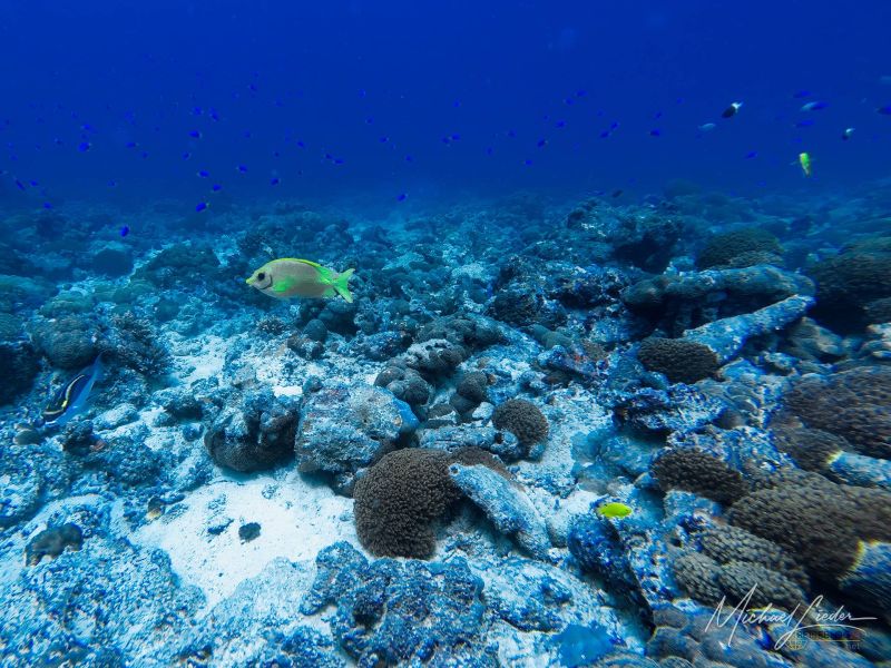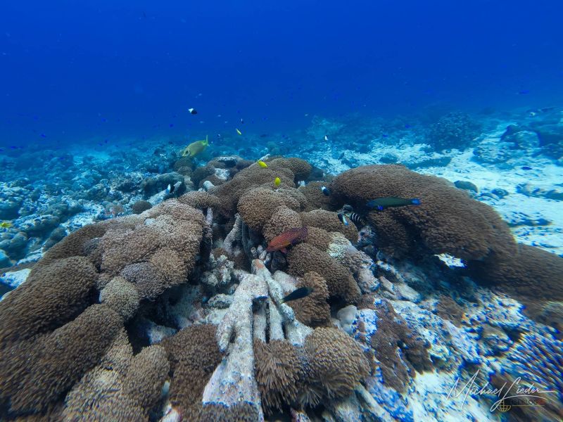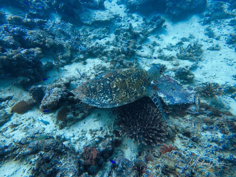 Trotzdem – das Leben hält sich tapfer. Zwischen den verblassten Korallen tummeln sich kleine Gruppen von Fischen, keine dichten Schwärme, eher Familienverbände, die ihre eigene Ordnung im Chaos bewahren. Dann, endlich, ein Moment zum Staunen: mehrere Meeresschildkröten gleiten gemächlich vorbei, als hätten sie alle Zeit der Welt.