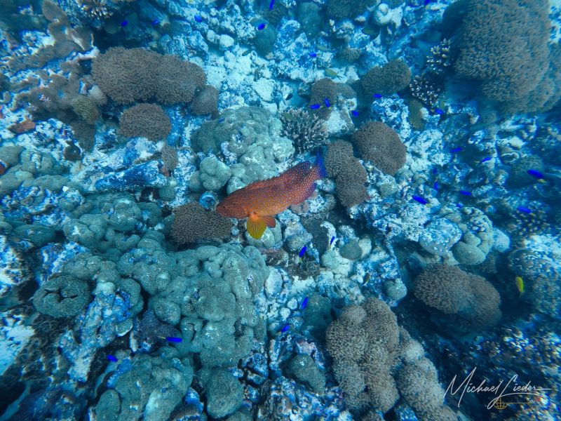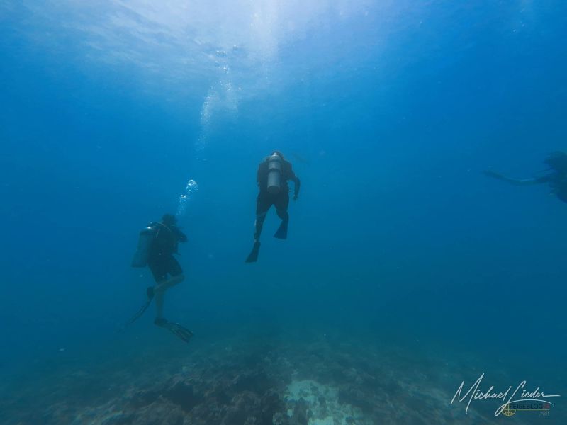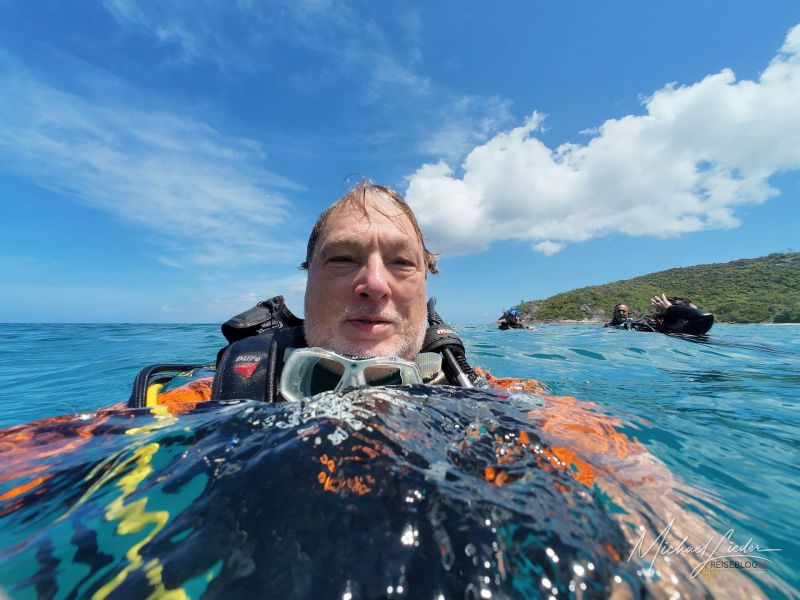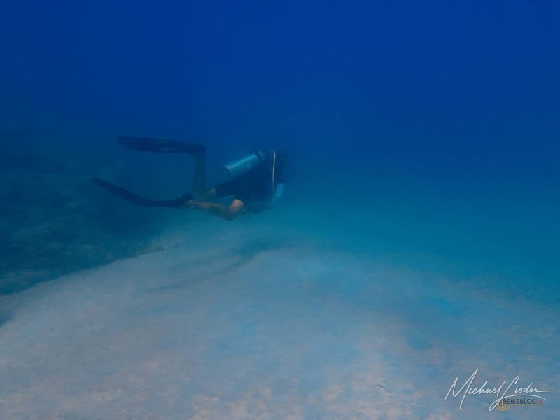 Das Wasser ist warm – fast einladend wie eine Badewanne mit Aussicht. Später, beim Blick auf mein Computerprofil, sehe ich es schwarz auf weiß: 28 Grad Lufttemperatur, 26,7 Grad am tiefsten Punkt. Meine Entscheidung für den Shorty war also goldrichtig. Wer hier im Vollanzug taucht, muss wohl eine persönliche Abmachung mit der Kälte haben.