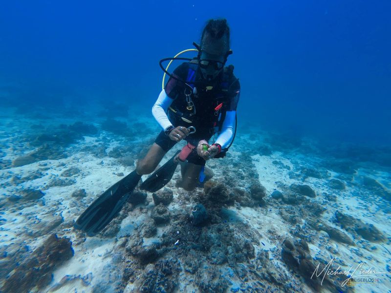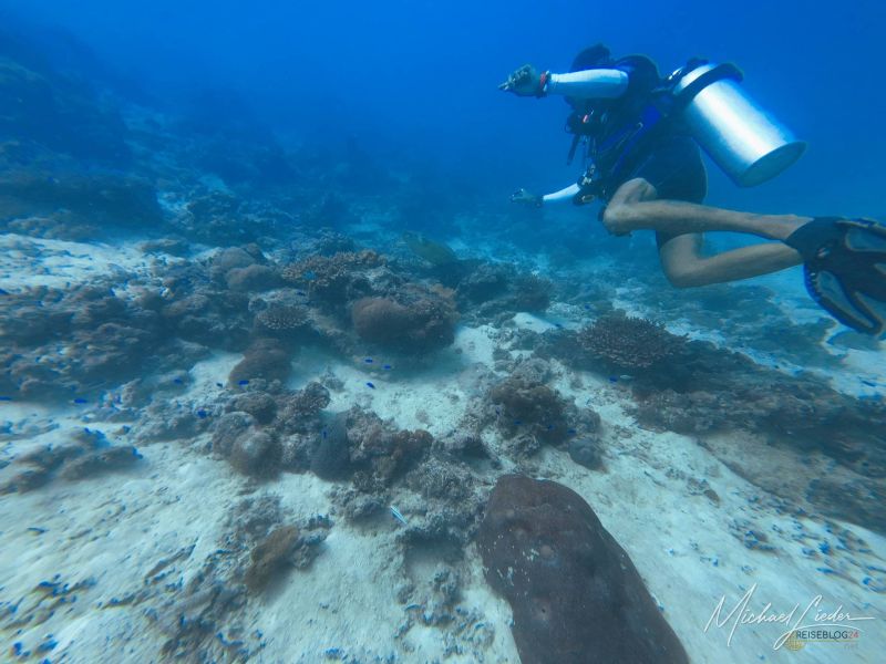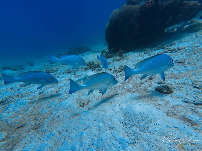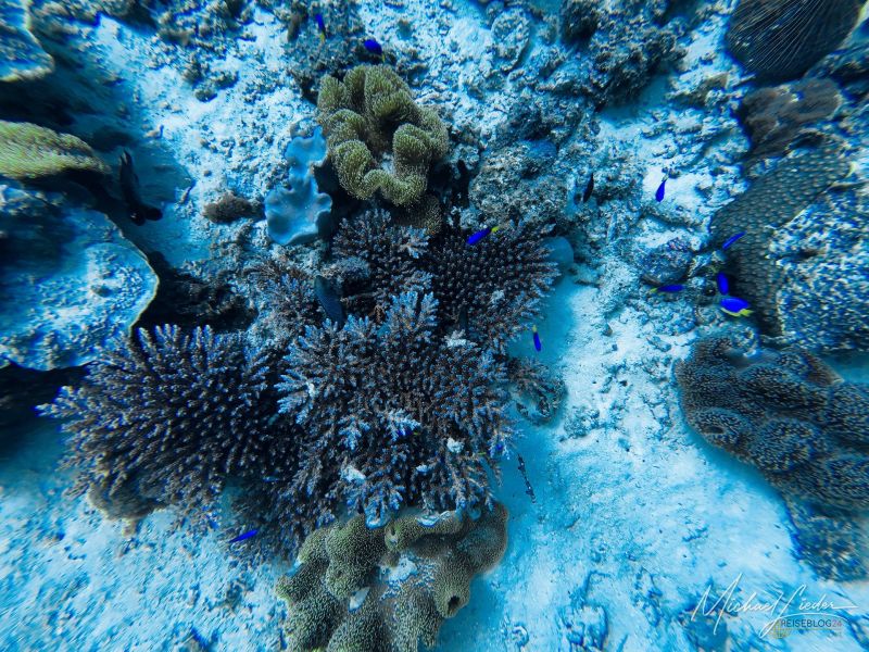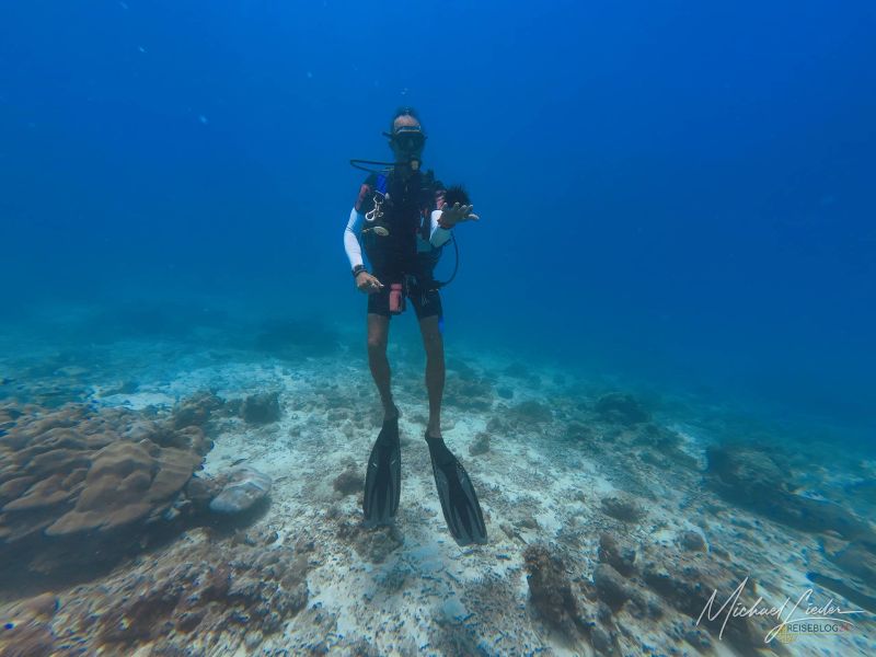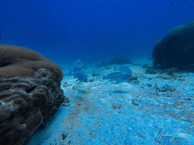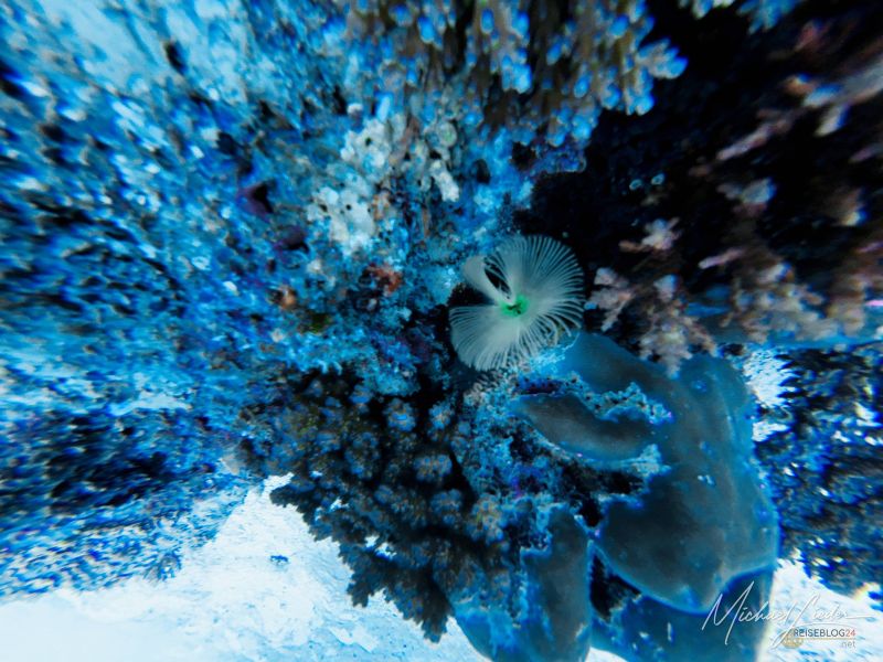 Schon beim ersten Abtauchen umfängt mich diese geliebte, fast meditative Ruhe unter Wasser. Nur mein Atem – gleichmäßig, beruhigend, fast hypnotisch. Fische ziehen vorbei, Korallen in Pastelltönen, als hätten sie sich für Reiseblog24 extra in Schale geworfen. Und für einen Moment denke ich: Ja, vielleicht ist es das tatsächlich – das Paradies, von dem alle reden.