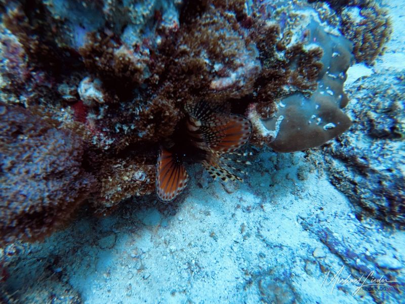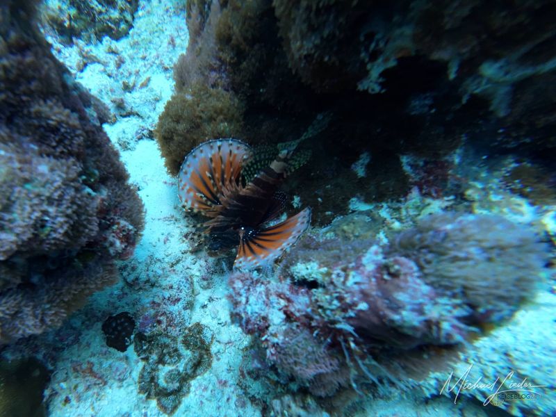 Es sind keine großen Mengen, keine überwältigende Parade – eher ein stilles, intimes Theater. Und dann, in einer Felsspalte, thronen sie: Rotfeuerfische, majestätisch und fast dramatisch, ihre langen Flossen wie wehende Schleier im Licht. Wunderschön – und zugleich gefährlich. Denn Schönheit hat hier unten oft scharfe Kanten; ein falscher Griff, und sie sticht zurück.