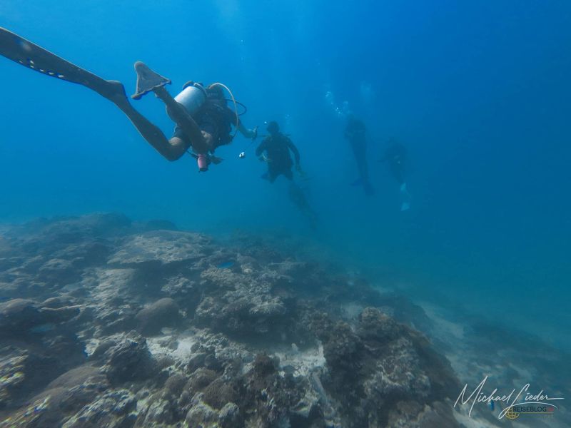 Wenn ich ehrlich bin, hatte ich mir mehr erwartet. Die Seychellen werden oft als Paradies für Taucher gepriesen – doch wer schon einmal im Roten Meer abgetaucht ist, weiß, dass dort die Farben intensiver leuchten, die Riffe lebendiger pulsieren. Hier dagegen wirkt alles … gedämpfter. Nicht trostlos, aber ruhiger, ernster vielleicht. Auf unserem Weg in die Tiefe liegen viele abgestorbene Korallen – bleich, zerbrechlich, beinahe geisterhaft. Es erinnert mich an Thailand, wo große Teile der Unterwasserlandschaft der Korallenbleiche zum Opfer gefallen sind. So schlimm ist es hier nicht, nein – aber auch auf den Seychellen trägt das Meer sichtbare Narben.