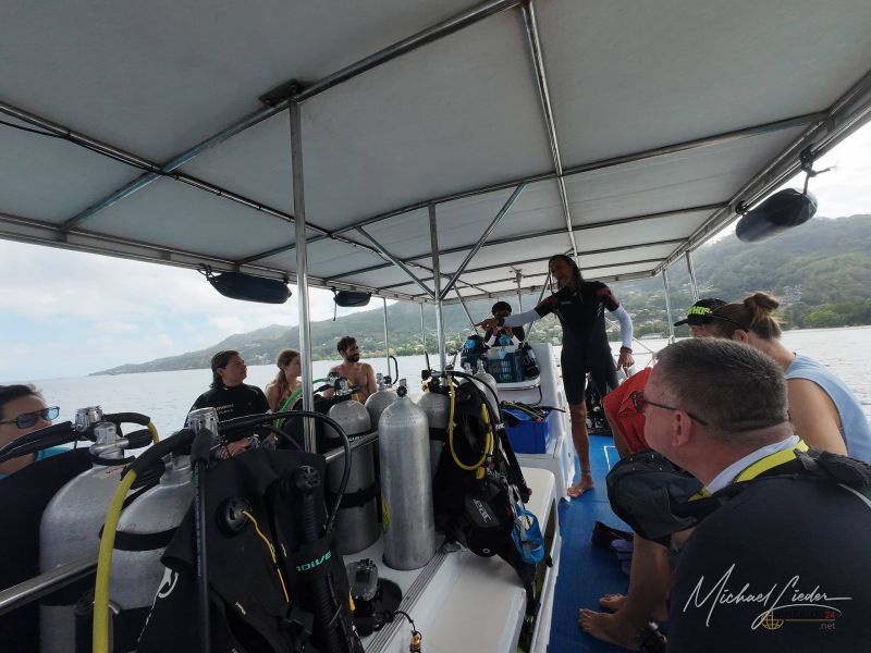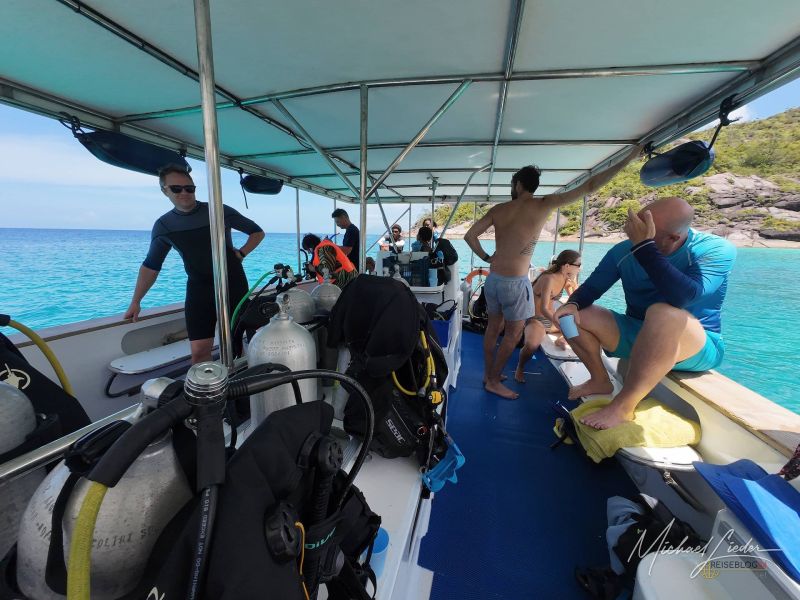 Mein Startpunkt: die Tauchbasis Blue Sea Divers am Beau Vallon Beach. Von dort geht es mit dem Boot hinaus – hinaus zu einer ersten, vielleicht unvergesslichen Begegnung mit einer Unterwasserwelt, die ich bisher nur aus Erzählungen kannte. Meine eigene Ausrüstung habe ich dabei; nur Flasche und Blei bekomme ich vor Ort. Mein Buddy ist da weniger autark – und überhaupt ist unsere kleine Gruppe ein buntes Sammelsurium aus neugierigen Abenteurern: ein paar Deutsche, einige Russen und Menschen aus allen Ecken der Welt. Von den rund zwanzig Mitreisenden bleiben am Ende nur sechs, die wirklich tauchen – der Rest begnügt sich mit der Aussicht durchs Schnorchelrohr.