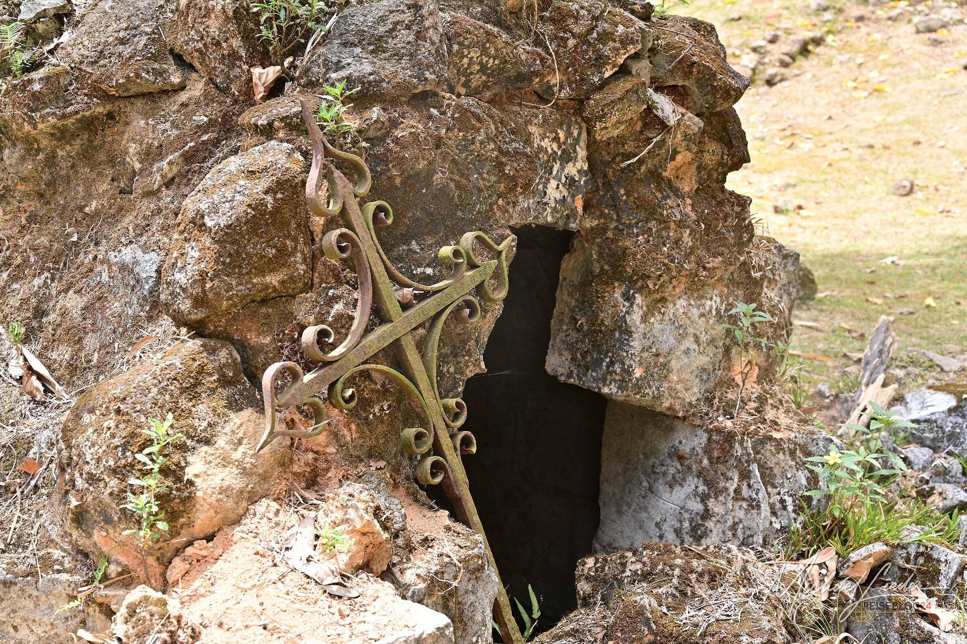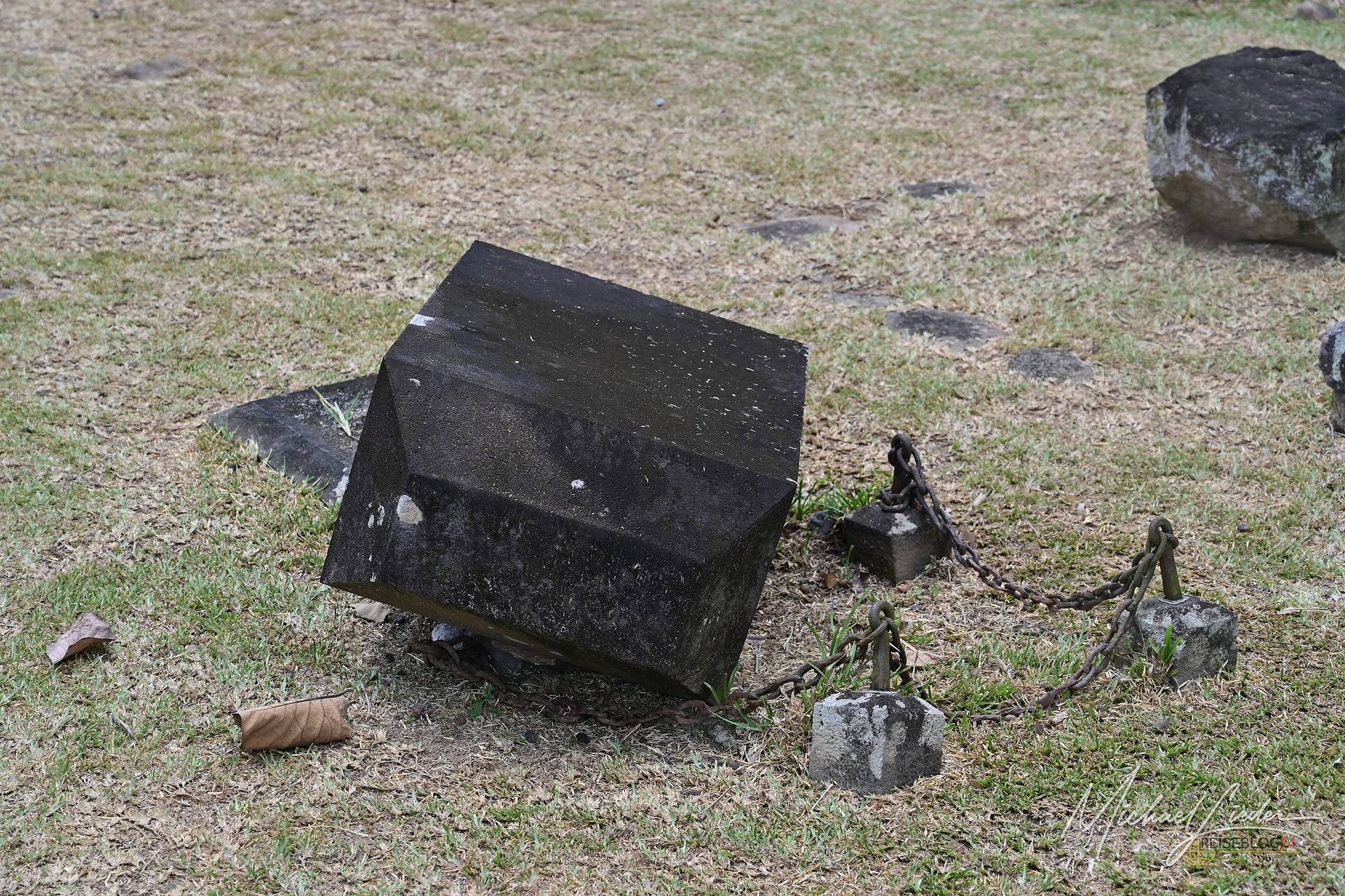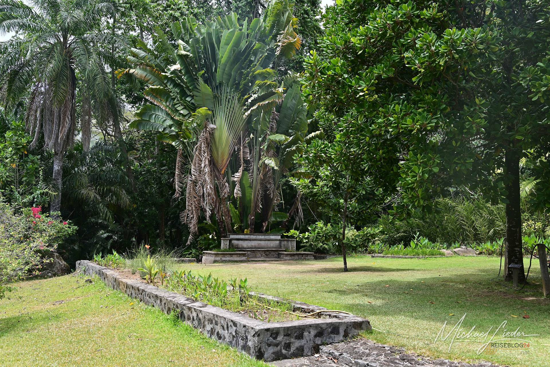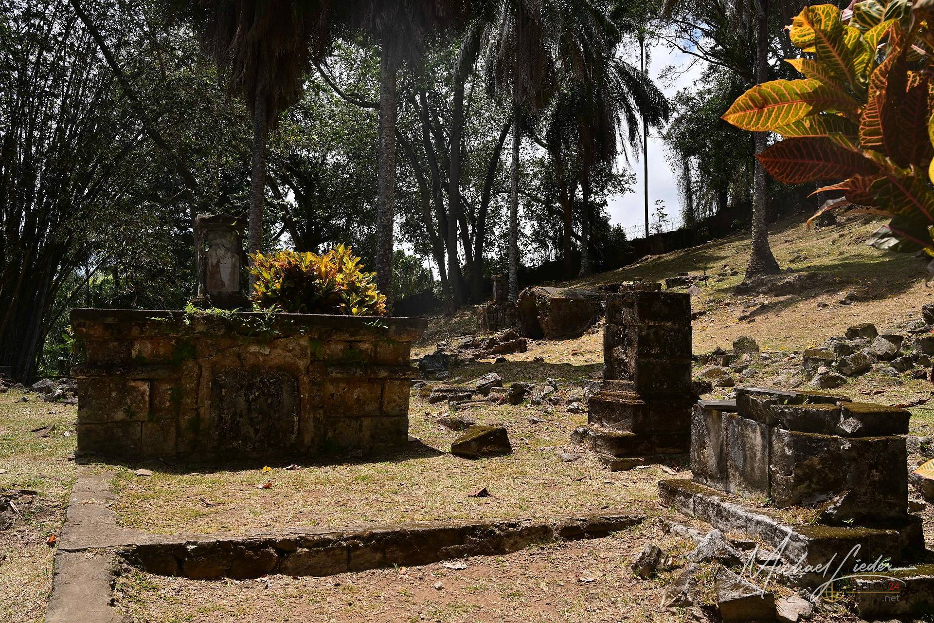 Ein Stück weiter oben, halb vom tropischen Grün verschluckt, steht ein einzelnes Grabdenkmal – leicht schief, vom Wetter gezeichnet, aber mit einer Würde, die selbst die Jahre nicht auslöschen konnten. Die Inschrift ist französisch und erzählt von Ernest R. Molloy, gestorben am 15. Mai 1863, gebürtig aus King’s County, Irland. Man fragt sich unwillkürlich, wie weit dieser Mann gereist war, bevor er hier – auf einer Insel mitten im Indischen Ozean – seine letzte Ruhe fand.