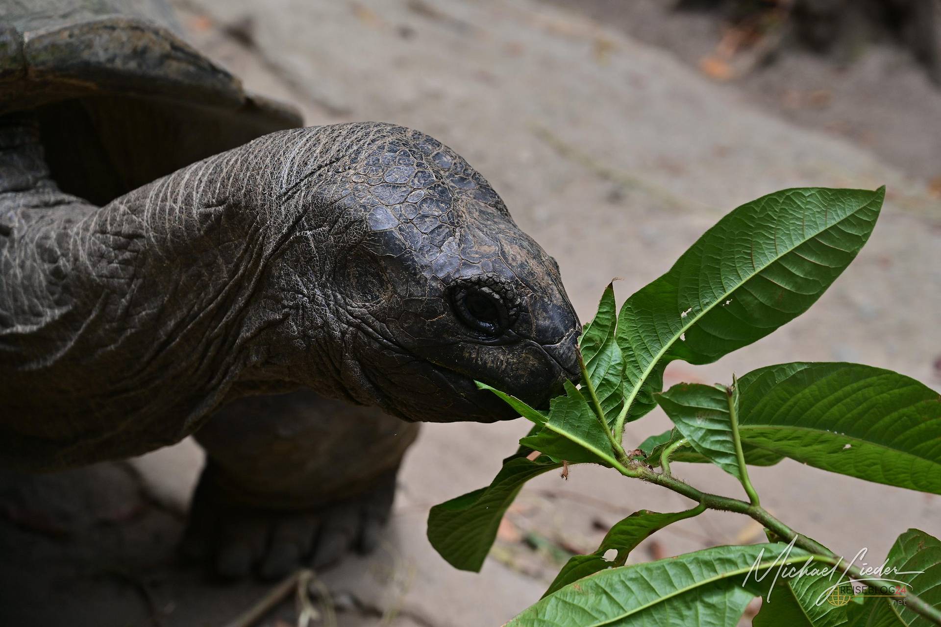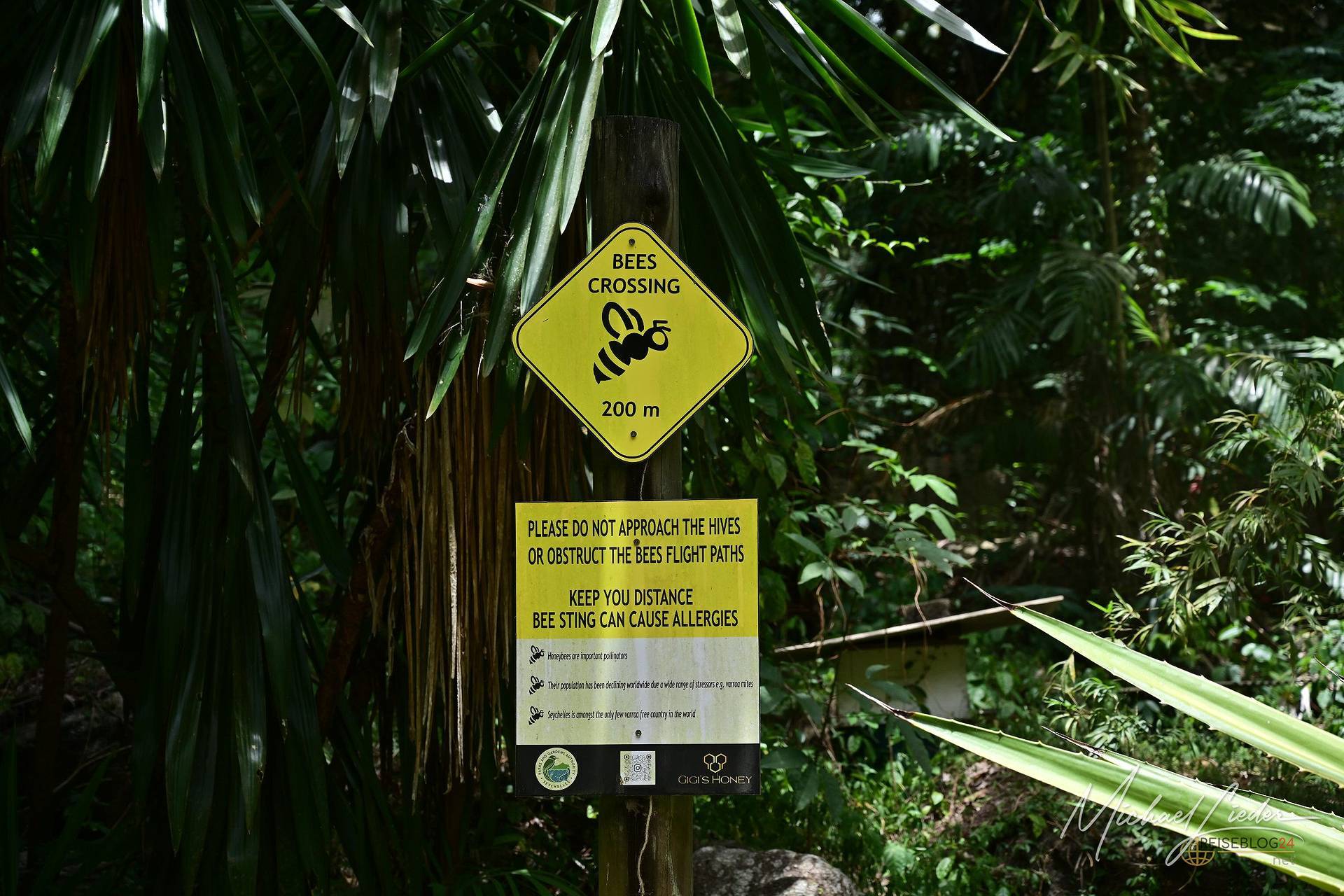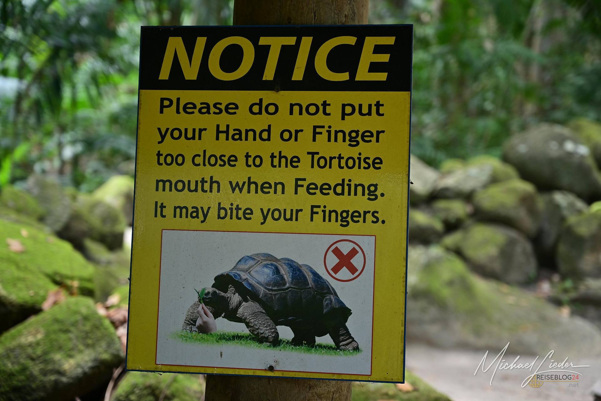 Unser Weg führt weiter – vorbei an Teichen, tropischen Bäumen und schließlich zu den eigentlichen Stars des Gartens: den Aldabra-Riesenschildkröten. Diese Giganten sind mehr als nur ein Fotomotiv – sie sind lebende Fossilien, Nachfahren jener Tiere, die einst auf den Inseln des Indischen Ozeans die Welt unter sich hatten. Man könnte fast glauben, sie wüssten das – so gelassen, wie sie durch ihr Gehege schlurfen. Ein Schild warnt: „Vorsicht, aggressive Bienen!“ – und am Gehege der Schildkröten, sinngemäß: „Finger nicht als Futter verwenden.“ Ein Ratschlag, den man sich merken sollte, wenn man den Tieren frisches Grün aus der bereitgestellten Kiste anbietet. Sie sehen zwar gemächlich aus, aber wenn’s ums Mittagessen geht, sind manche erstaunlich schnell.