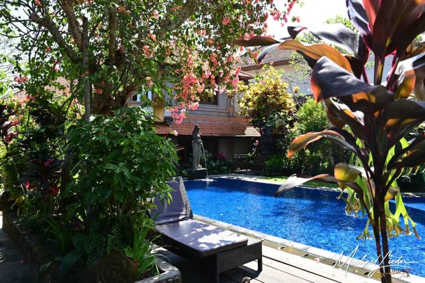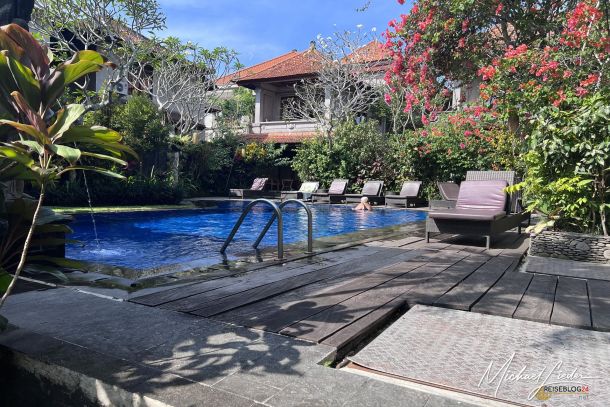 Durch die wunderschöne parkähnliche Anlage, bunte Blumenpracht und ausgesprochen gepflegte Umgebung, kommt keine Langeweile auf. Es gibt zentral in der Anlage einen wunderschönen Pool. Der Poolbereich ist gepflegt und wird tagsüber ständig überprüft und sauber gehalten. Wenn man am Pool vorbeischaut und es sich dort ein paar Affen aus dem benachbarten Monkey Forrest gemütlich gemacht haben, merkt man, dass es doch ein wenig anders als bei uns in Europa ist. Einen Aufenthalts oder Sportbereich gibt es im Hotel nicht.