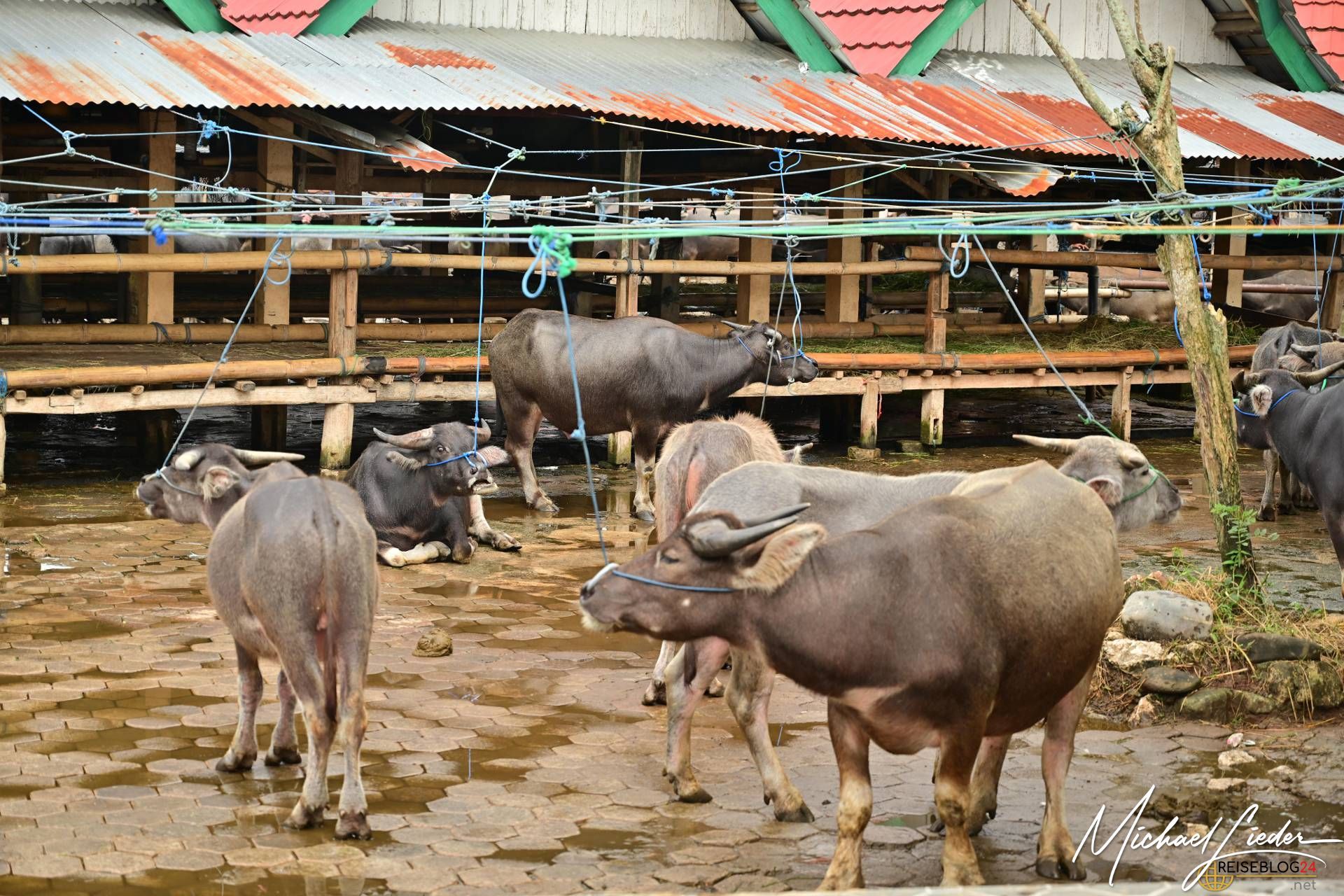 Wir beobachten fasziniert das Feilschen der Händler, während sie Wasserbüffel, Schweine und andere Waren verkaufen. Tauchen ein in die Farben, Gerüche und Klänge dieses einzigartigen Marktes. Interessant ist auch der Umgang mit den Tieren, sie werden so weit wir es beobachten konnten respektvoll behandelt. Keine Hektik, kein Schlagen oder treten sieht man hier auf dem Markt. Die Wasserbüffel werden sogar regelmäßig geduscht und sogar gewaschen um einen guten Eindruck auf die neuen Besitzer zu machen. Die meisten von den Wasserbüffeln und Schweinen haben einen langen Weg hinter sich und kommen aus anderen Regionen Sulawesis oder werden gar aus den umliegenden Ländern importiert. Nicht nur für die Beerdigungszeremonien werden sie hier verkauft, auch als Arbeitstiere, zur Zucht oder als Kapitalanlagen sind die riesigen Büffel gedacht.