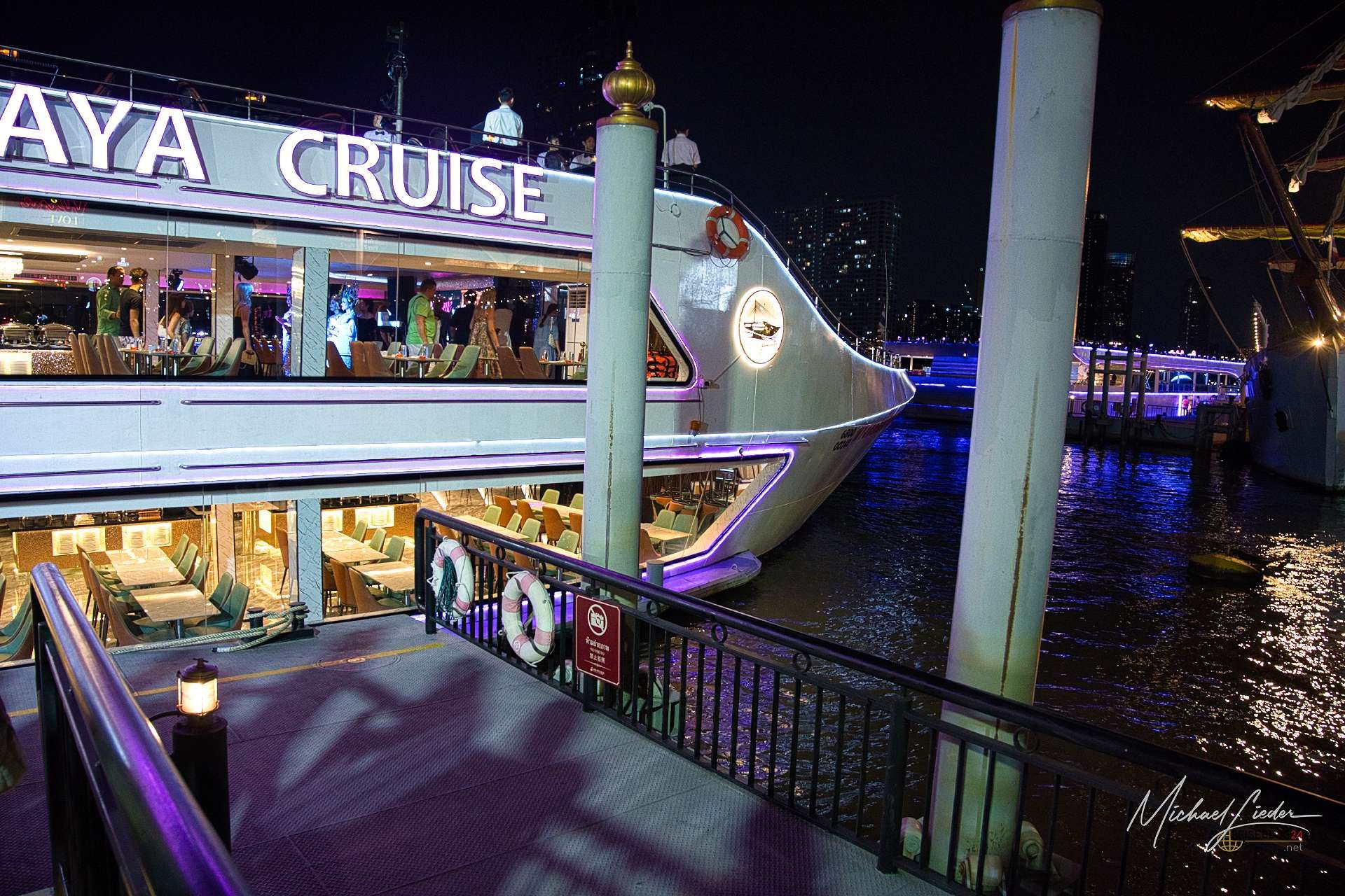 Die Warteschlange fürs Boarding hatte ihre ganz eigene Dramaturgie. Fünf Reihen, dicht gedrängt, irgendwo zwischen Vorfreude und der leisen Erkenntnis, dass man hier gerade Teil eines ziemlich gut organisierten Massenereignisses ist. Alle wollten dasselbe: Bangkok bei Nacht vom Wasser aus erleben. Also standen wir da, eingeklemmt, geduldig, und haben uns langsam Richtung Schiff vorgearbeitet.
