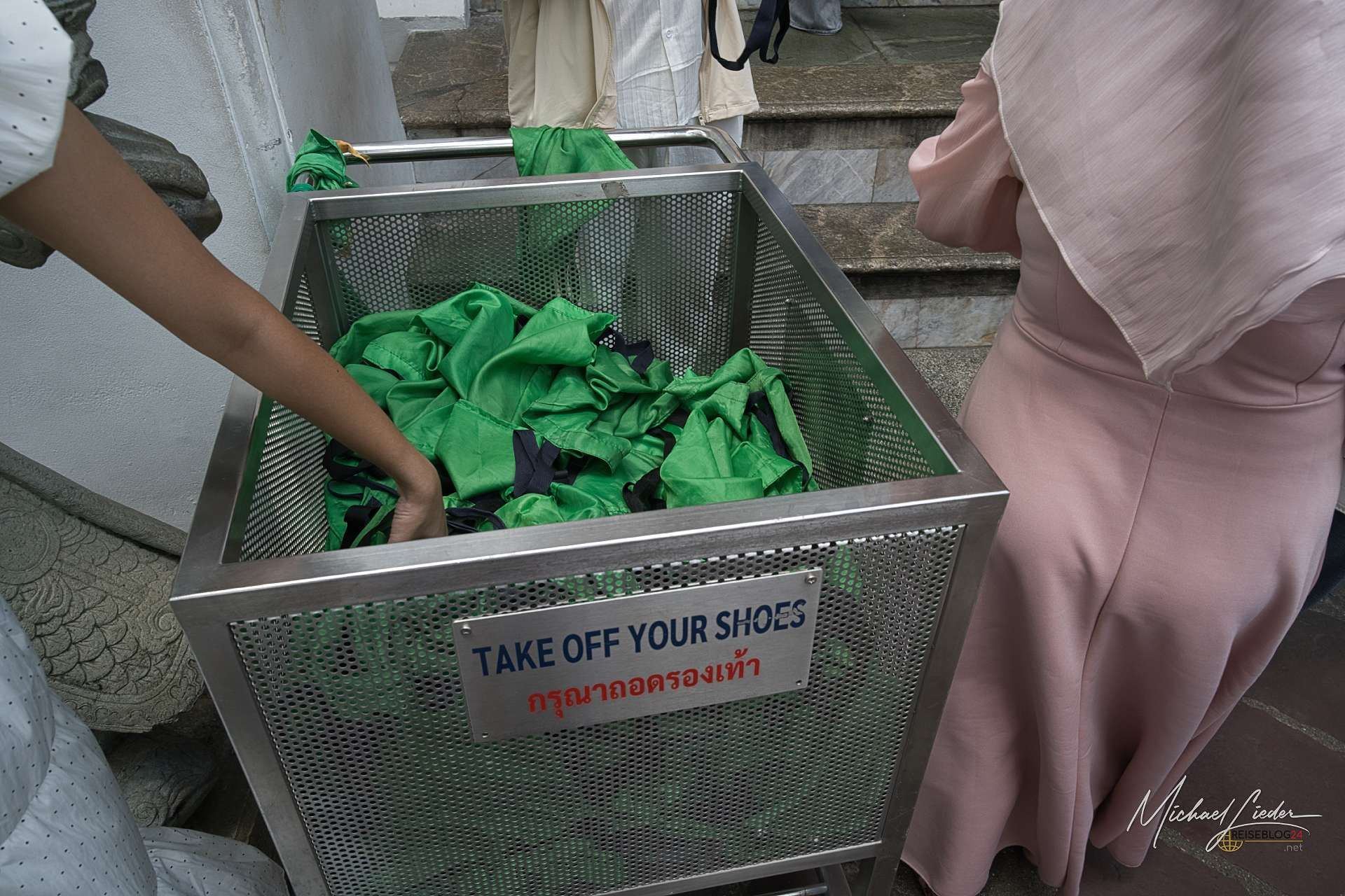 Praktisch wird es dann am Buddha selbst: Schuhe ausziehen, rein in den bereitgestellten grünen Sack und mitnehmen. Ein kleiner, fast beiläufiger Moment – aber genau solche Details bleiben hängen. Wat Pho ist kein Ort der Stille. Er ist laut, lebendig, manchmal chaotisch – und genau deshalb so faszinierend.