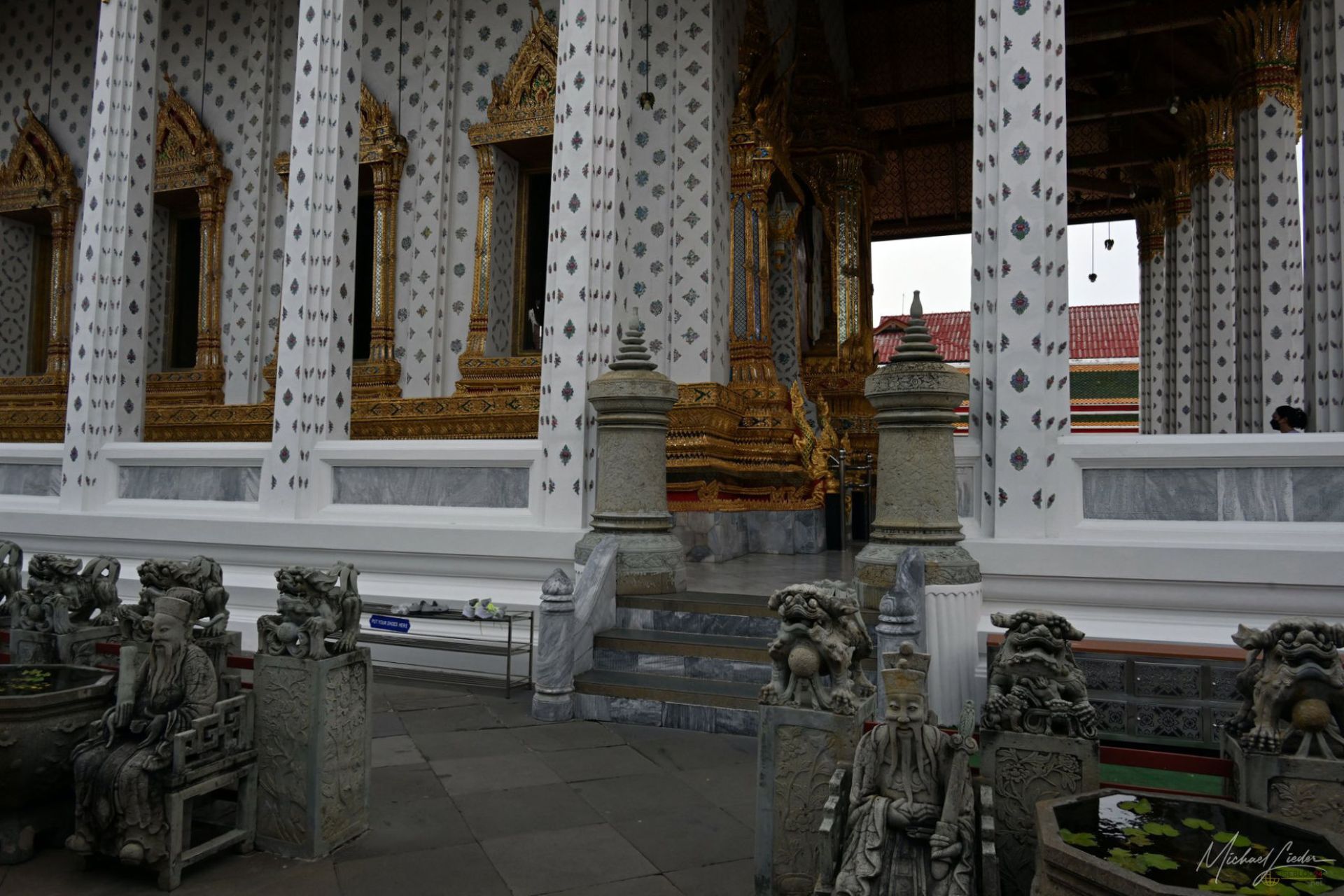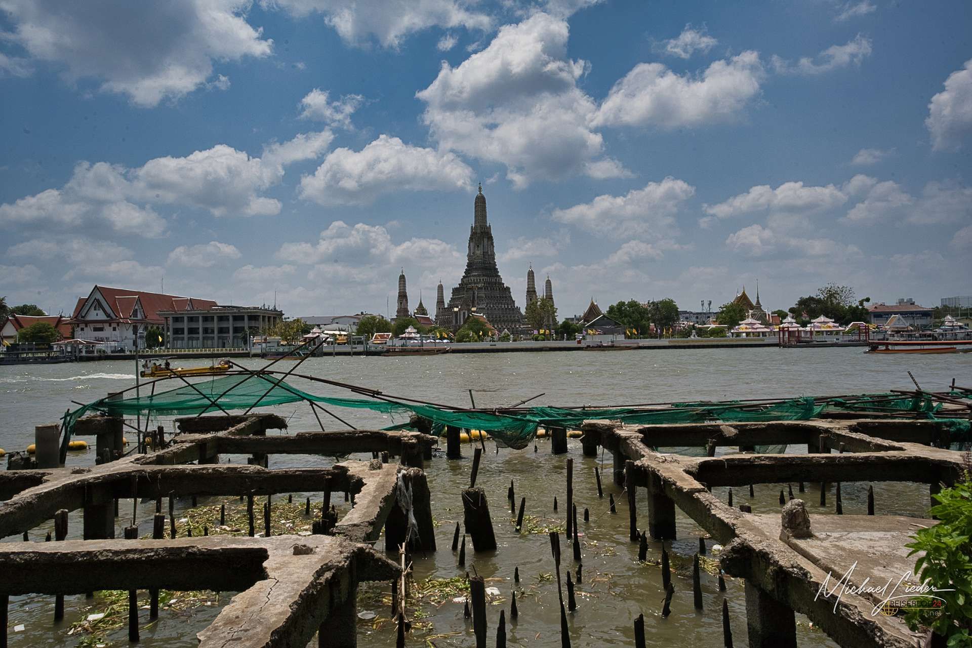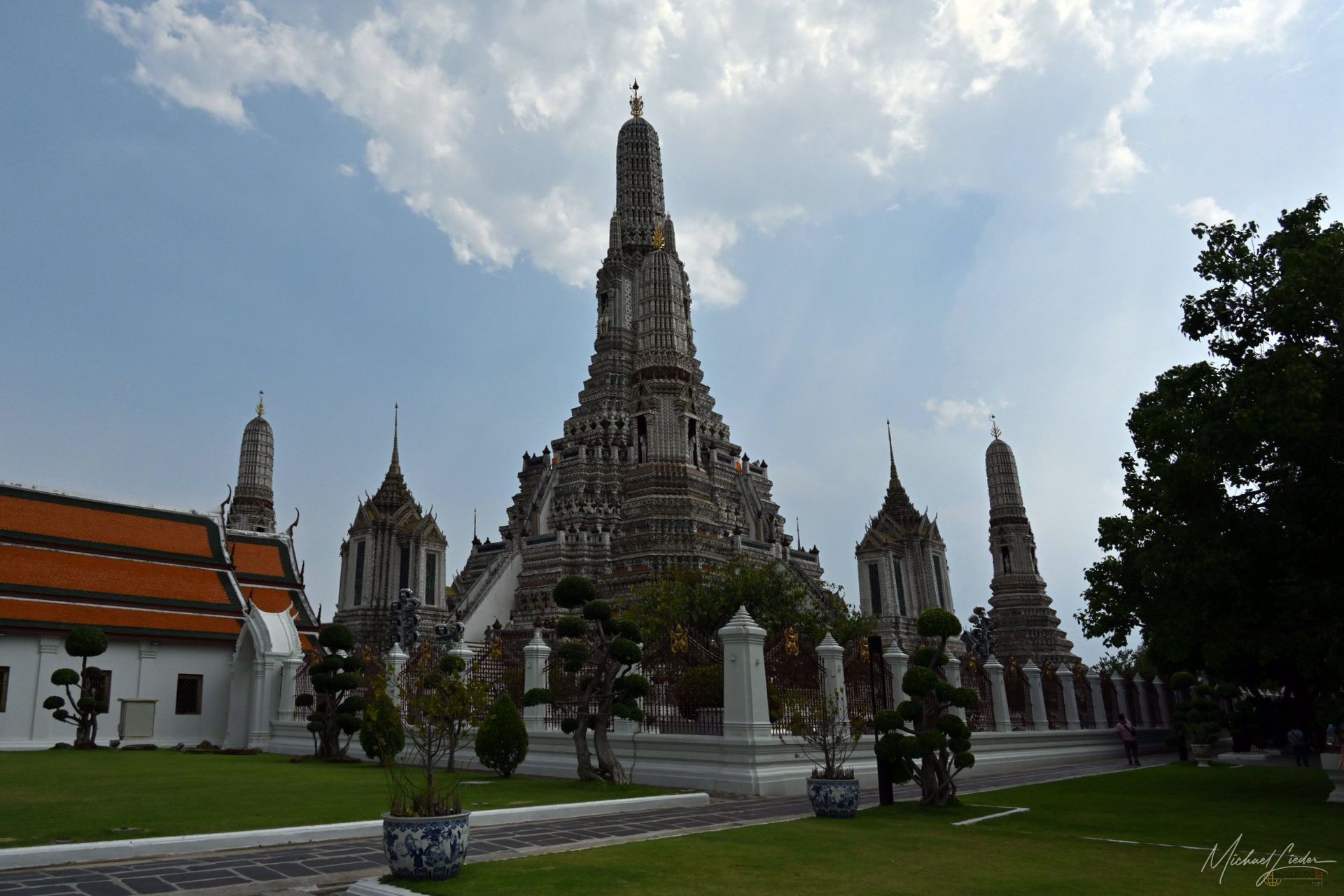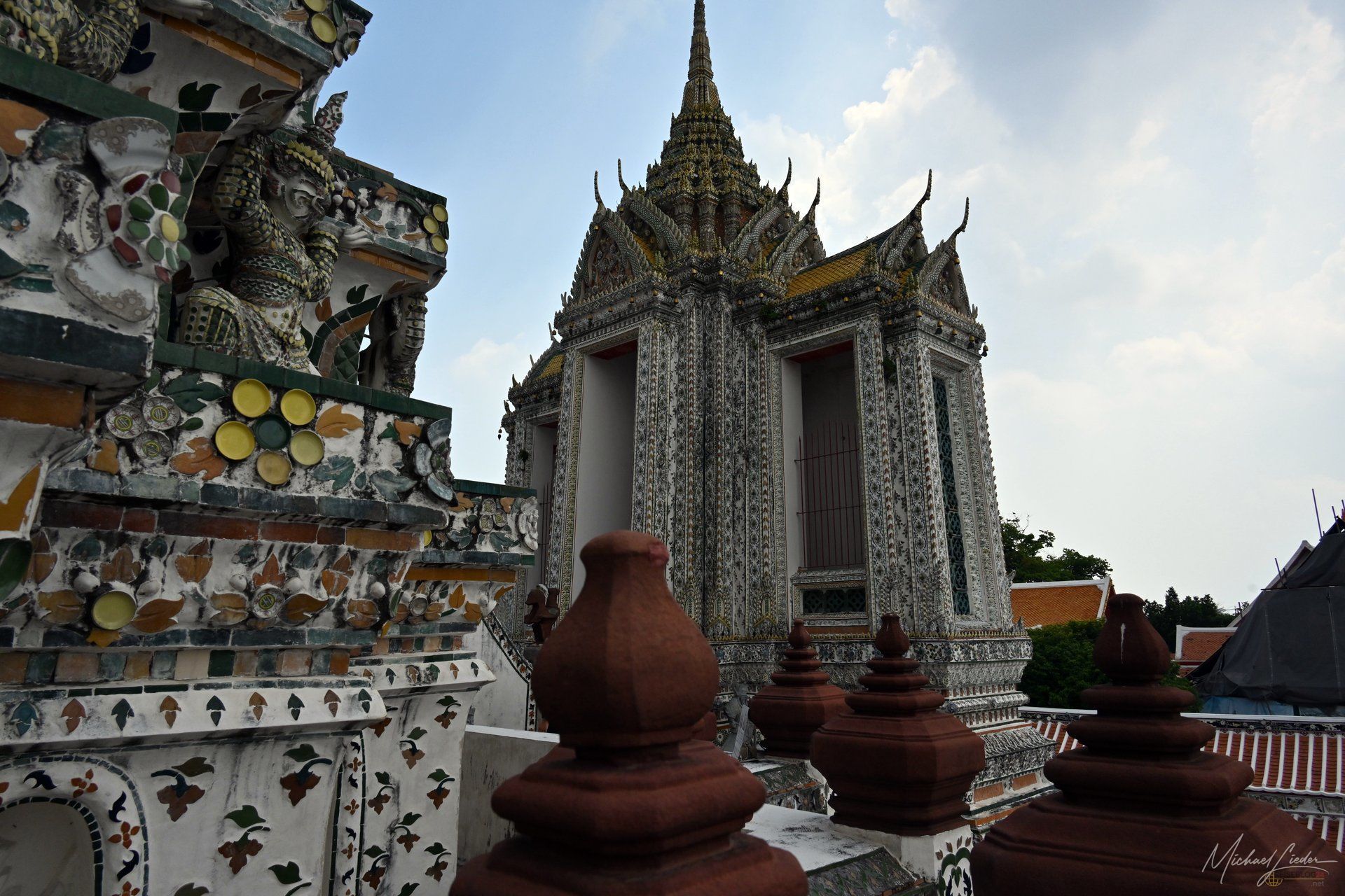 Dann steht man vor dem eigentlichen Mittelpunkt: dem Phra Prang. Hoch, steil, ein bisschen einschüchternd. Die Treppen wirken, als hätte jemand beim Bau beschlossen, dass Bequemlichkeit überbewertet ist. Nach einem tödlichen Unfall ist nur noch die untere Ebene zugänglich, was vermutlich auch besser für alle Beteiligten ist. Trotzdem: Die Stufen sind schmal, unnachgiebig und verlangen zumindest ein Mindestmaß an Respekt. Oben angekommen öffnet sich der Blick über den Fluss. Boote ziehen vorbei, die Stadt rauscht im Hintergrund, und für einen Moment steht man einfach nur da. Zwischen Ehrfurcht und der leisen Frage, ob die Oberschenkel morgen noch mitspielen. Der Prang selbst ist mit Millionen kleiner Porzellanstücke und Muscheln bedeckt, die sich zu filigranen Mustern fügen. Kein goldener Paukenschlag, sondern Detailarbeit, die man erst auf den zweiten Blick wirklich versteht.