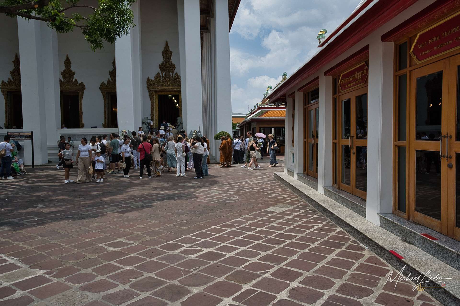 Die Ordinationshalle, der Ubosot, liegt eingebettet in den Phra Rabieng, einen Wandelgang aus der Zeit von König Rama II. Ziegel, Keramik, gedeckte Farben. Kein Bling-Bling, sondern Struktur. Und mittendrin Menschen, die geduldig darauf warten, von Mönchen gesegnet zu werden. Kein Spektakel, eher ein stiller Moment, der sich nicht erklären muss.