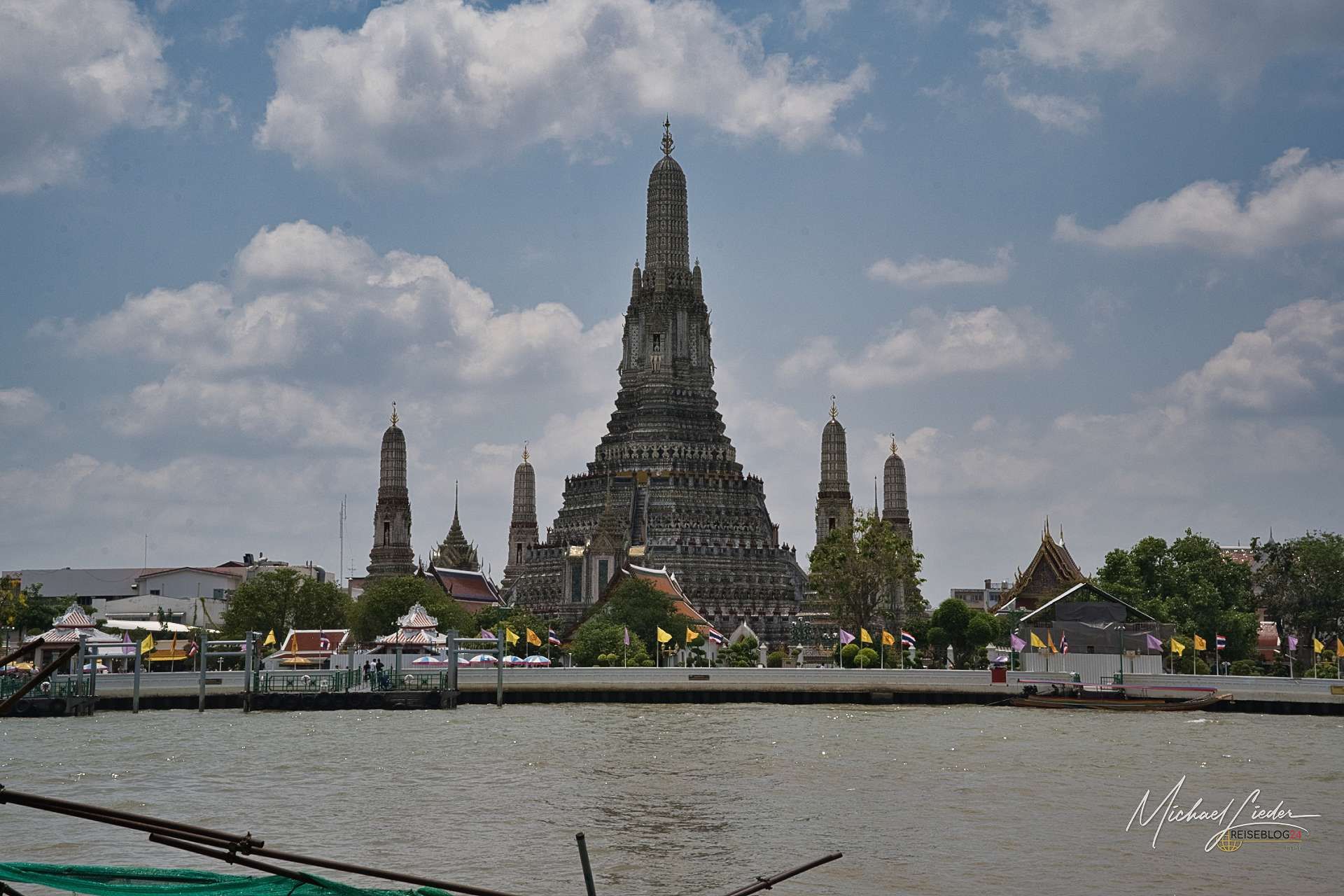 Der Wat Arun, der Tempel der Morgenröte, liegt im Bangkoker Stadtteil Yai am westlichen Ufer des Mae Nam Chao Phraya. Früher hieß er Wat Chaeng, heute gehört er zu den Orten, die man nicht einfach besucht – man tastet sich eher langsam an sie heran. Schon die Anreise zwingt einen dazu, Tempo rauszunehmen. Vom Ostufer, von der Palastseite, geht es nur per Boot über den Fluss. Und genau da beginnt dieses leise Kribbeln, das Reisen ausmacht.