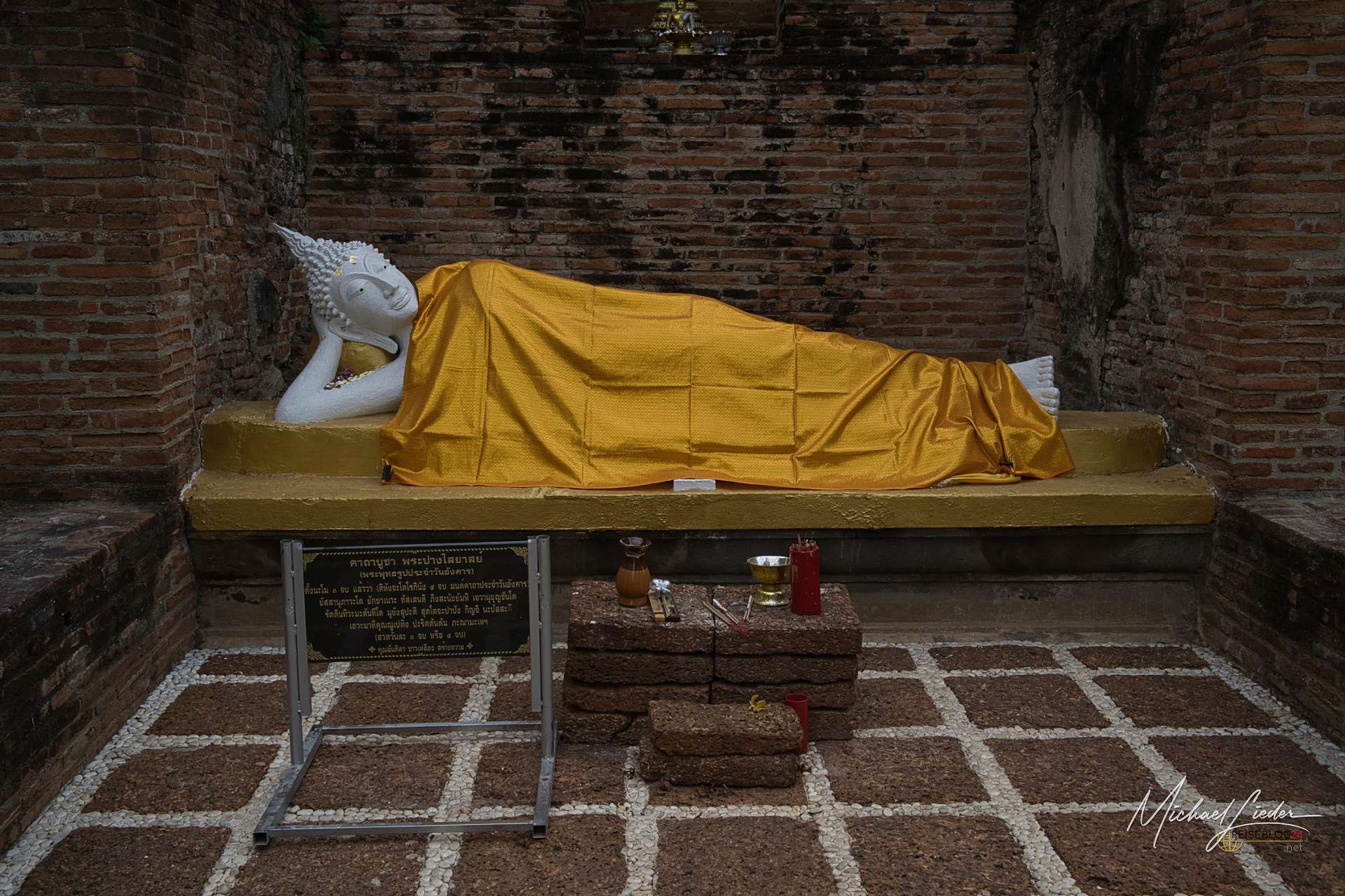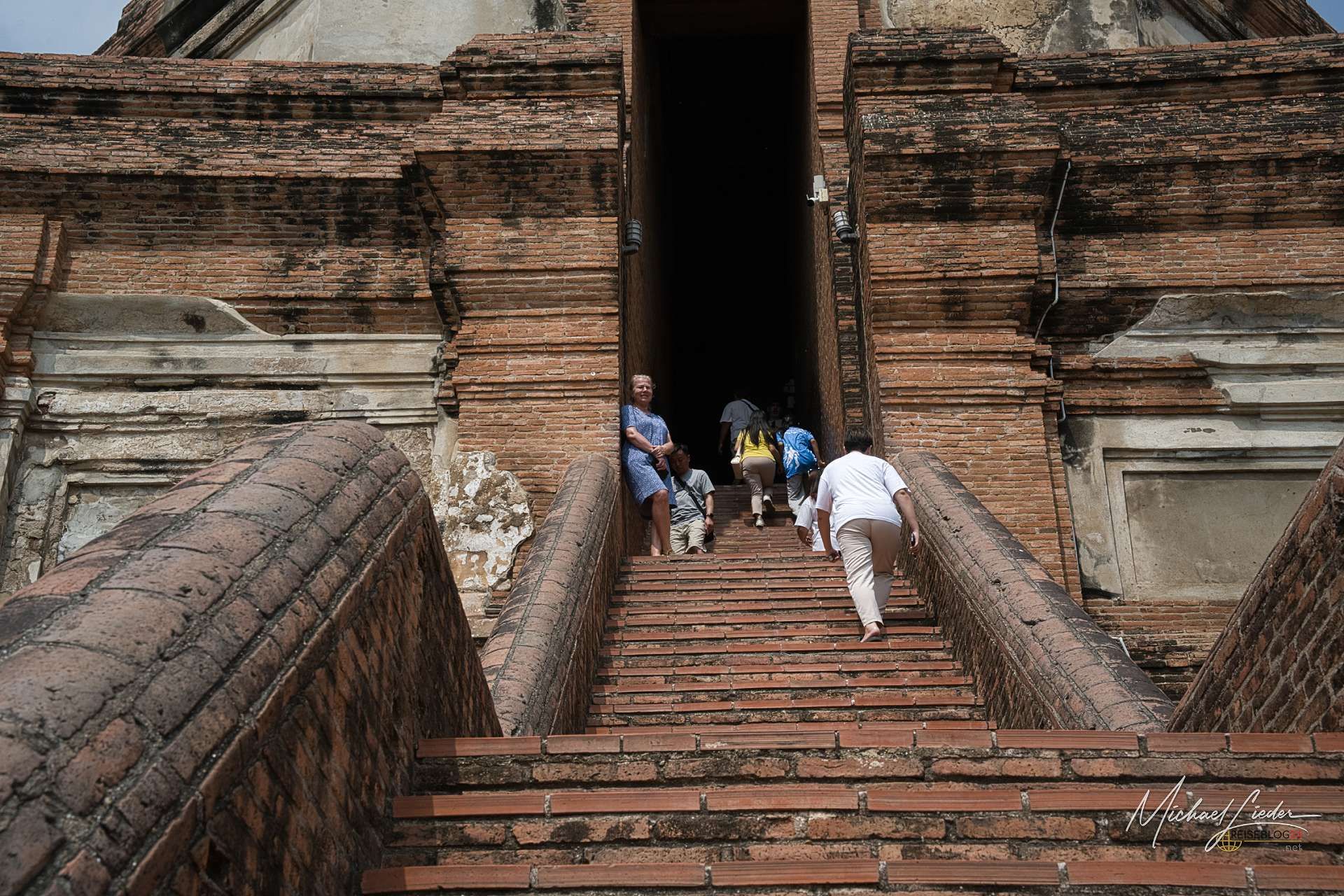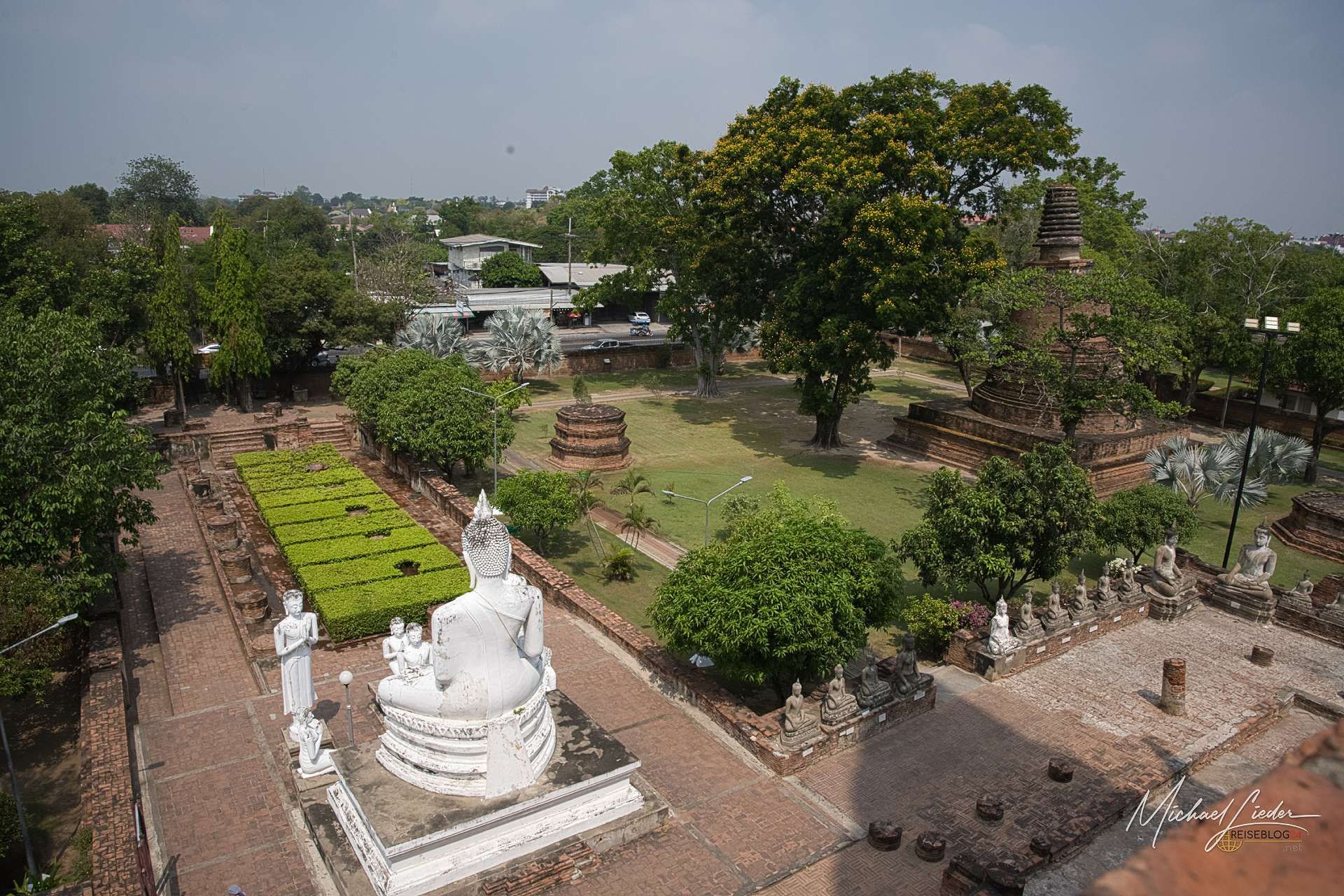 Richtig spannend wird es am Wat Yai Chai Mongkhon. Hier geht es nach oben, und auf einmal hat man diesen Blick über das Gelände, der einem klar macht, wie groß das Ganze eigentlich ist. Und ja, man kann hier tatsächlich in eine Chedi hinein. Ein seltenes Erlebnis, das irgendwo zwischen Neugier und leichtem Respekt pendelt.