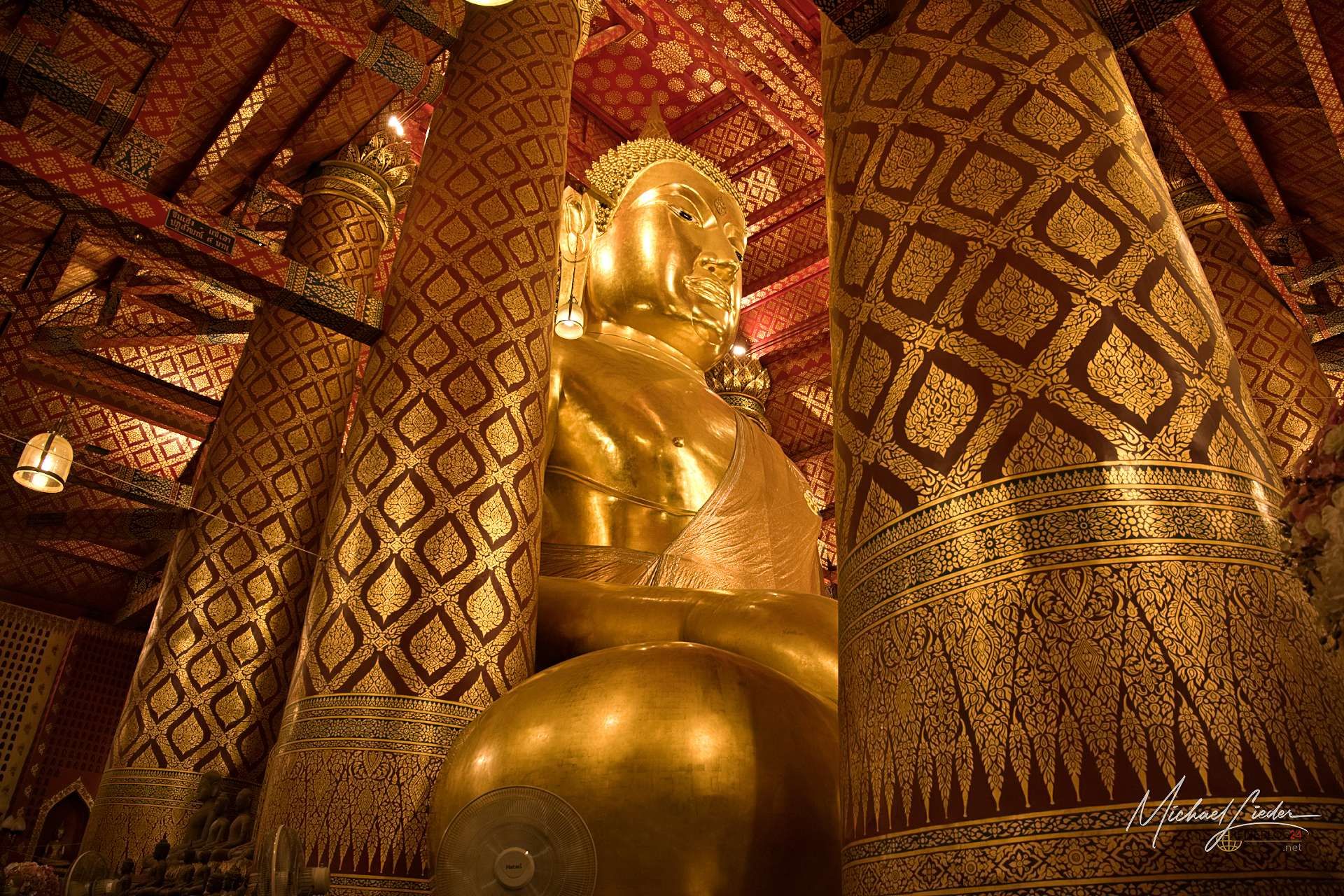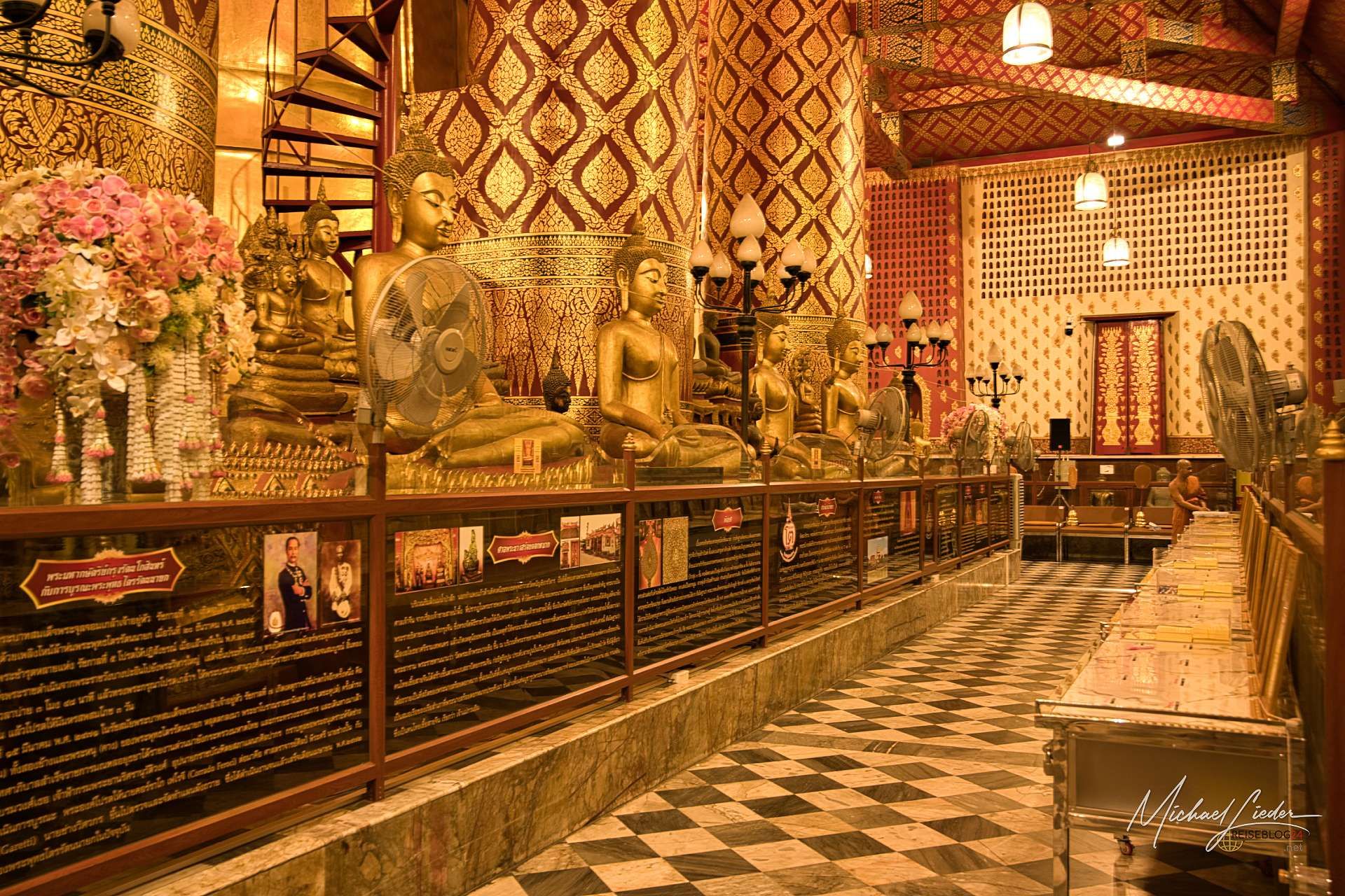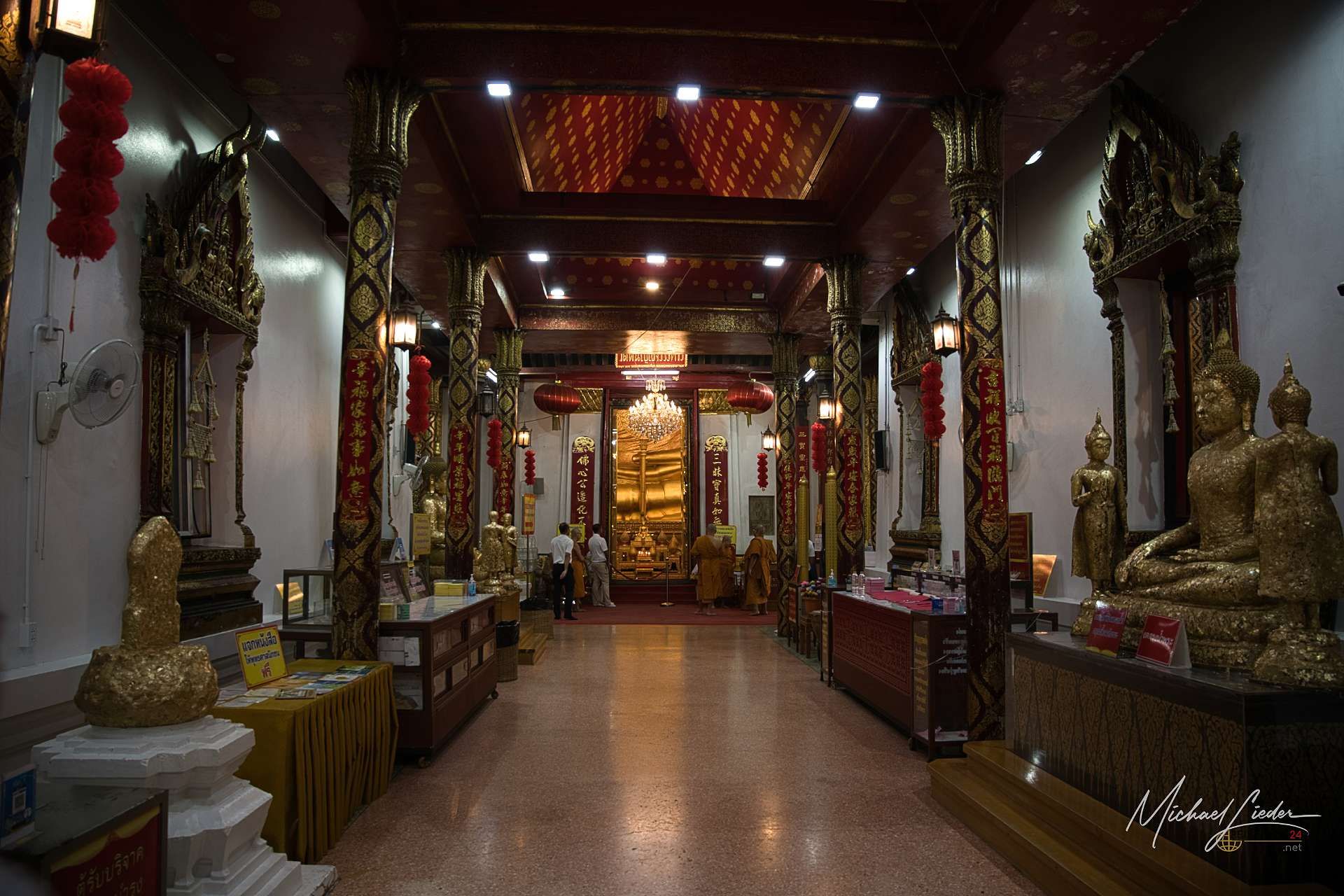 Der große Viharn wirkt wie eine eigene kleine Welt. Flankiert wird die Statue von Sariputta und Moggallana – zwei Figuren, die im Buddhismus ungefähr so viel Gewicht haben wie große Namen in anderen Religionen, nur ohne den ganzen PR-Apparat drumherum. Rundherum reihen sich unzählige kleine Buddha-Nischen, jede für sich ein leiser Moment, während draußen der Fluss unbeirrt weiterzieht, als hätte er all das schon tausendmal gesehen.