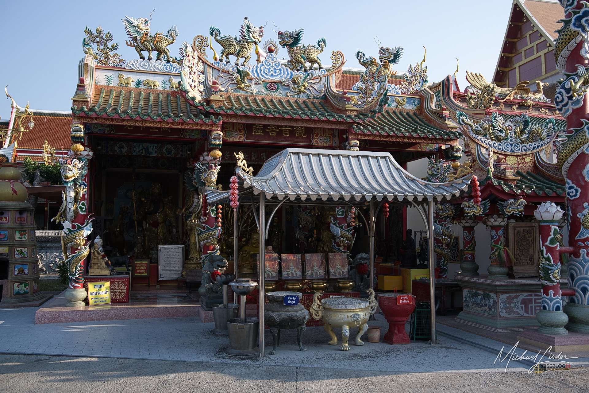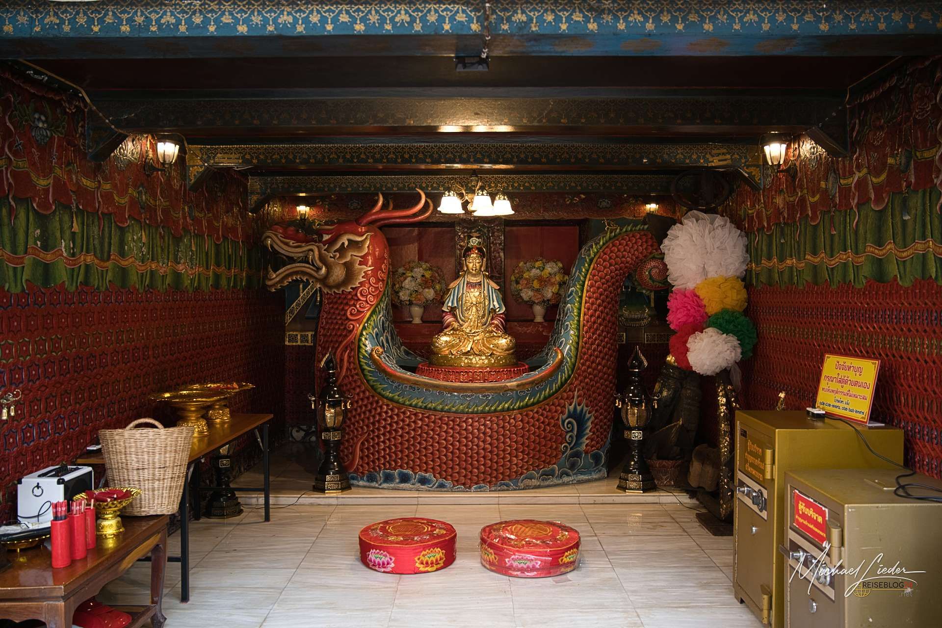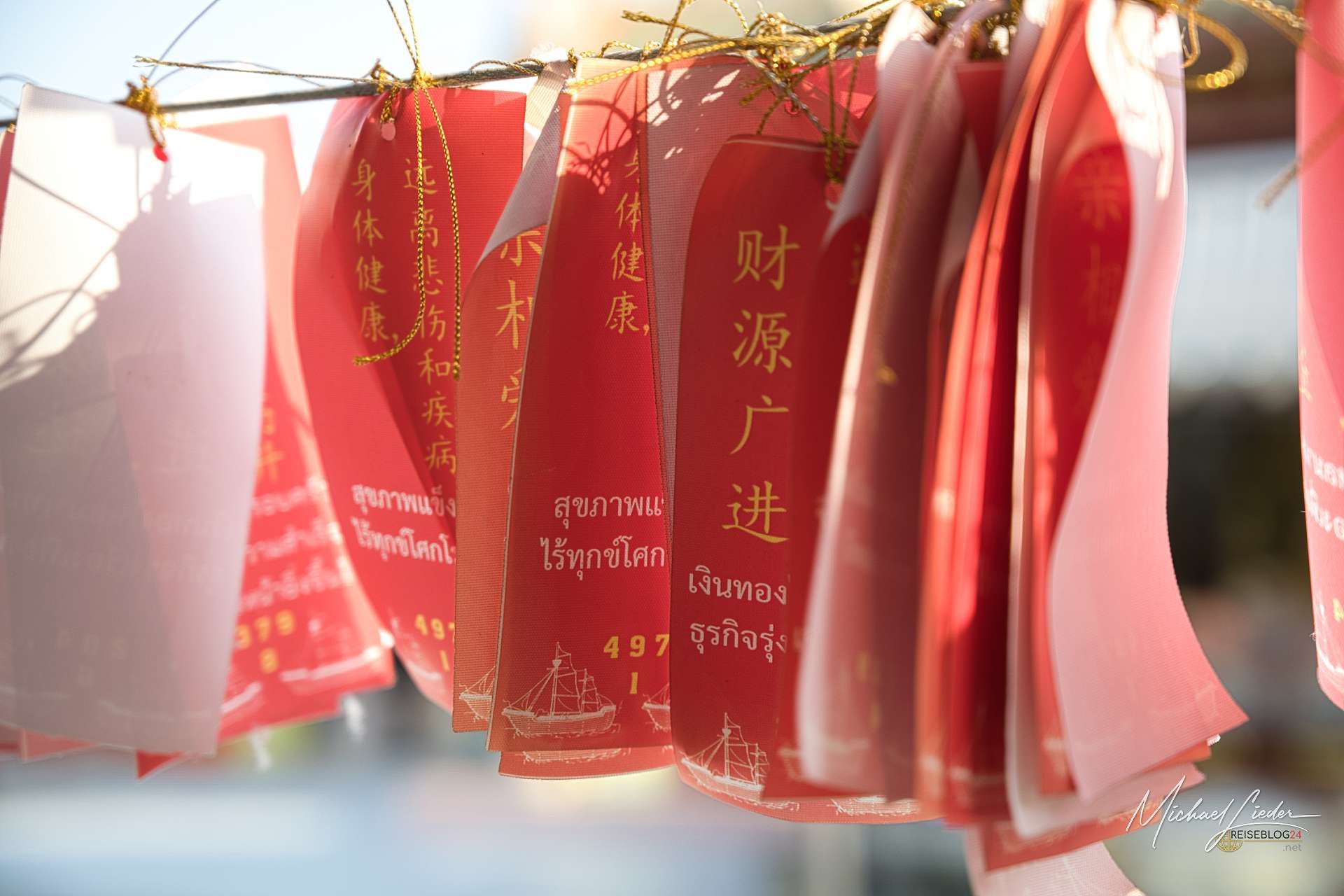 Und dann sind da diese Details, die man nicht planen kann: der Duft von Räucherwerk, der sich langsam durch die warme Luft zieht, das Rascheln der Roben in Safrangelb, das leise Murmeln von Gebeten. Dazwischen Besucher, die versuchen, gleichzeitig ehrfürchtig und unauffällig zu sein – ein Balanceakt, der ungefähr so elegant wirkt wie ein erster Tauchgang ohne Einweisung. Am Ufer wacht ein kleiner chinesischer Tempel mit grellbunten Kriegerfiguren, die seit Jahrhunderten denselben stoischen Blick pflegen. Während innen Wünsche auf Tafeln oder bunte Bänder geschrieben werden – für Glück, Gesundheit oder einfach dafür, dass das Leben nicht komplett aus dem Ruder läuft. Ein bisschen Hoffnung zum Mitnehmen, sauber formuliert und ordentlich befestigt.