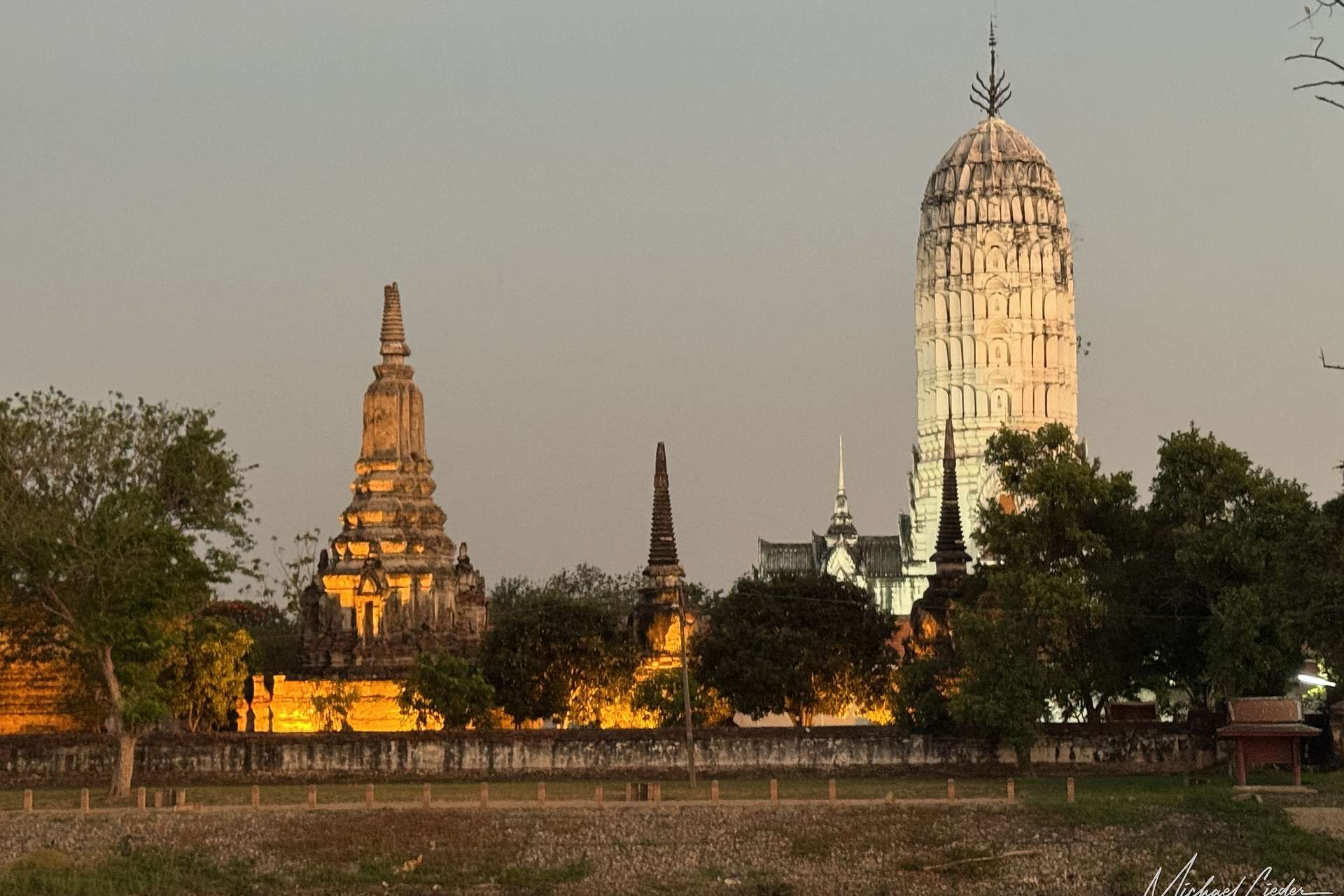 Besonders schön war für uns eine spontan gebuchte Sonnenuntergangstour auf dem Fluss. So eine dieser Entscheidungen, die ohne großen Plan entstehen und am Ende viel richtiger wirken als jede sauber vorbereitete Route. Vom Wasser aus zeigt sich Ayutthaya weicher, ruhiger und fast versöhnlich. Die Wats leuchten im Abendlicht, die Ufer ziehen gemächlich vorbei, und für einen Moment wirkt selbst der touristische Betrieb erstaunlich weit weg. Thailand kann solche Augenblicke noch immer. Zum Glück. Dazu kommt ein lebhafter Night Market, auf dem man wunderbar essen kann, sofern man Streetfood nicht nur fotografieren, sondern auch wirklich probieren will. Der eigentliche Zauber von Ayutthaya liegt aber in den vielen Tempelanlagen. Wer sie erleben möchte, sollte die Randstunden des Tages nutzen. Am frühen Morgen oder kurz vor Sonnenuntergang ist das Licht deutlich schöner, die Hitze erträglicher und die Ruinen entfalten genau diese Atmosphäre, wegen der man hier nicht einfach nur etwas besichtigt, sondern ein Stück Vergangenheit spürt. Ganz ohne Pathos. Dafür mit Staunen.