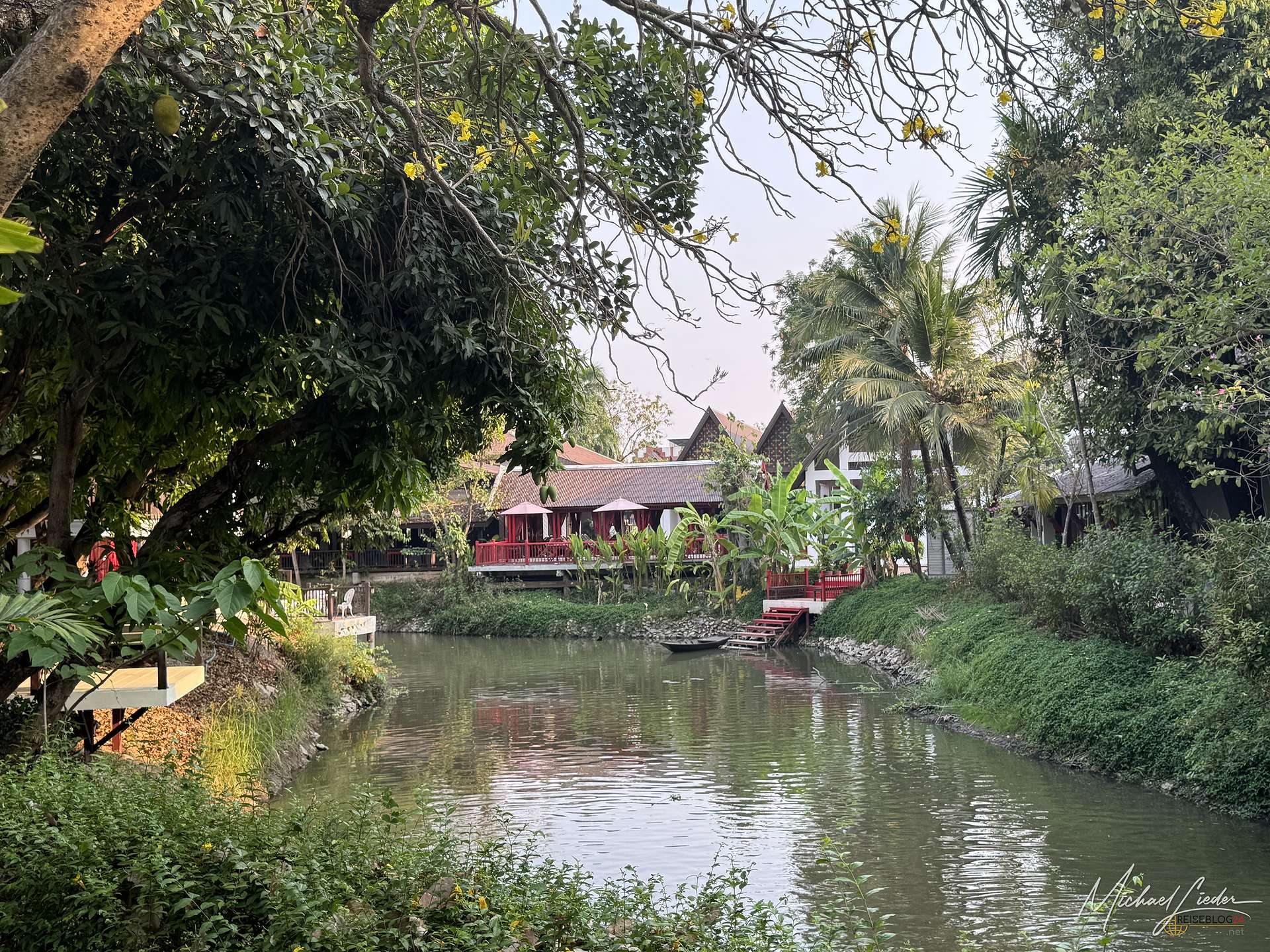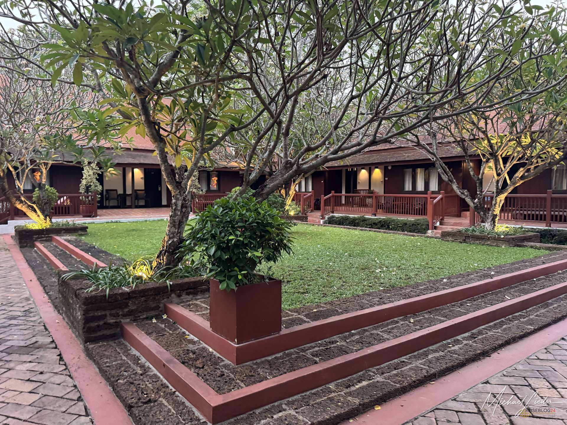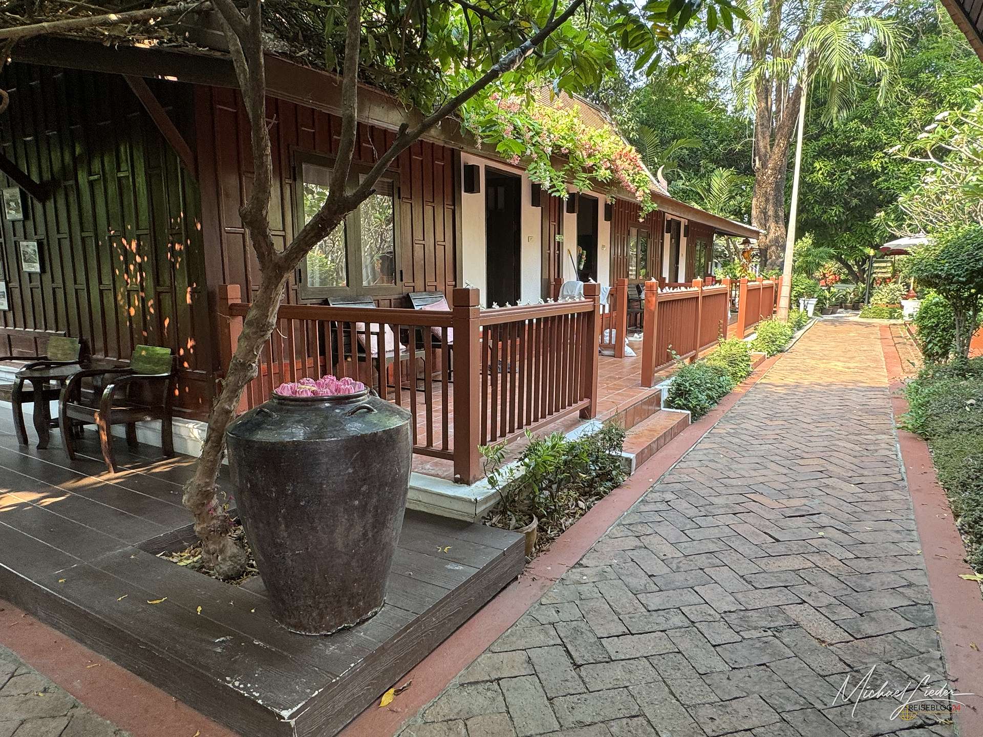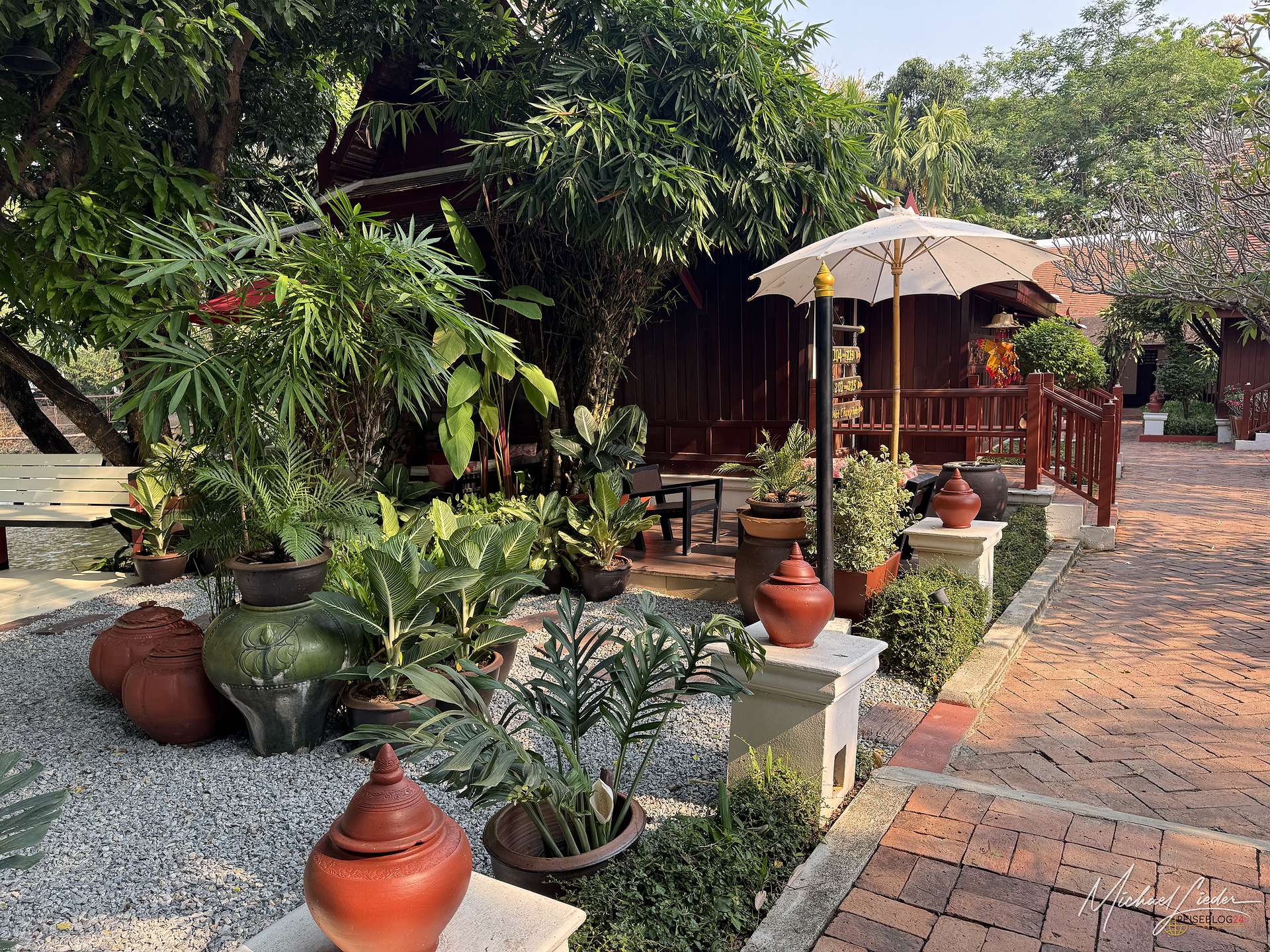 Vom Hotel aus ließ sich die Stadt und auch die nähere Umgebung bequem erkunden. Mit dem Mietwagen war das natürlich besonders einfach, aber auch per Fahrrad ist man hier völlig problemlos unterwegs. Besonders positiv überrascht hat mich die Gartenanlage. Das Hotel liegt mitten in einer üppigen, wunderbar gepflegten grünen Oase, die ich in Zentralthailand so ehrlich gesagt nicht erwartet hätte. Gerade in der High Season, wenn die Hitze zuverlässig jede Bewegung in eine kleine Tagesaufgabe verwandelt, war dieses satte Grün nicht nur schön anzusehen, sondern auch ein echter Segen. Bäume, Schatten und ein angenehmes Umfeld sind dann plötzlich mehr wert als jede noch so dekorative Hotellobby. Hier wirkte vieles angenehm entspannt, stimmig und einfach wohltuend.