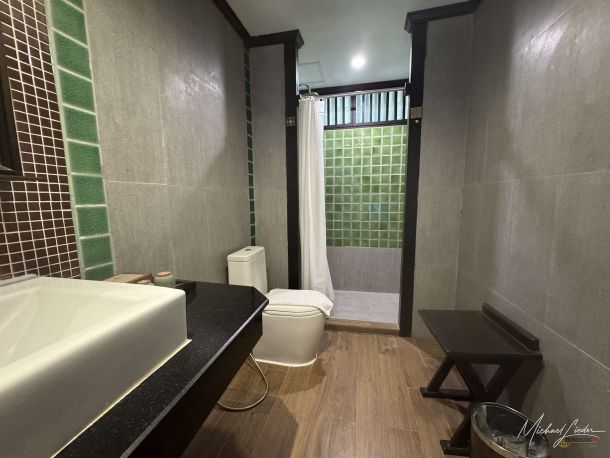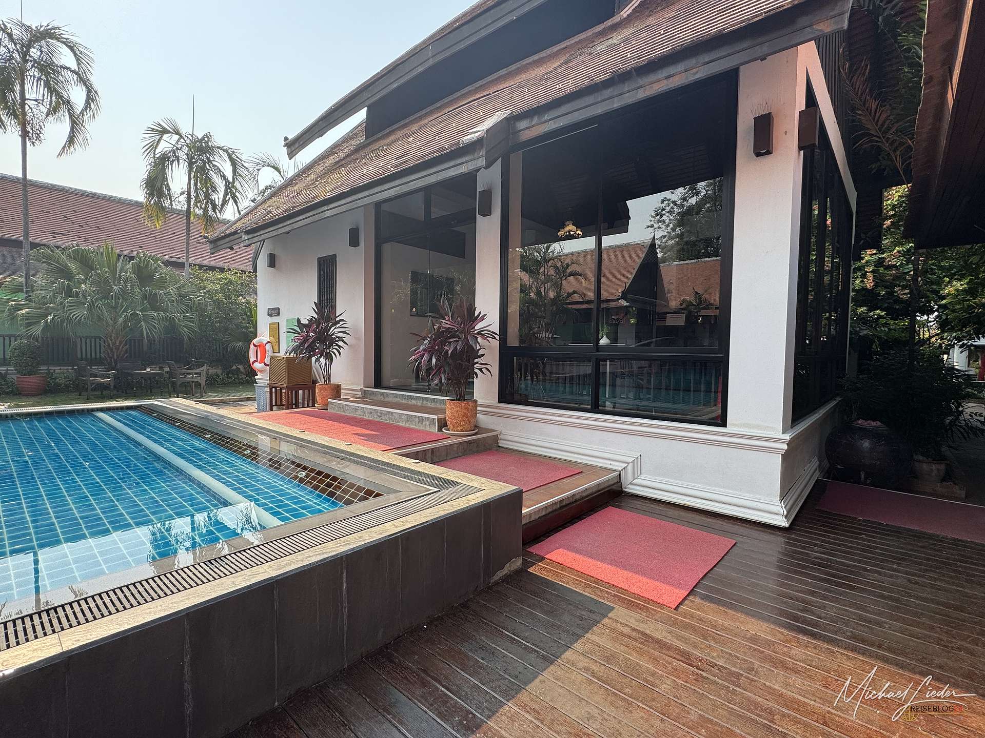 Auch die Ausstattung des Bungalows hat überzeugt. Das große Bett war bequem, der Raum insgesamt geschmackvoll eingerichtet und farblich sehr stimmig. Alles wirkte harmonisch, freundlich und mit einer Einrichtung, die durchaus einen thailändischen Charakter hatte, ohne dabei in kitschige Deko-Fallen abzurutschen. Das Bad war funktional, angenehm und mit allem ausgestattet, was man für einen komfortablen Aufenthalt braucht. Schön gelöst war auch der Service rund um den Pool, denn dafür gab es eigene Handtücher. So bleibt das Zimmerhandtuch da, wo es hingehört, und man muss nicht bei jedem Gang ans Wasser logistisch umdenken. Die Reinigung funktionierte unkompliziert über ein kleines Schild, und auch hier zeigte sich, dass im Detail oft der Unterschied liegt. Nach der Zimmerreinigung lagen auf dem Geländer vor dem Bungalow zahlreiche kleine weiße Blüten, eine leise, aber sehr charmante Geste. Die Sauberkeit war insgesamt hervorragend, und die kleine Terrasse direkt am Garten machte den Bungalow endgültig zu einem Ort, an den man nach einem Ausflug wirklich gern zurückgekommen ist.