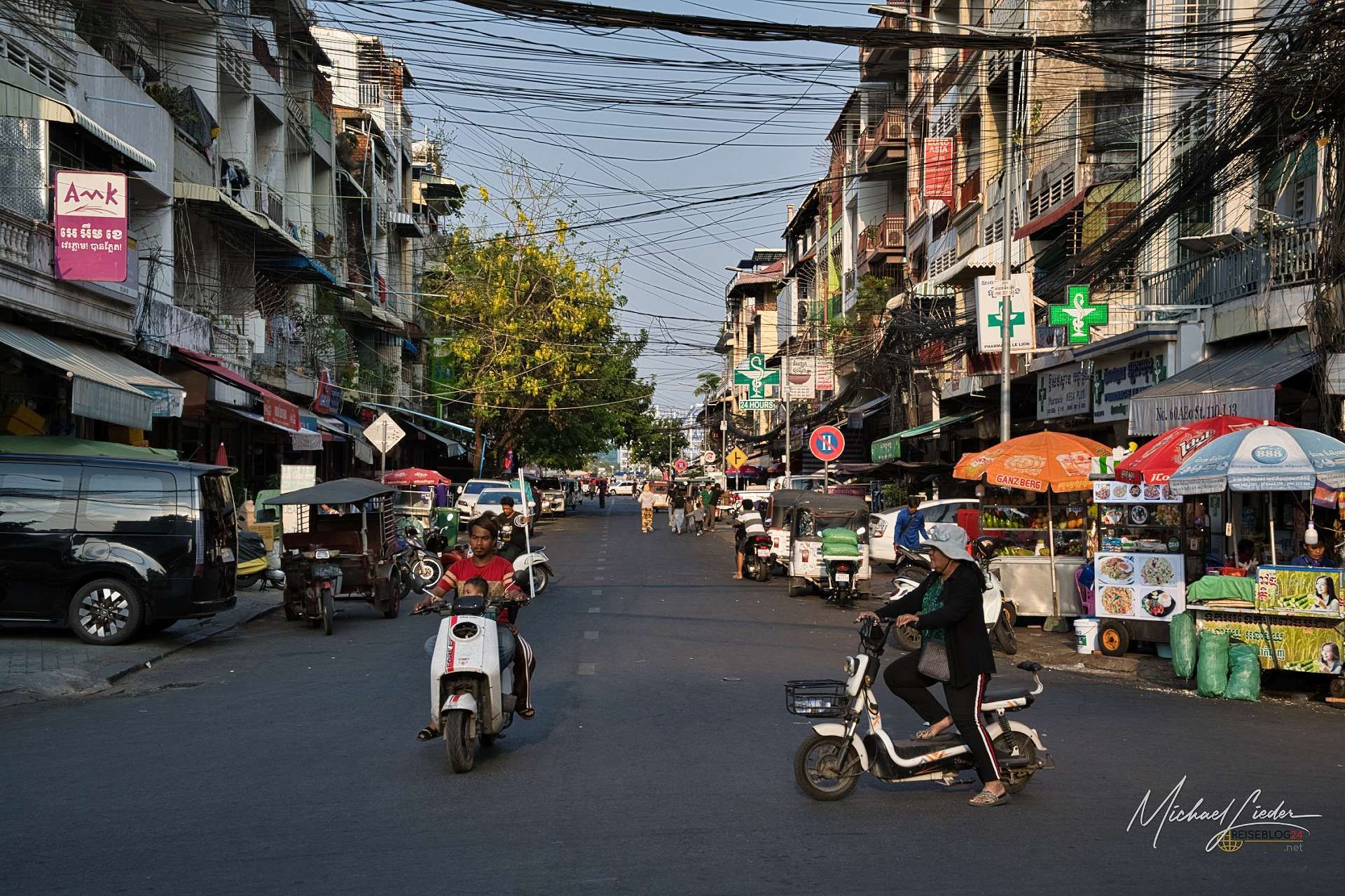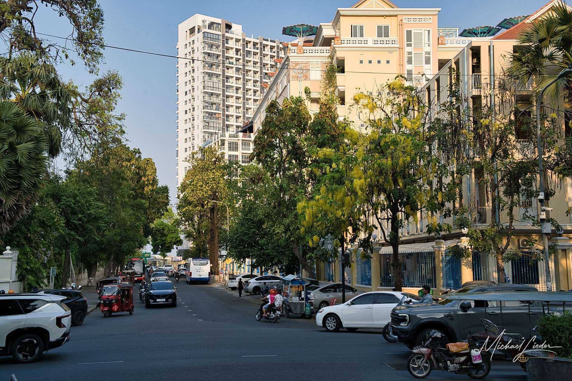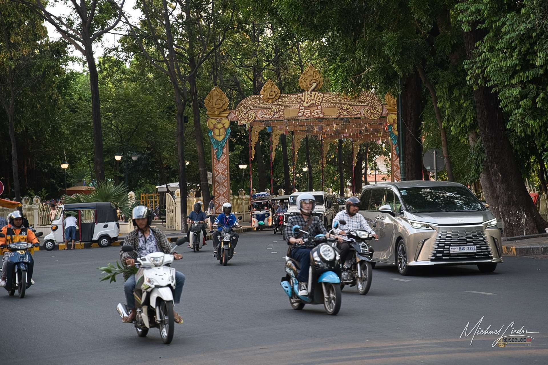 Dazwischen bewegt sich Phnom Penh wie immer unbeirrt weiter. TukTuks schlängeln sich durch Lücken, die eigentlich keine sind, Motorroller fließen in einem Strom, der keiner erkennbaren Logik folgt, Fahrräder kämpfen tapfer mit, und irgendwo dazwischen gleiten hochmotorisierte Sportwagen vorbei, als hätten sie sich in der falschen Realität verlaufen.