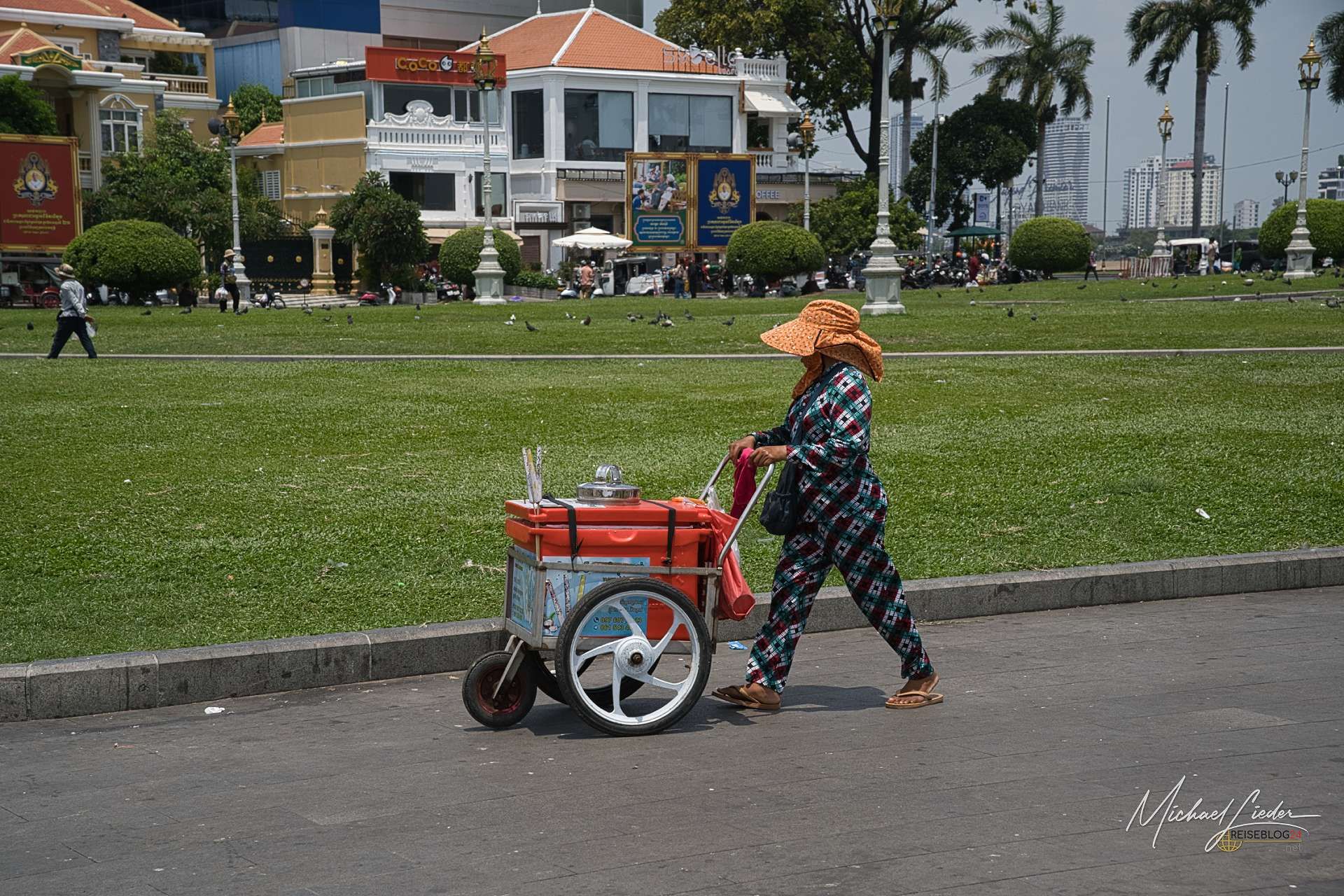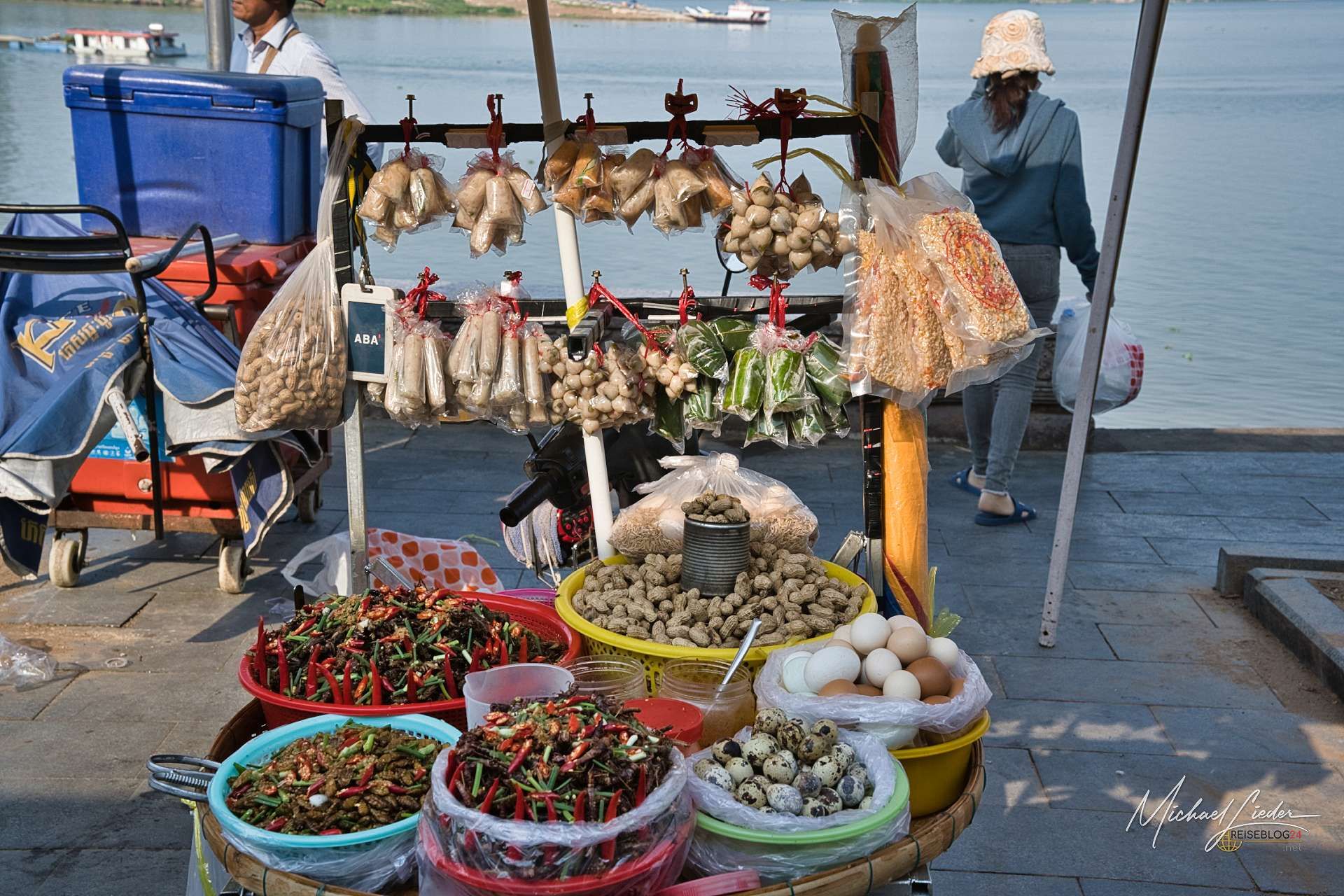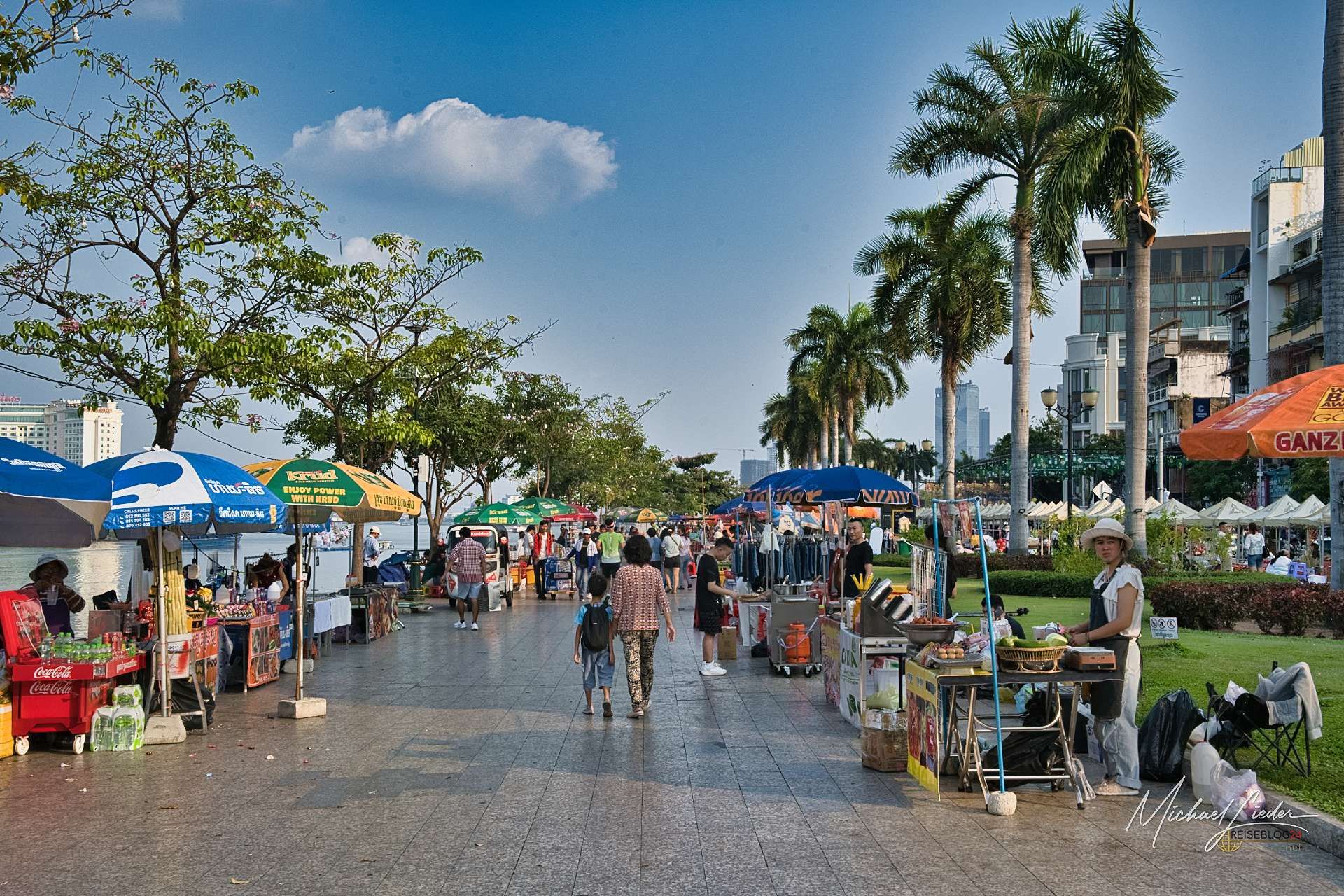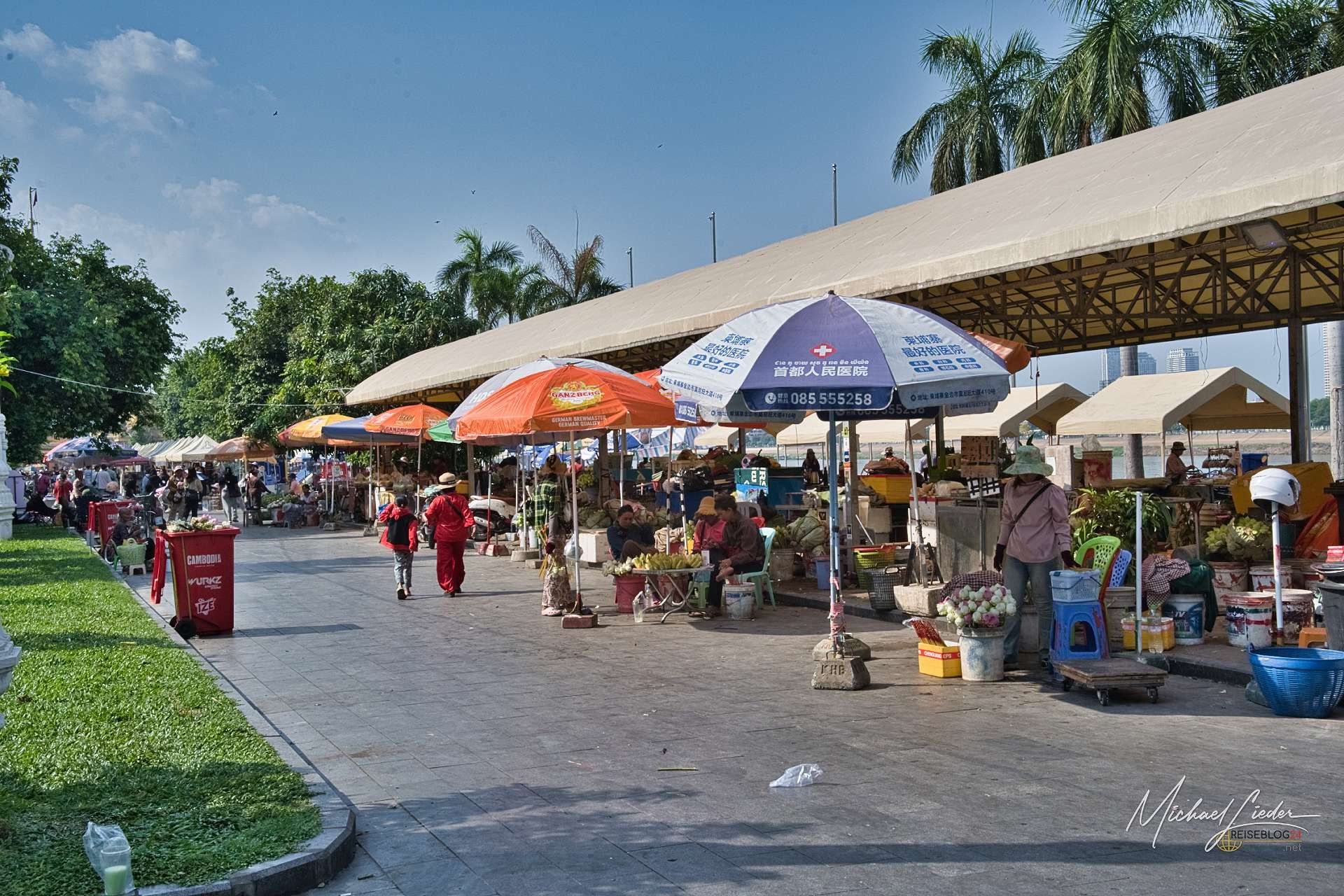 Plane es ein, an einem Wochenende in Phnom Penh zu sein. Du solltest der sogenannten Riverside unbedingt ein paar Stunden schenken. Wobei „ein paar Stände“ hier eine fast schon lächerlich falsche Untertreibung wäre. Entlang der Uferpromenade reiht sich nicht einfach ein kleiner Nachtmarkt an den nächsten, sondern gefühlt gleich eine ganze Armee aus Garküchen, Grillplatten, Plastikhockern wie im Kindergarten, dampfenden Töpfen und improvisierten Küchen auf Rädern. Ein paar Hundert Stände dürften es locker sein. Phnom Penh macht hier am Samstag und Sonntag keine halben Sachen. Die Riverside wird dann zu einer einzigen, wilden Foodmeile, die weniger geschniegelt wirkt als manch touristisch geschniegelt inszenierter Markt in anderen Städten, dafür aber deutlich ehrlicher, lebendiger und spannender.
