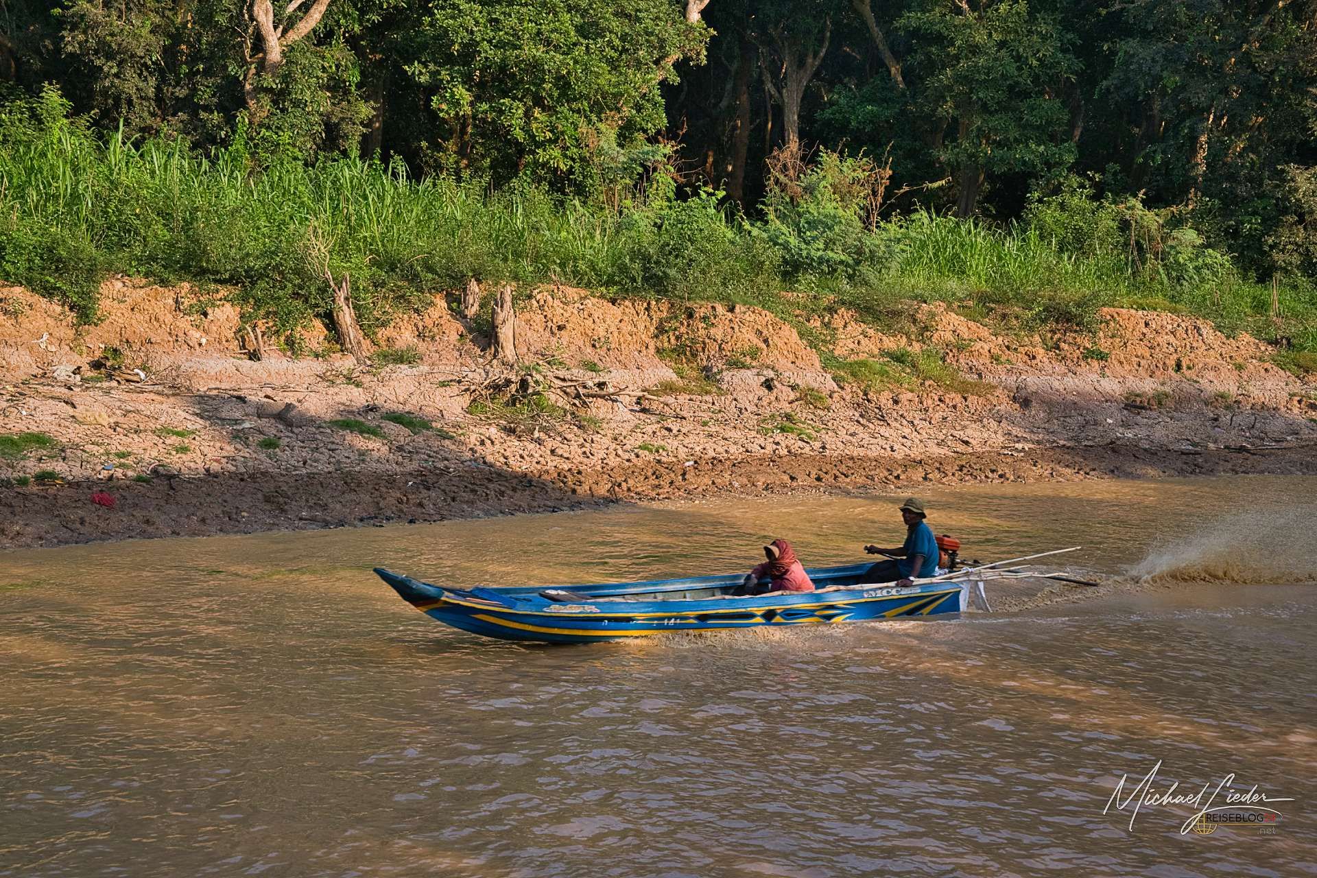 Wir landen also in einem dieser einfachen Holzboote, irgendwo zwischen Abenteuerlust und der leisen Frage, ob das jetzt wirklich die klügste Idee des Tages war. Neben dem Dorf zieht sich ein schmaler Wasserlauf dahin, gerade breit genug, dass die Boote nicht trockenlaufen. Es wirkt fast wie ein Kompromiss zwischen Natur und Realität. Hunderte Boote warten hier geduldig, als würden sie wissen, dass sie in der Regenzeit wieder im Mittelpunkt stehen.