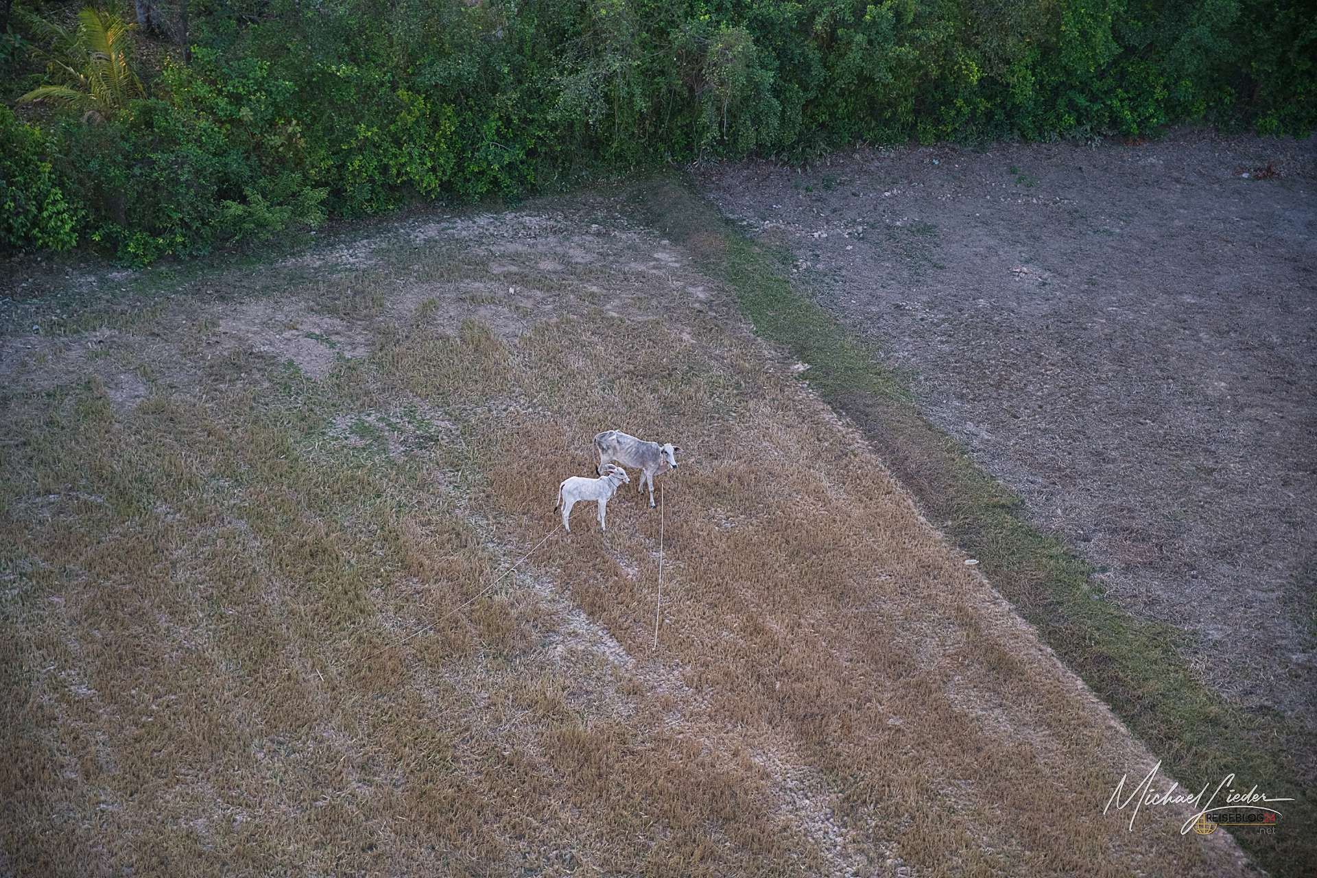 Unter uns entfaltet sich eine Landschaft, die von oben fast zu perfekt wirkt. Dieses satte Grün, durchzogen von Straßen und kleinen Häusern, sieht aus, als hätte jemand mit zu viel Geduld und zu vielen Farbstiften daran gearbeitet. Ein kleiner Tempel taucht zwischen den Bäumen auf, fast schüchtern, als wollte er nicht stören. Und irgendwo daneben steht eine Kuh mit ihrem Kalb, die uns anschaut, als hätten wir gerade ihre komplette Weltordnung durcheinandergebracht.