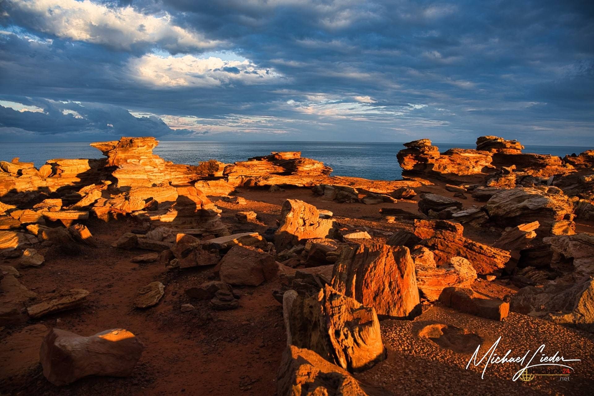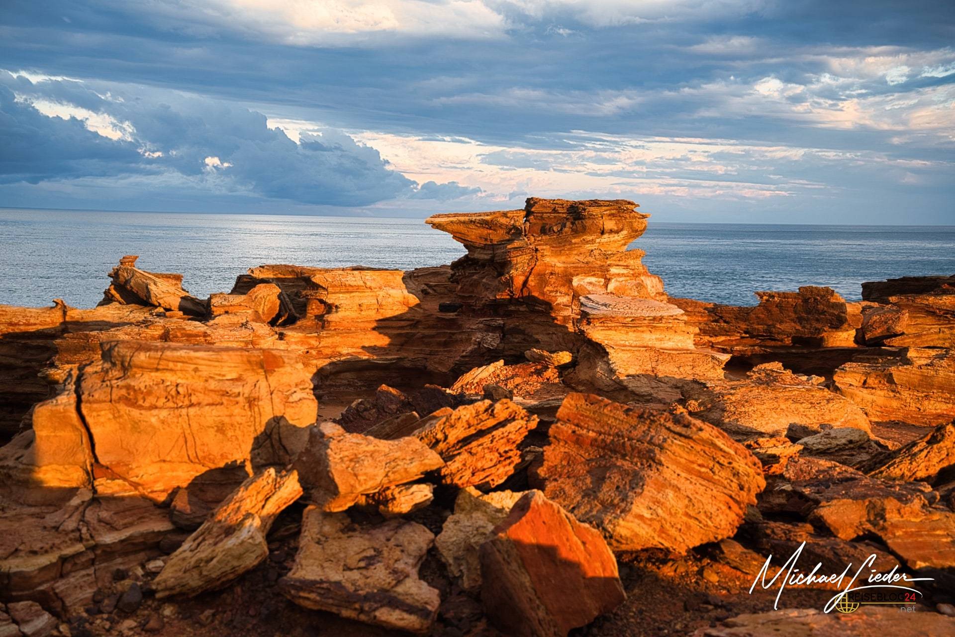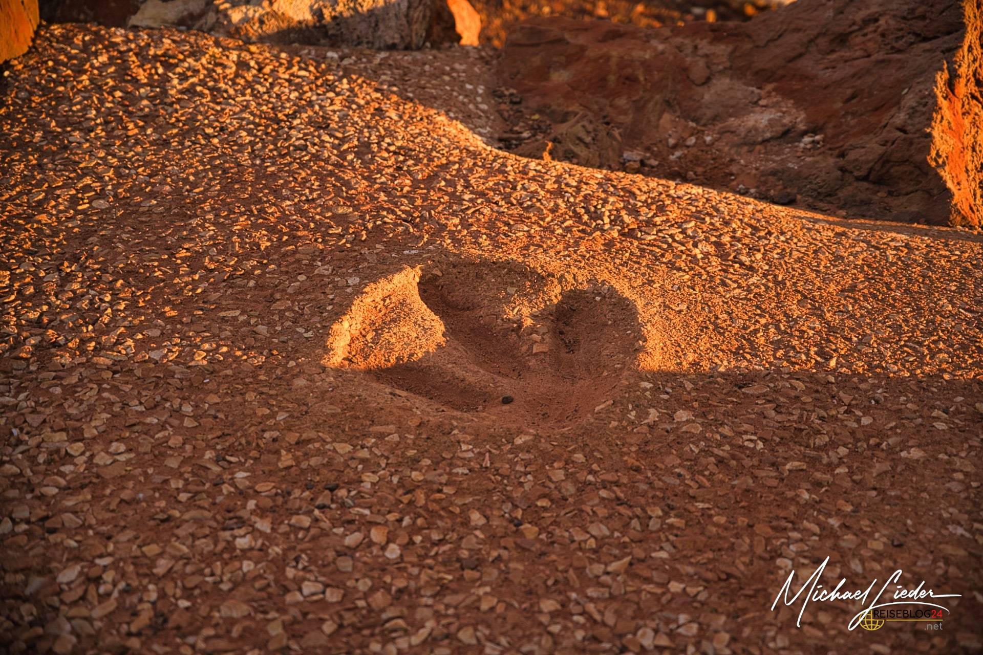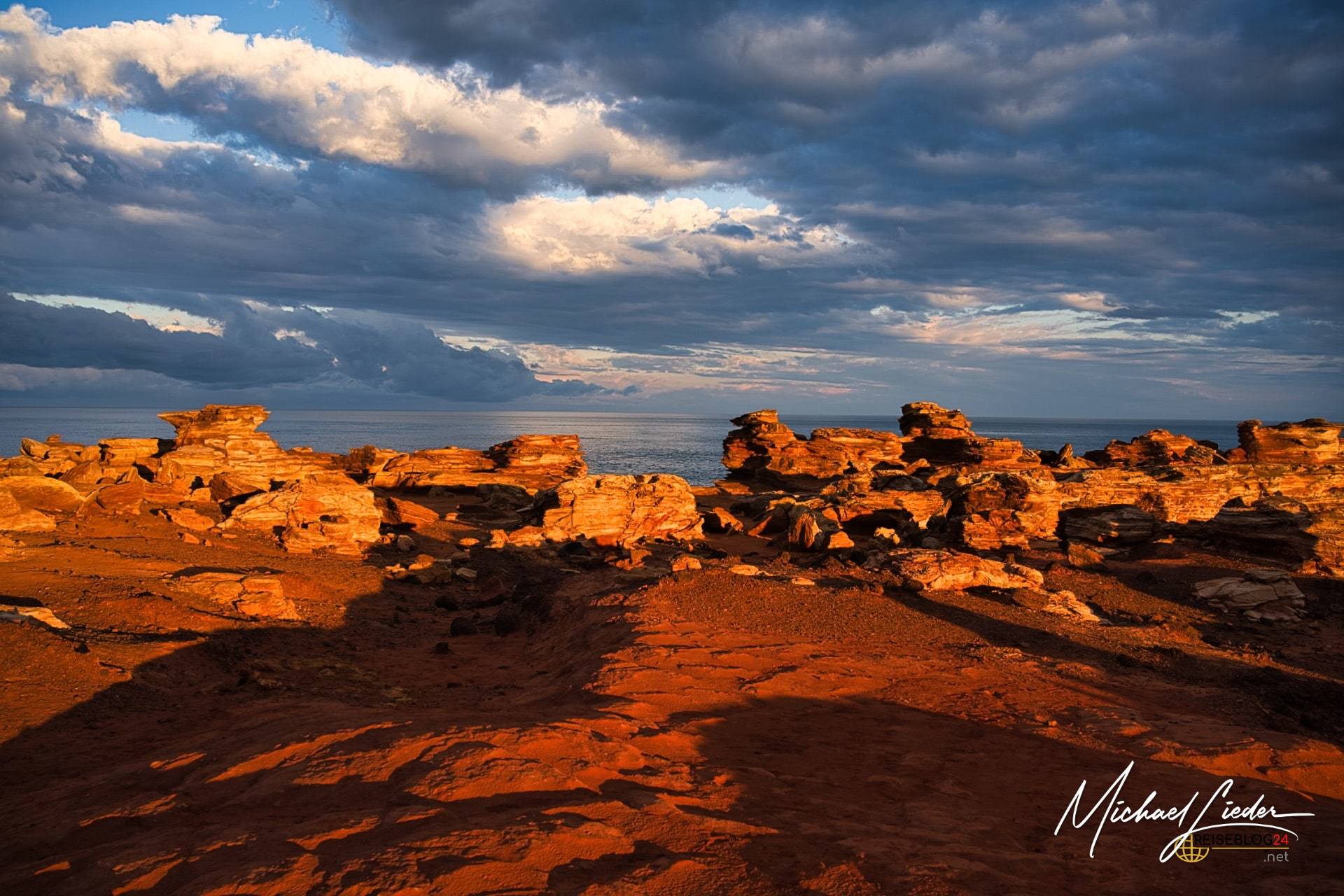 Nur rund zehn Autominuten von Broome entfernt wartet mit Gantheaume Point ein Ort, der wirkt, als hätte jemand Farbe, Geschichte und Zeitgefühl bewusst überdosiert. Am südwestlichsten Ende der schmalen Landzunge treffen tiefrot leuchtende Felsen auf den Indischen Ozean – ein Kontrast, der schon tagsüber beeindruckt. Bei Sonnenaufgang oder unter bedecktem Himmel allerdings kippt das Ganze endgültig ins Magische. Dann glühen die Klippen, als würden sie von innen heraus leuchten. Und irgendwo im Hinterkopf meldet sich der Gedanke: Hier waren einmal Dinosaurier unterwegs. Ganz real. Nicht metaphorisch.