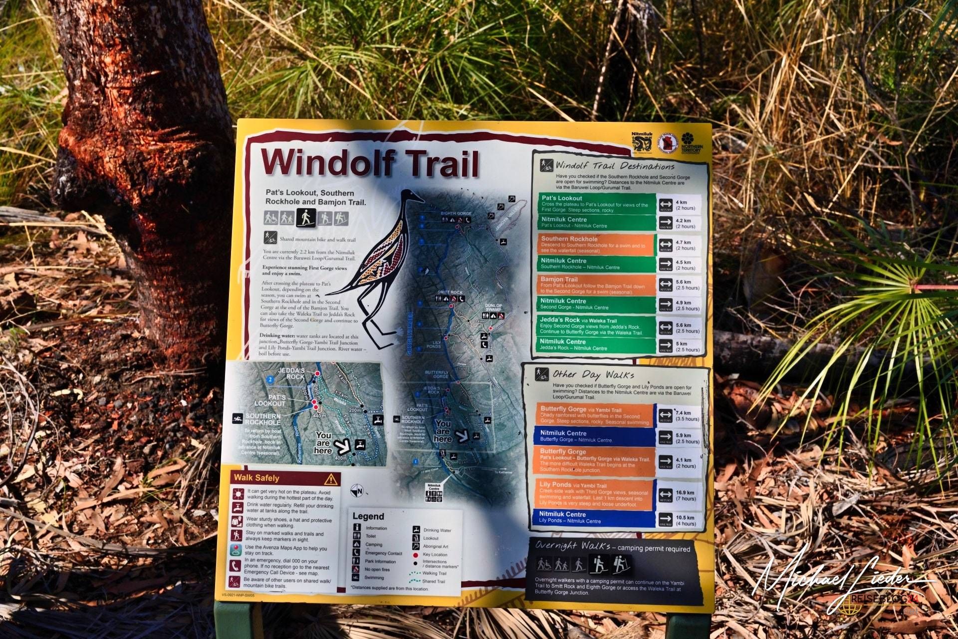 Unser Ausgangspunkt für die Wanderung war das Besucherzentrum, wo wir uns zuerst alle wichtigen Informationen über die verschiedenen Routen und Sicherheitsvorkehrungen einholten. Die Auswahl an Wanderwegen reichte von kurzen Spaziergängen bis zu mehrtägigen Trekkingtouren – für jeden Geschmack und jedes Fitnesslevel war etwas dabei. Da wir gerne aktiv in der Natur unterwegs sind, entschieden wir uns für eine mittelschwere Route: den Windolf Trail. Dieser etwa 10 Kilometer lange Rundweg führte zu beeindruckenden Sandsteinfelsen und Aussichtspunkten, die die ersten beiden Schluchten der Katherine Gorge umrahmen.