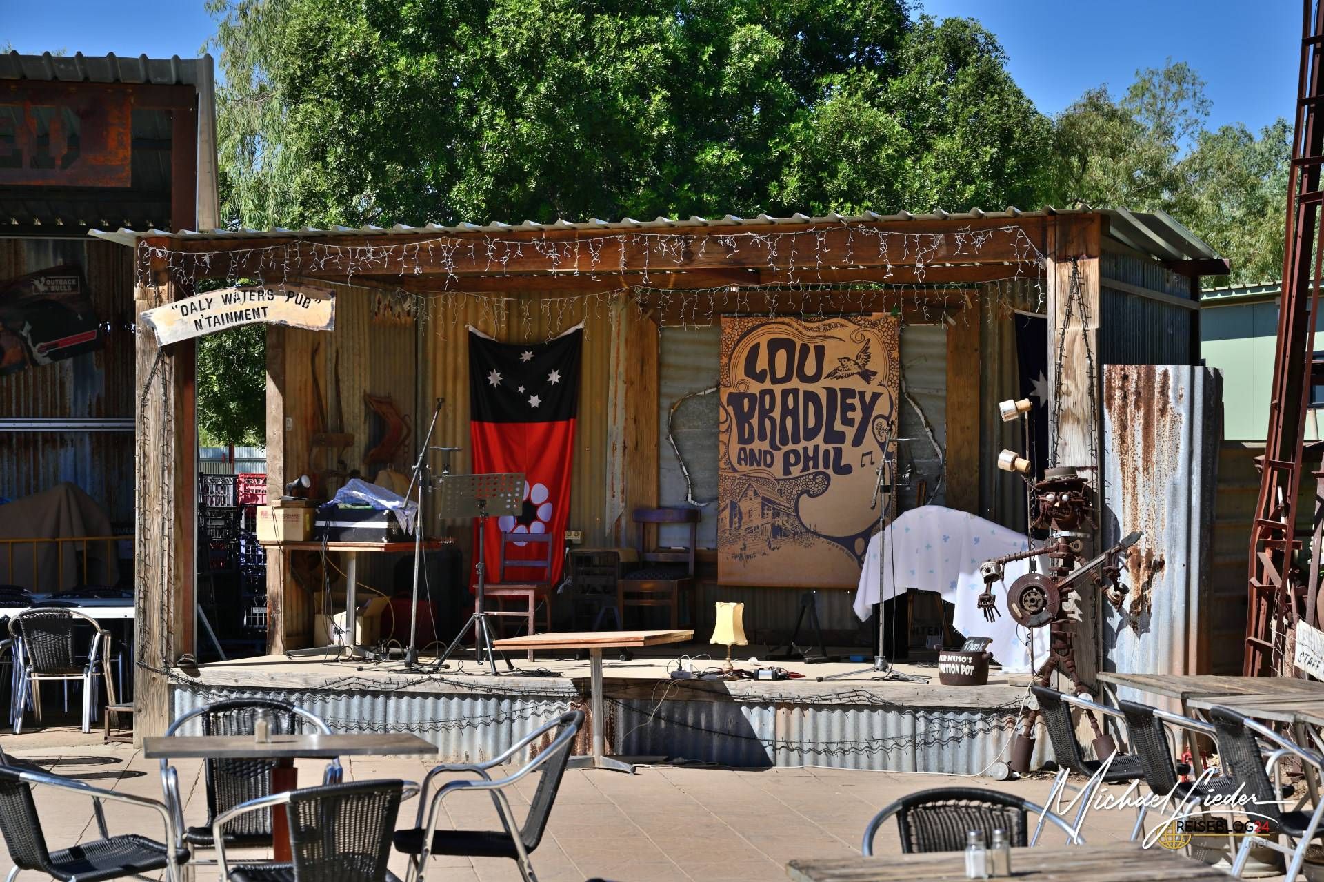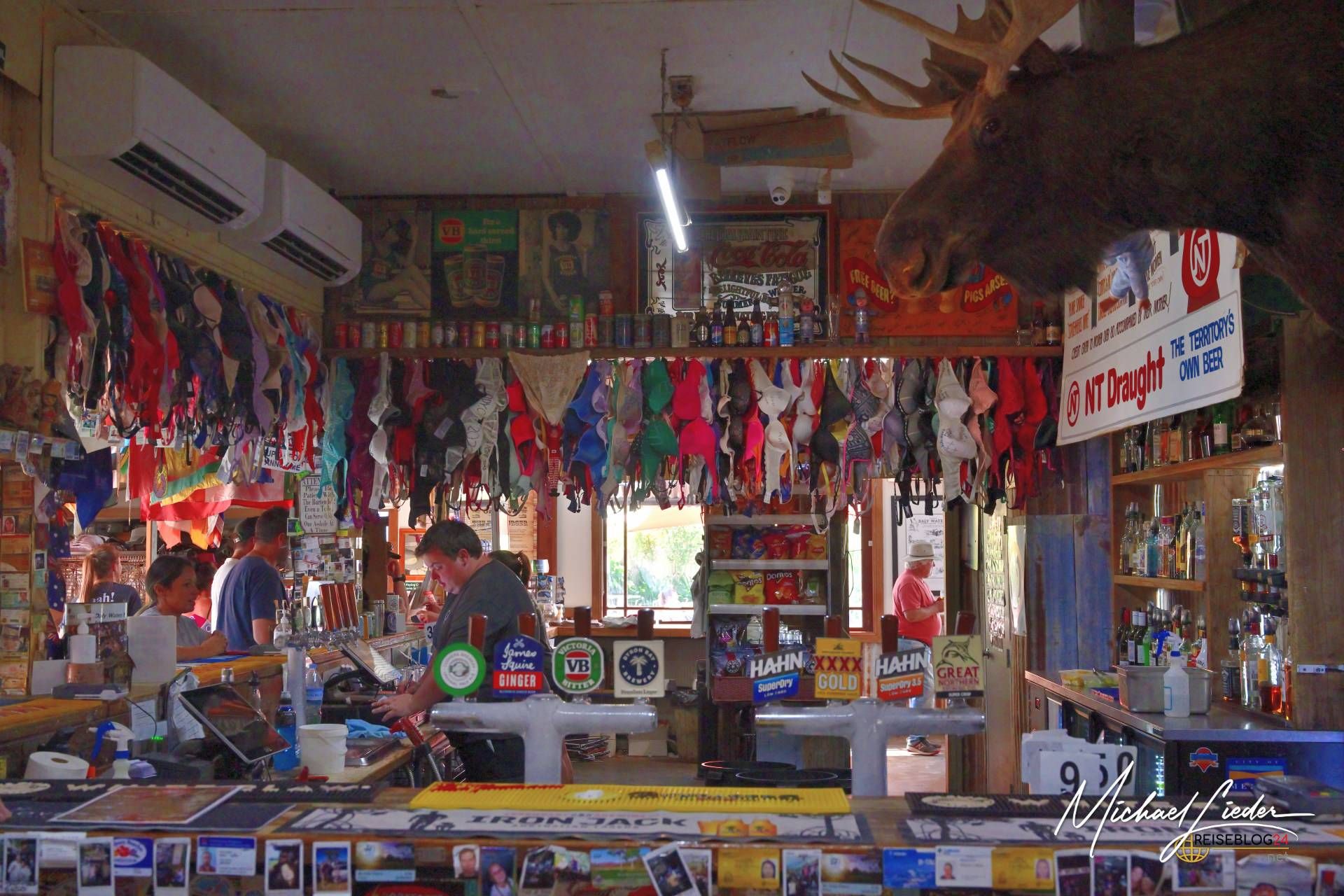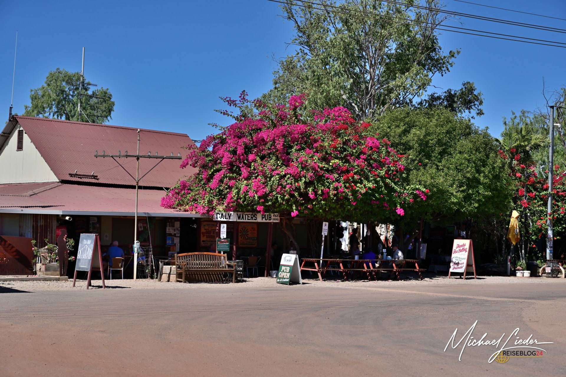 Daly Waters im Northern Territory – schon der Name klingt nach Pub, Patina, staubigen Geschichten und dieser Sorte Abenteuer, die nicht geschniegelt daherkommt. Hier draußen ist nichts geschniegelt. Hier ist Hitze ehrlich, der Horizont endlos und der Humor trocken wie der Boden unter den Boots. Zwischen alten Telegraphenstationen, flatternden BHs im Pub und Fliegen mit Durchhaltevermögen zeigt das Outback seine ungefilterte Seite. Daly Waters ist kein Ort, der beeindrucken will – er tut es einfach. Leise, rau, ein bisschen schräg. Und genau deshalb war es eine nice Location die wir besucht haben.